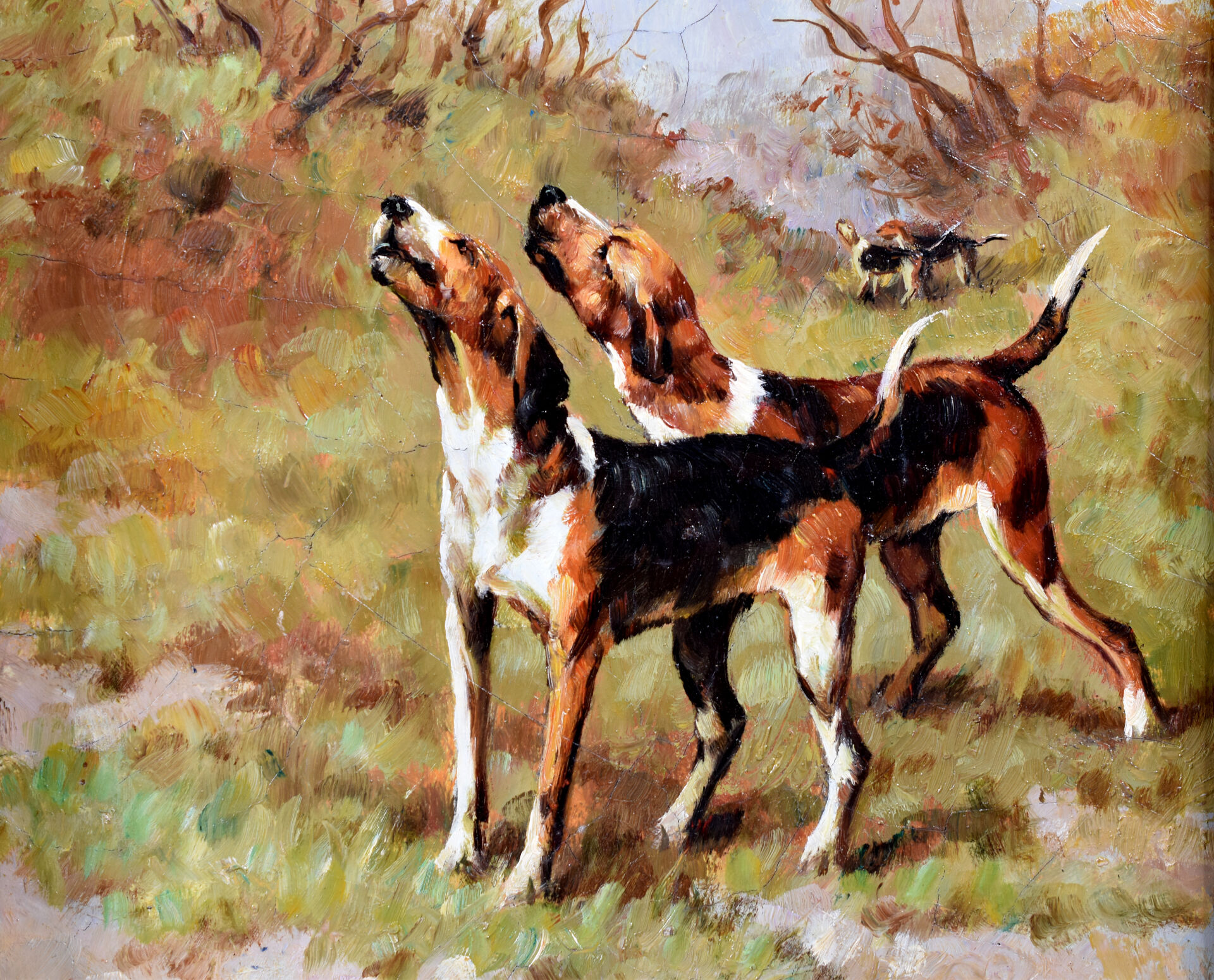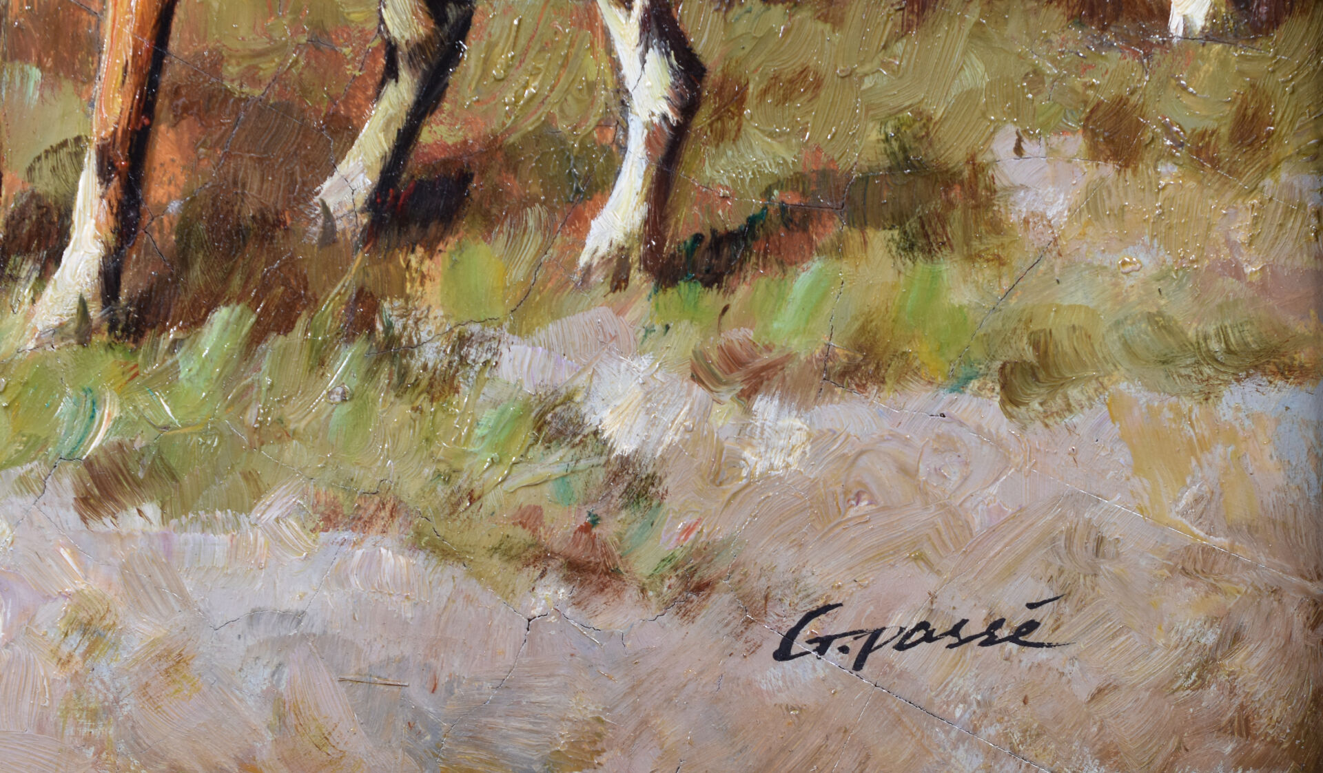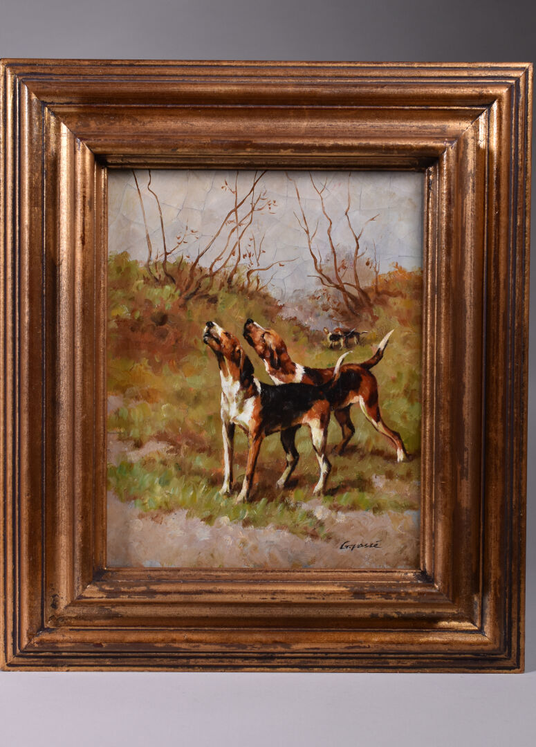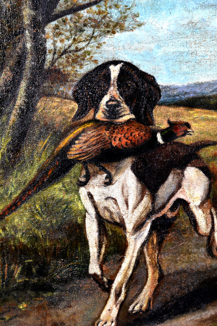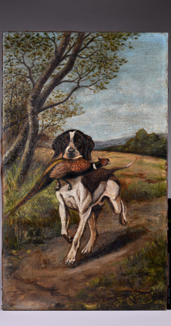 G. PASSE (XXe siècle). Deux setters à l’arrêt. Huile sur panneau signée en bas à droite. 26 x 20 cm. On joint : Charles B. Setter tenant un faisant dans sa gueule. Huile sur toile signée en bas à droite. 76 x 45 cm.