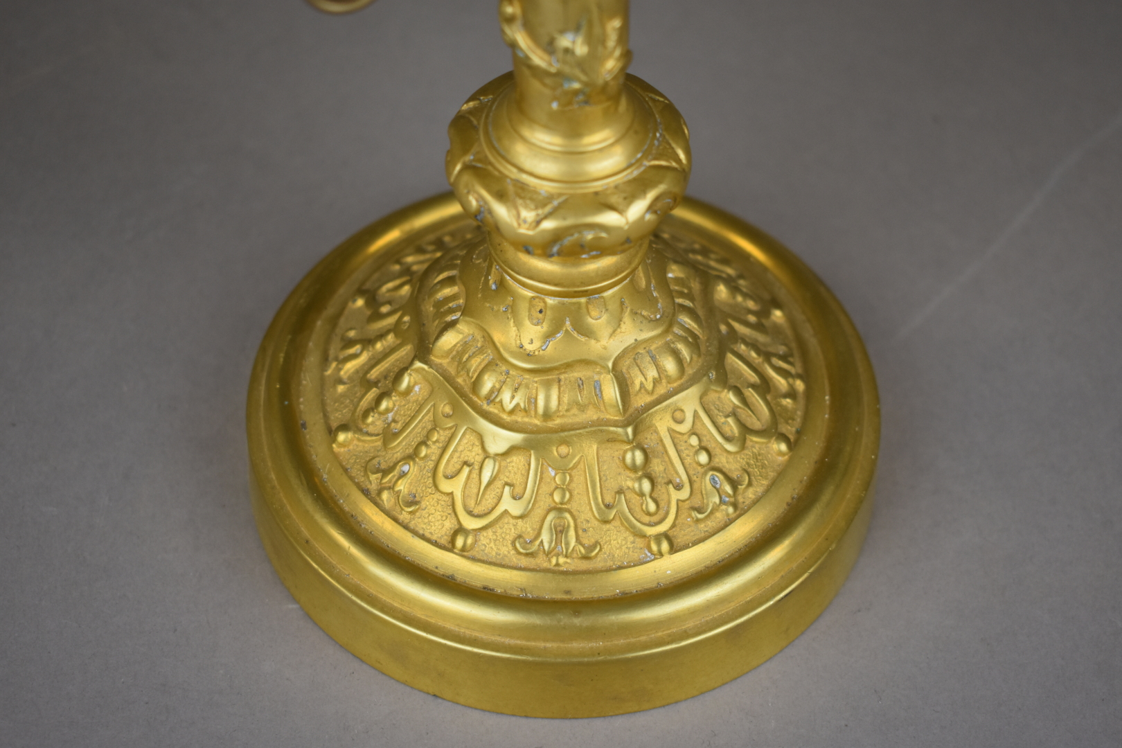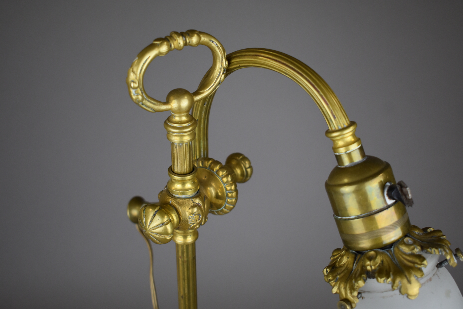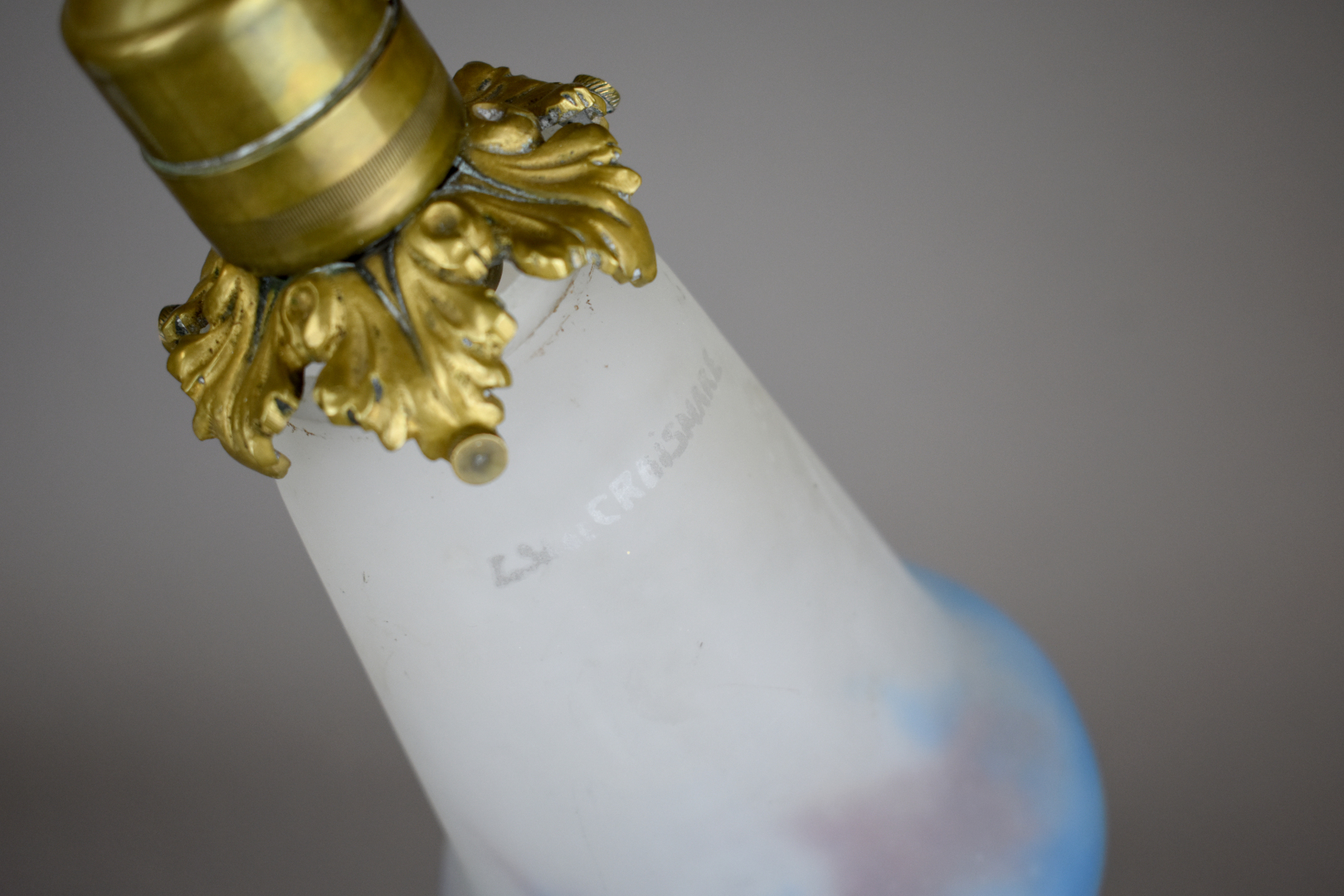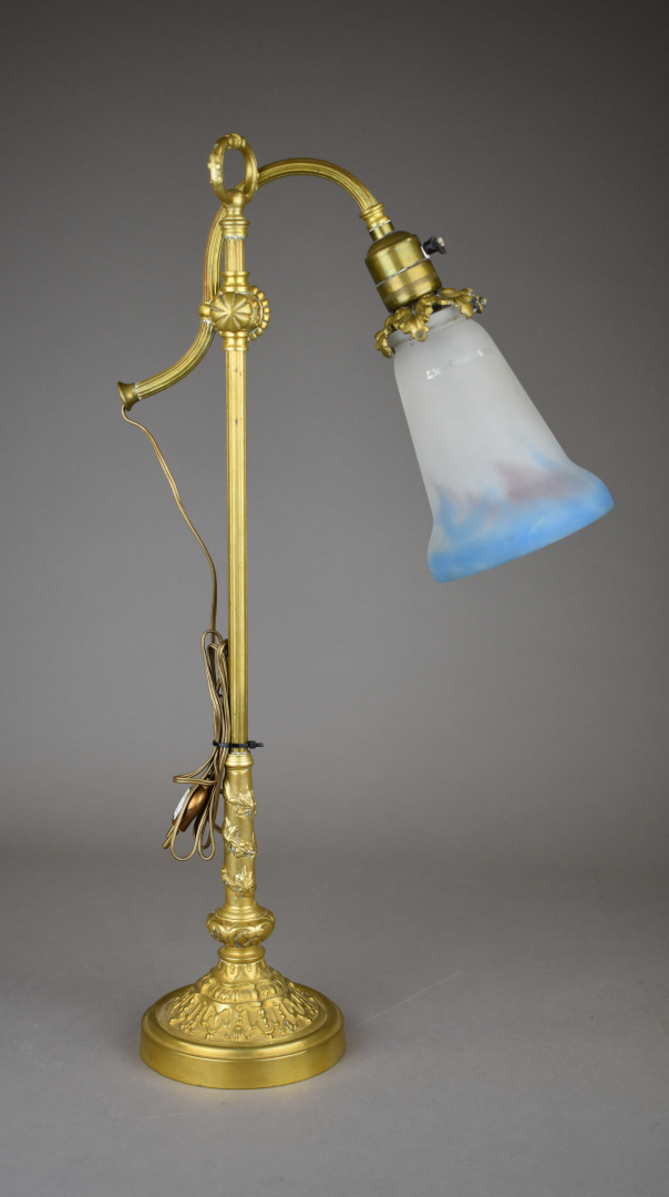 G. V. DE CROISMARRE. Lampe à poser en bronze ciselé doré à hauteur de lumière ajustable. La tulipe en verre marmoréen blanc et bleu. Signée. 56,5 cm.