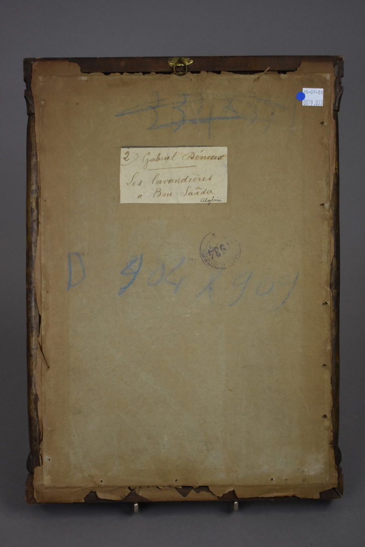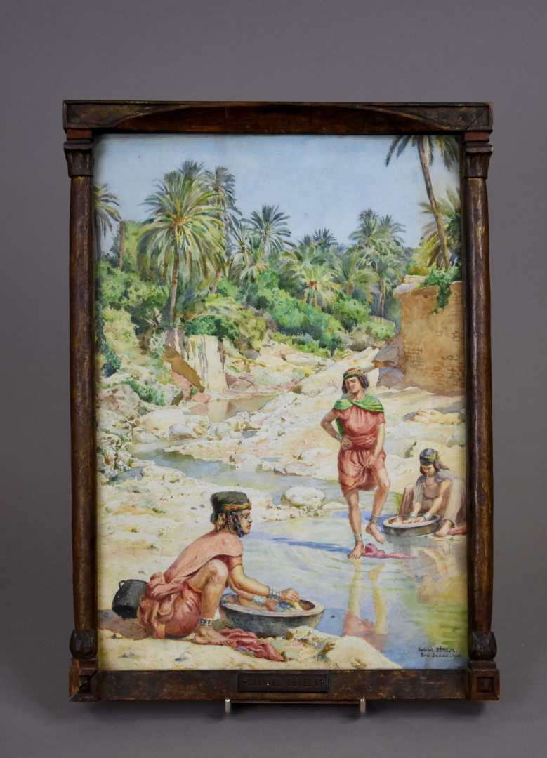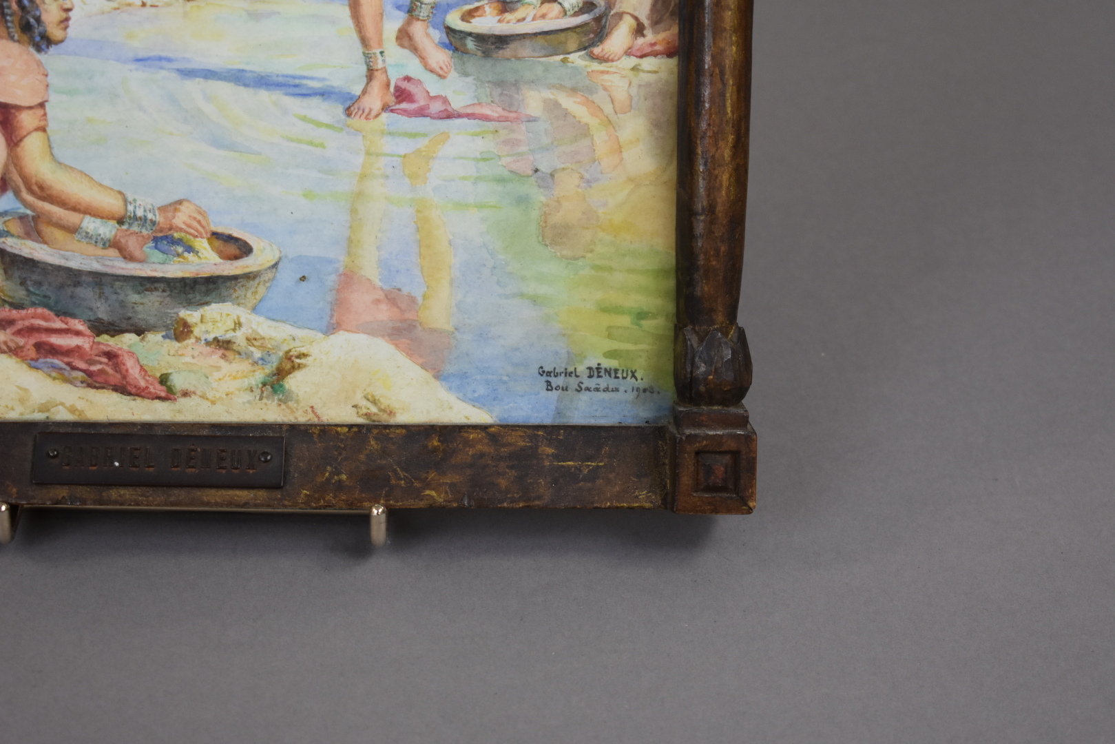 Gabriel Charles DENEUX (1856-1926). «Les lavandières à Bou Saada. Algérie». Dessin à l’aquarelle signé, situé et daté 1908 en bas à droite. Cadre en bois sculpté (traces de polychromie). 42 x 30,2 cm.