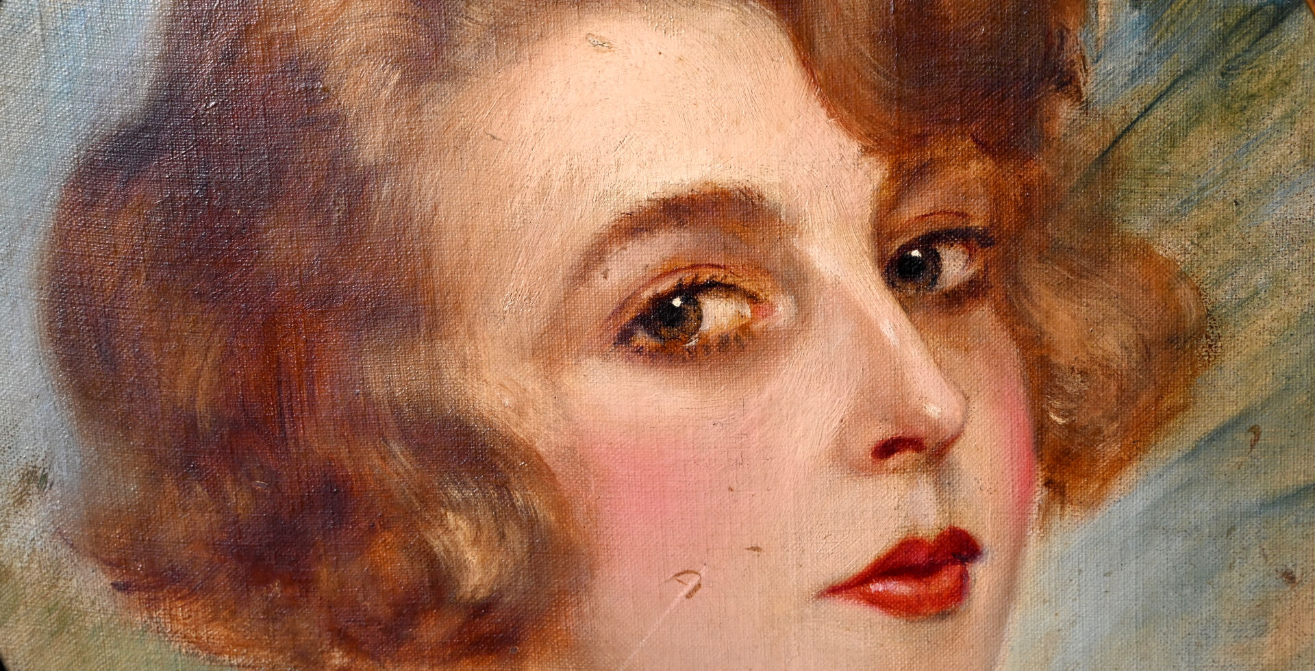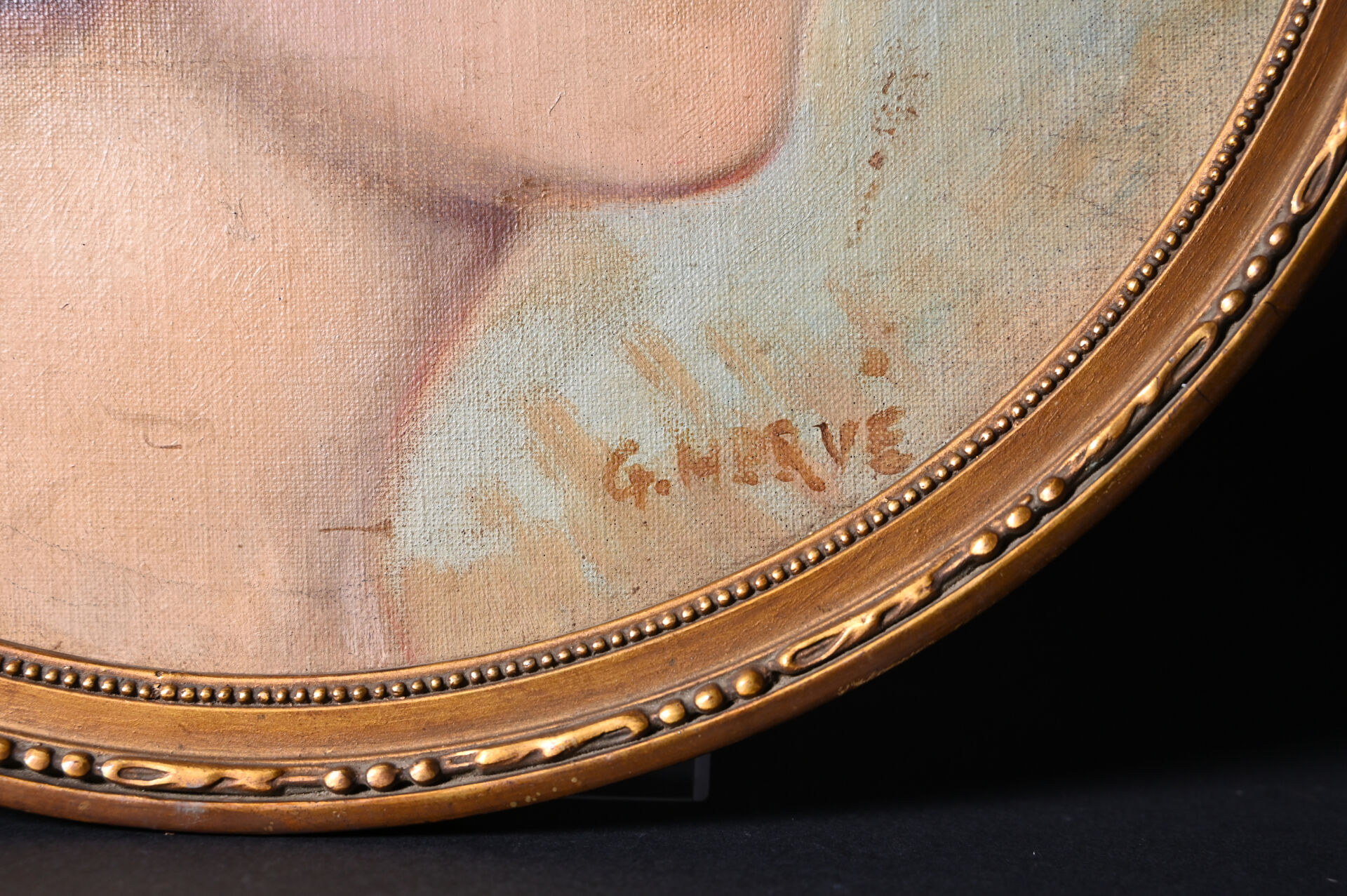 Gabriel HERVE (1868-?). Portrait de femme blonde. Huile sur toile marouflée sur carton à vue ronde, signée en bas à droite (griffure). Diam. : 30 cm à vue.