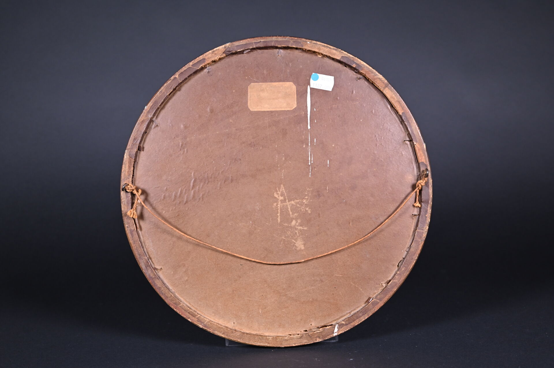 Huile sur toile marouflée sur carton à vue ronde, signée en bas à droite (griffure).