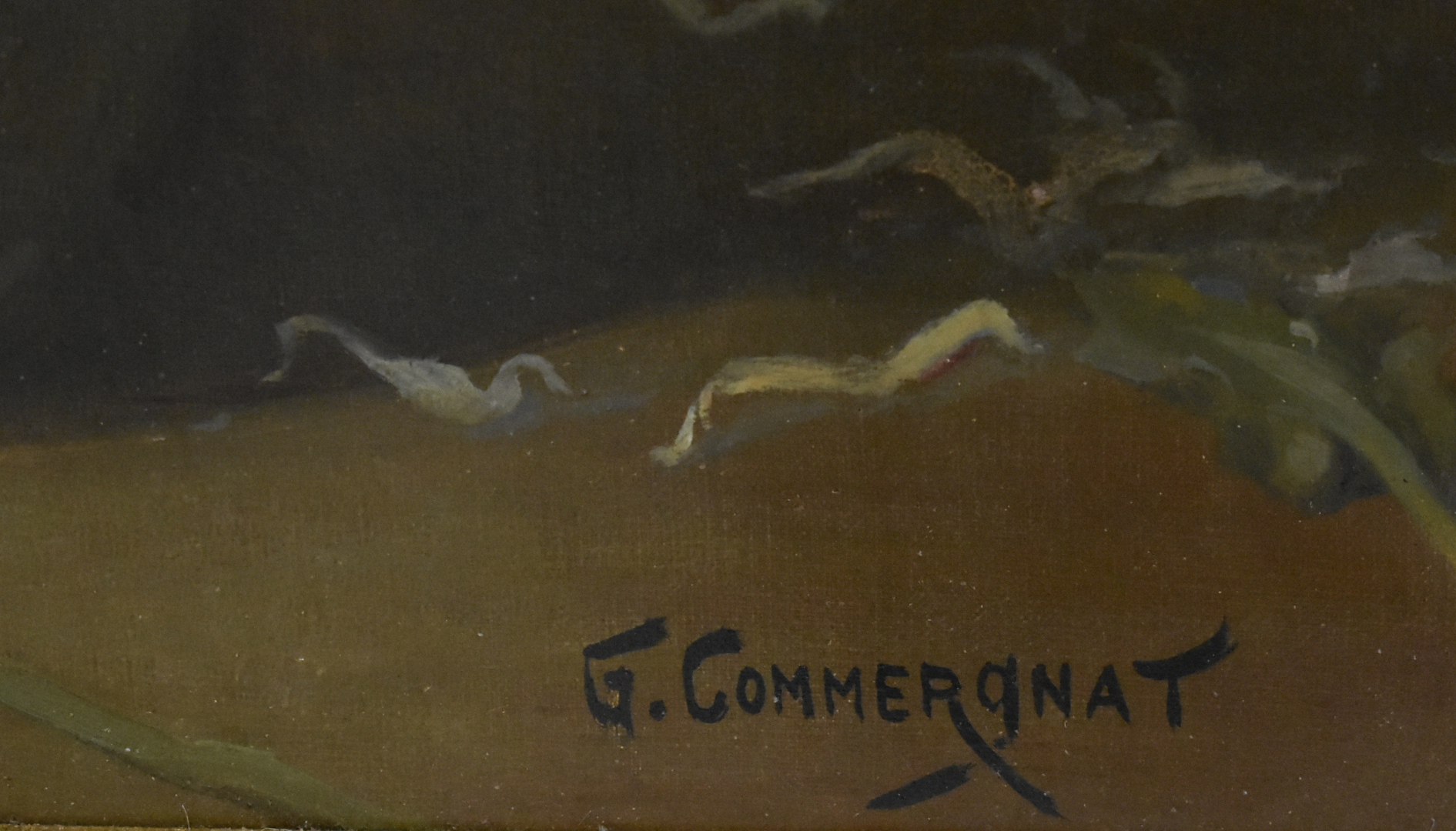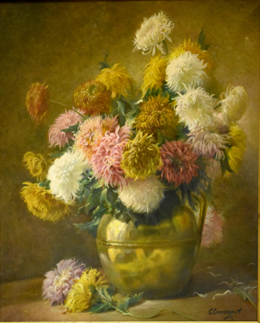 Gaëtan Jean COMMERGNAT (XXe siècle). Bouquet de chrysanthèmes japonais. Huile sur toile signée en bas en droite (un enfoncement et des restaurations). 100 x 81,5 cm.