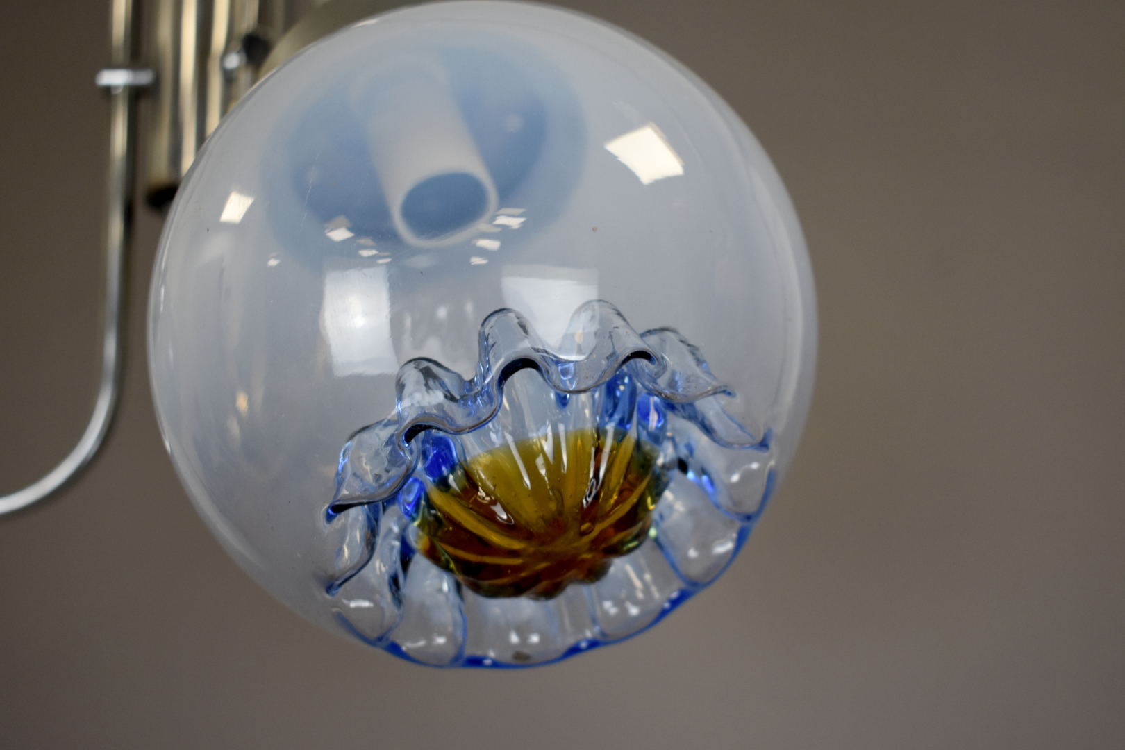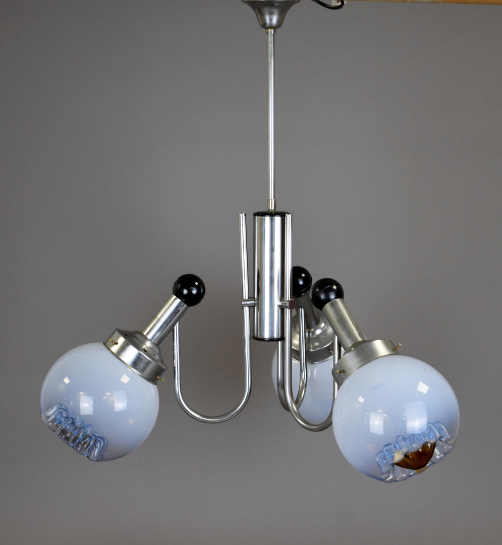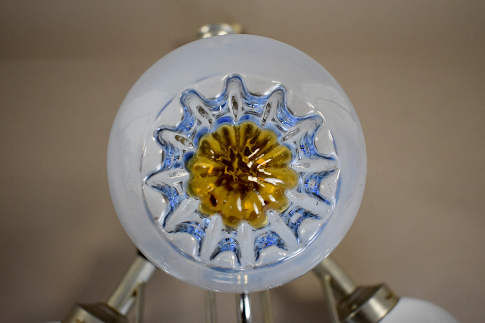 Gaetano SCIOLARI (1927 – 1994) ? MAZZEGA à Murano. Lustre à trois bras de lumière en métal chromé et globes de verre opalescent et ambré. Vers 1970. Haut. : 61 cm.