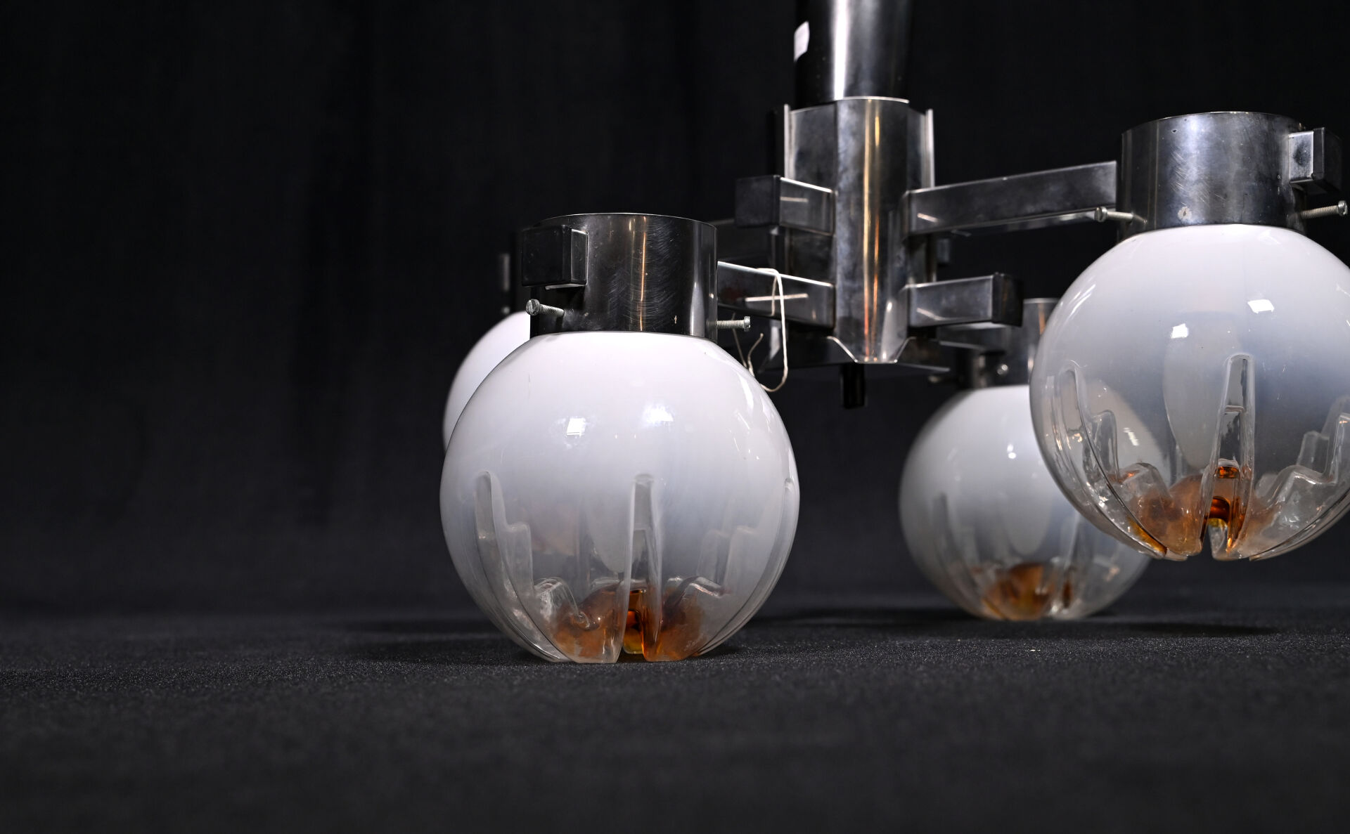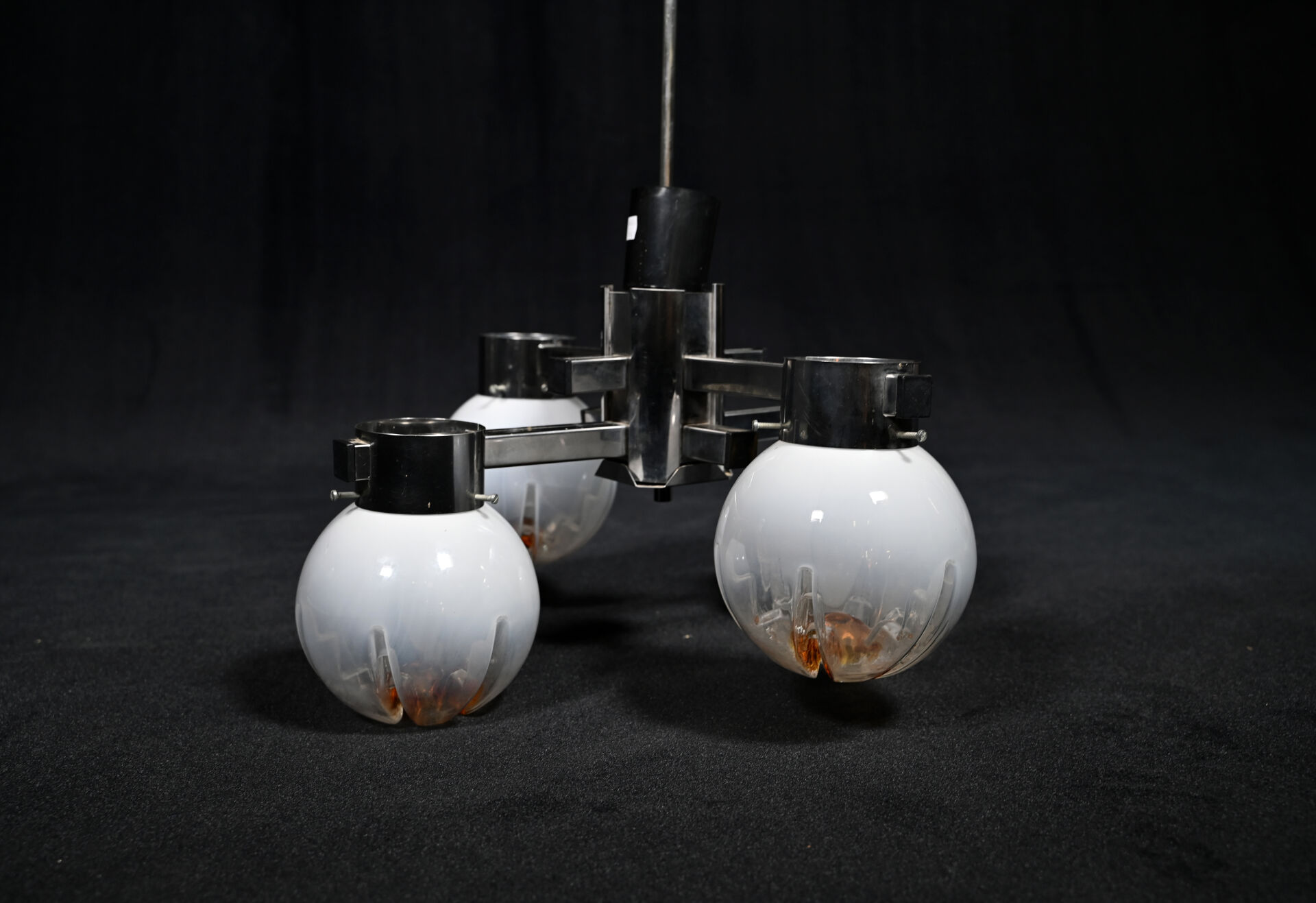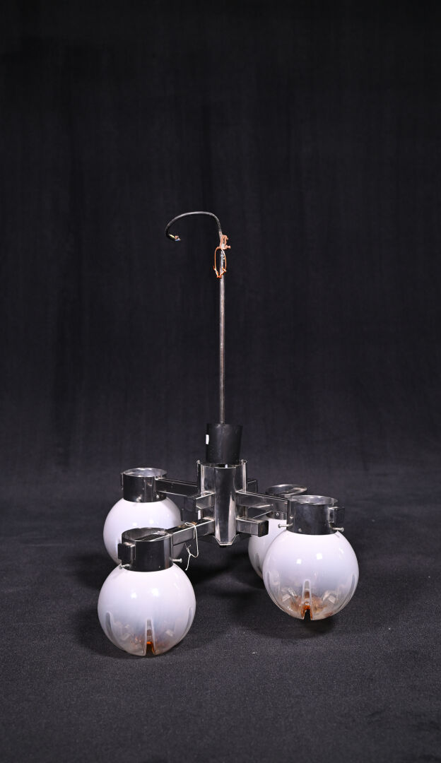 Gaetano SCIOLARI (1927-1994) MAZZEGA ? à Murano. Suspension à 4 lumières en métal chromé et sphères de verre partiellement opalescent et ambré. Vers 1970. Haut. : 72,5 cm.