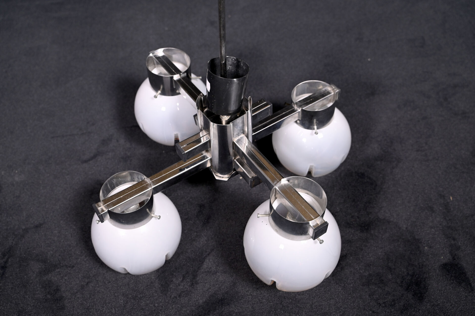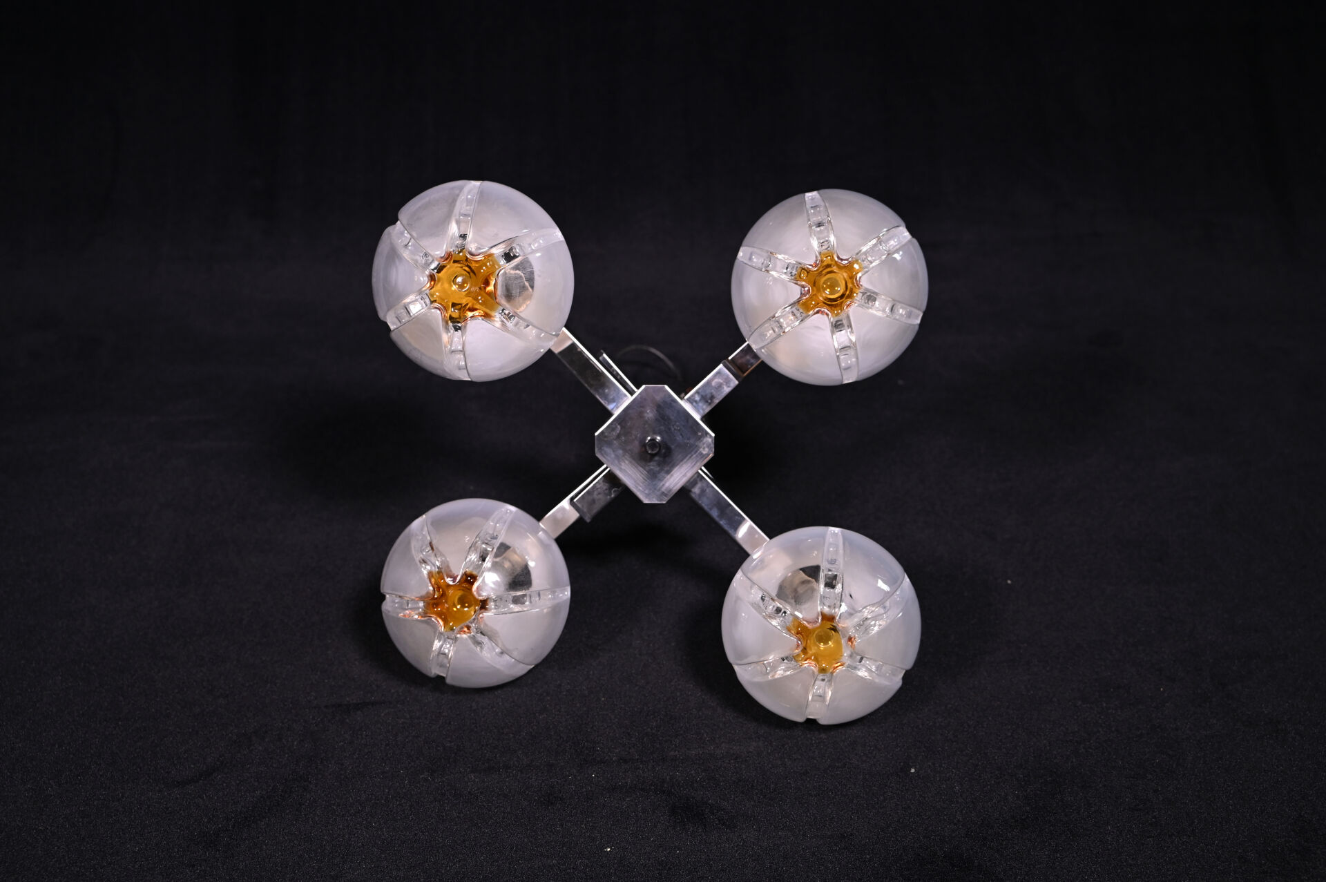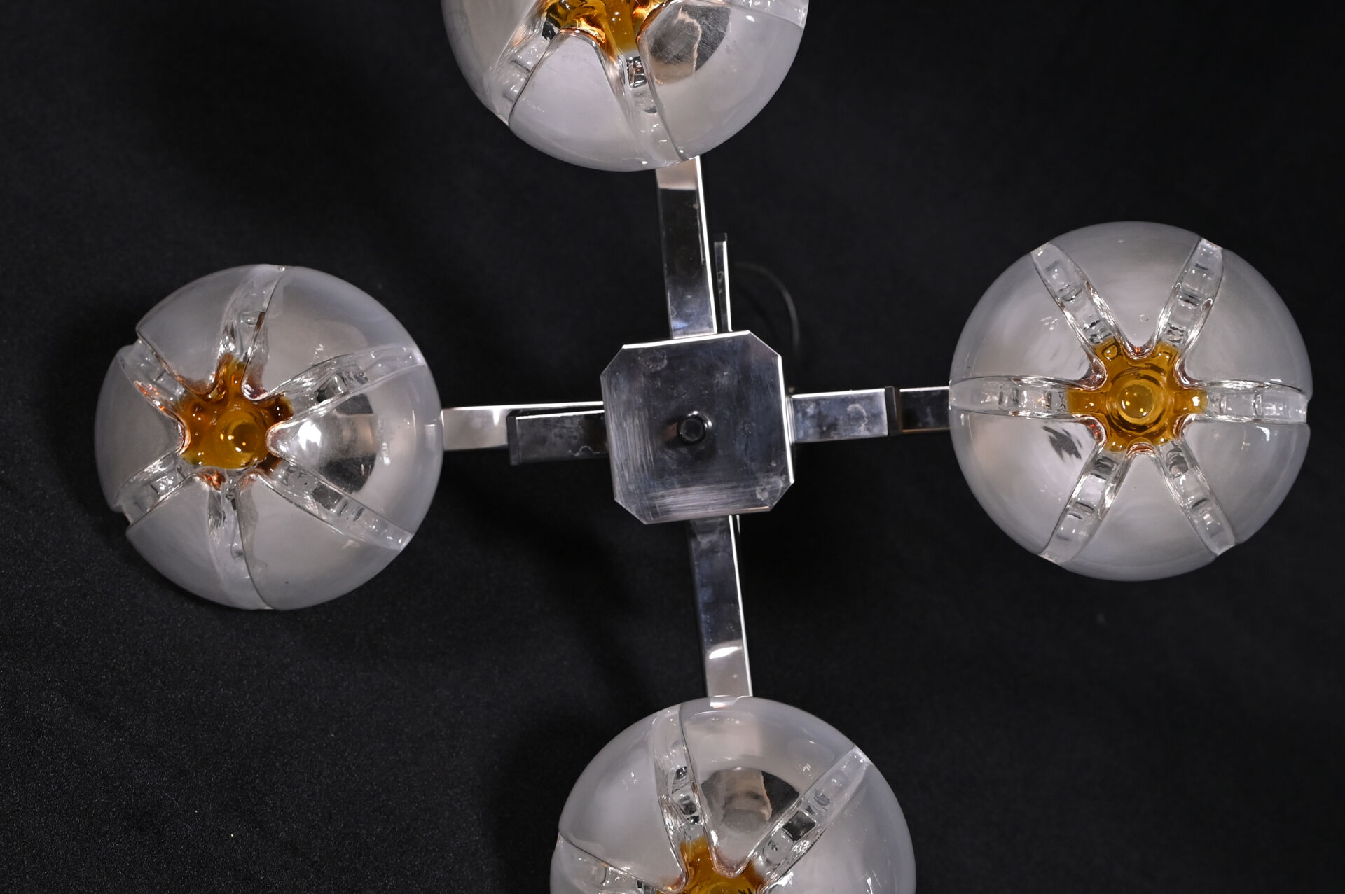 Gaetano SCIOLARI (1927-1994) MAZZEGA ? à Murano. Suspension à 4 lumières en métal chromé et sphères de verre partiellement opalescent et ambré. Vers 1970. Haut. : 72,5 cm.