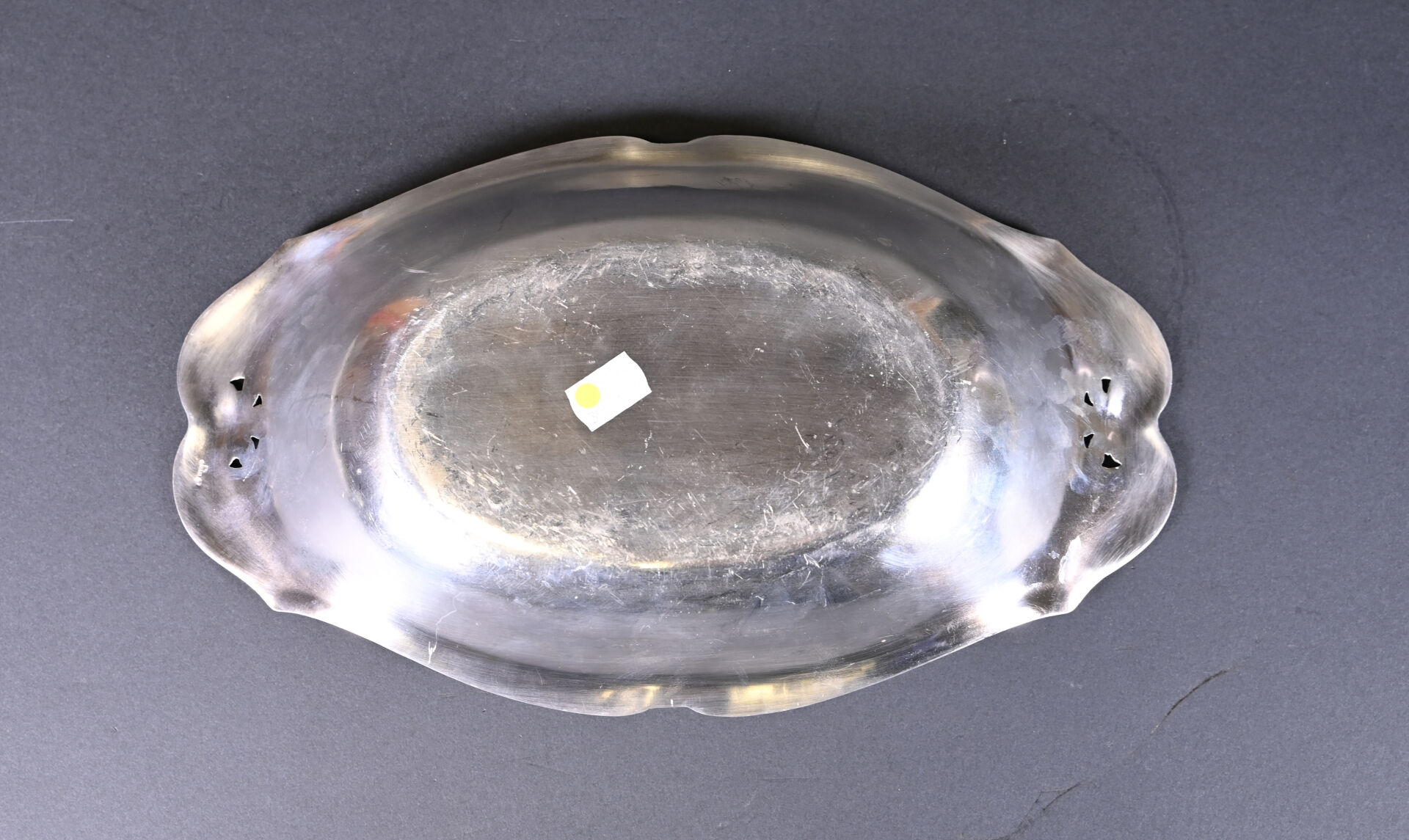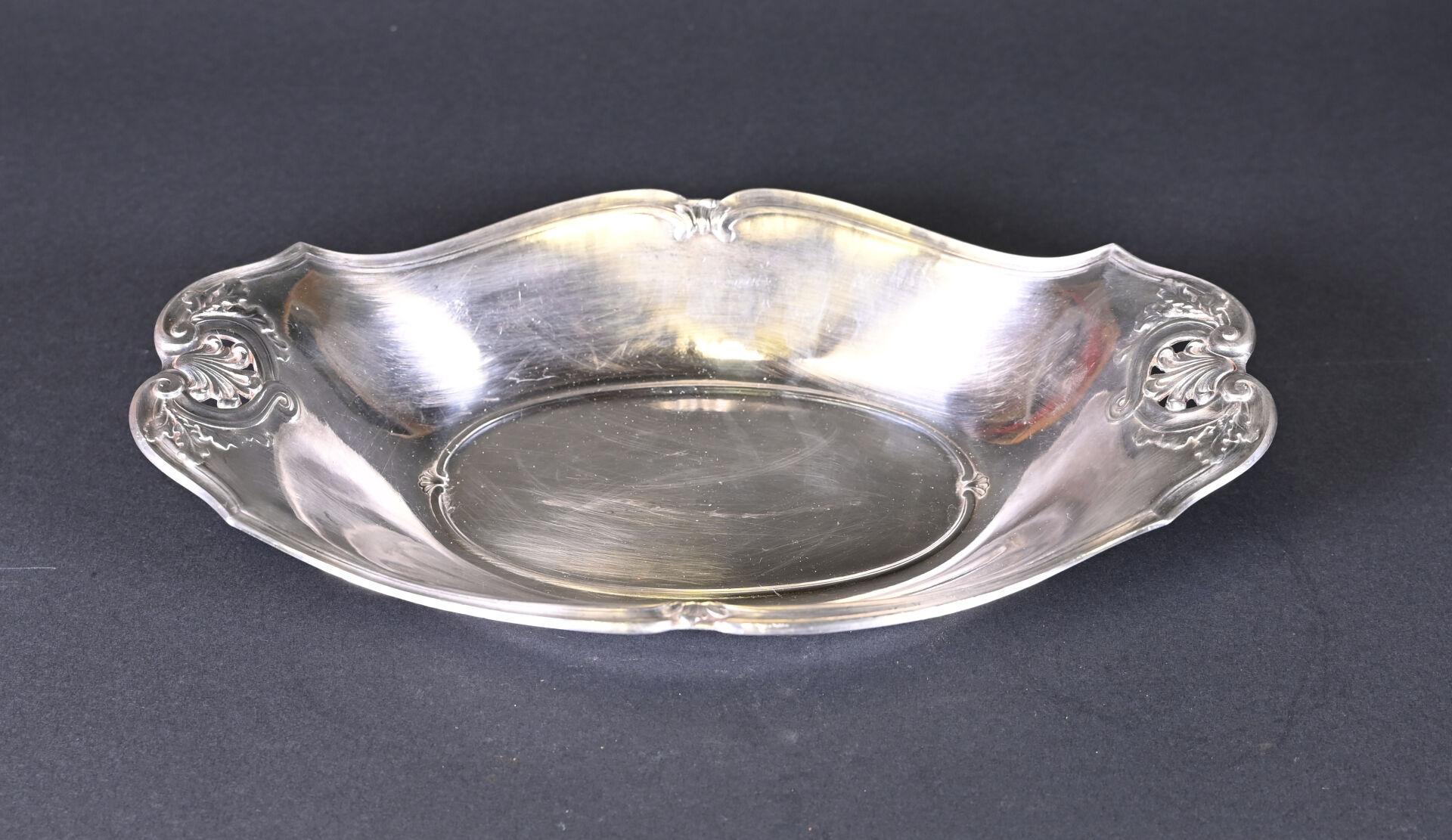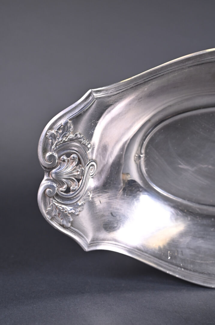 GALLIA. Plat creux oblong en métal argenté à décor de palmettes. Marquée au dessous. 36 x 21 cm.