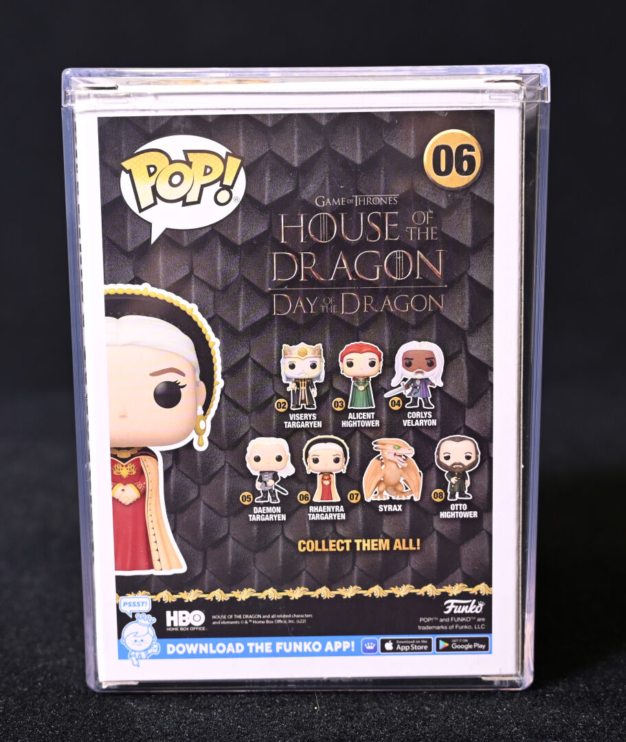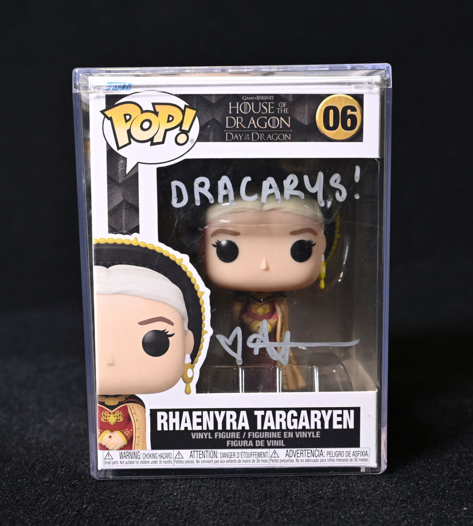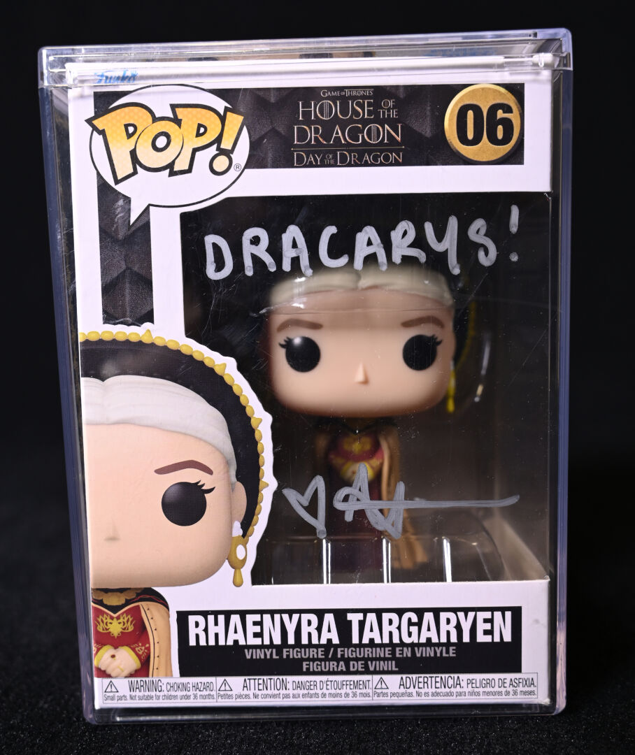 GAME OF THRONES HOUSE OF THE DRAGON. Figurine « POP ! » de Rhaenyra Targaryen dans une boite rigide POP ! et dédicacée par l’actrice Milly Alcock. Haut. : 17 cm.