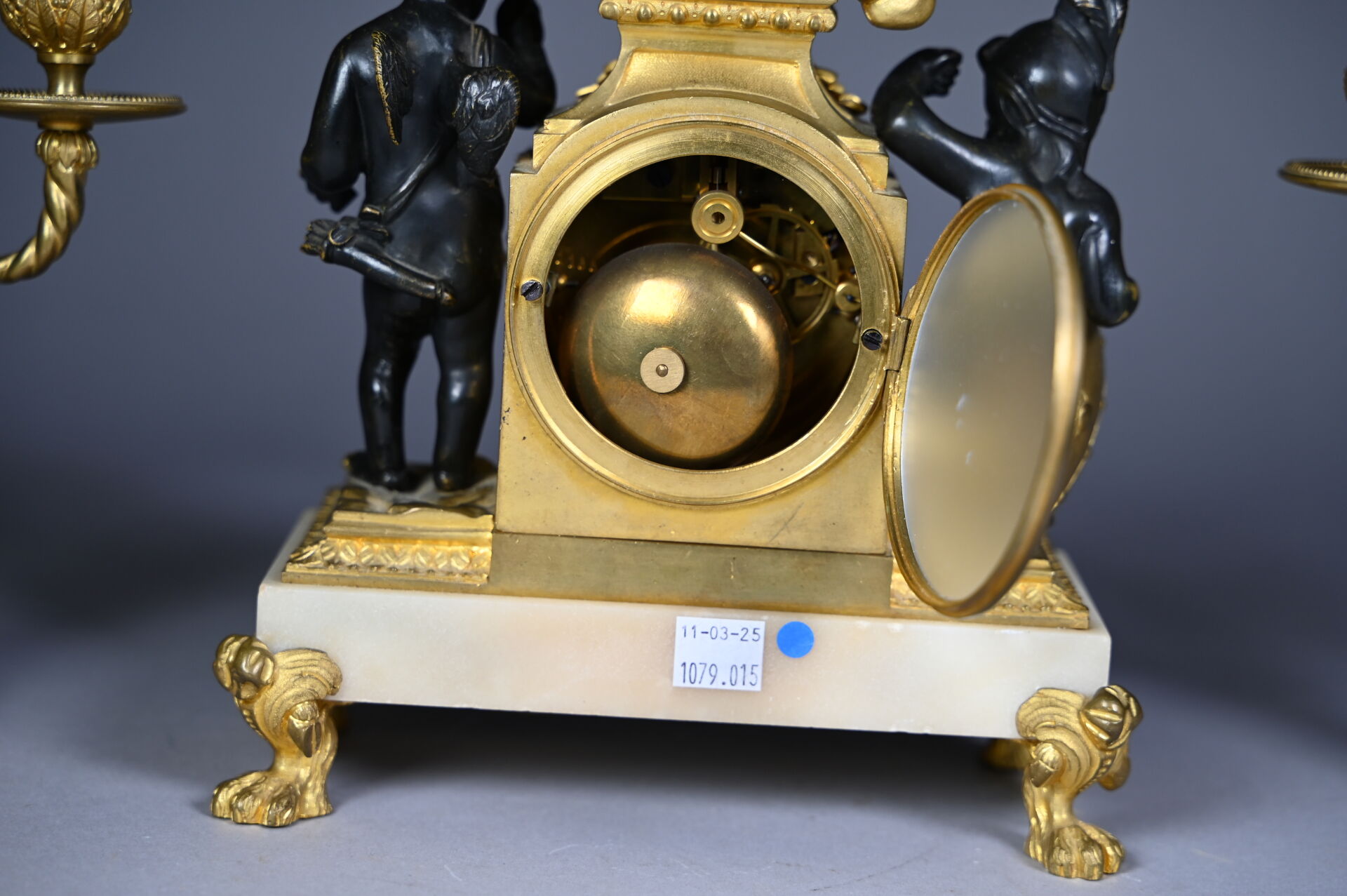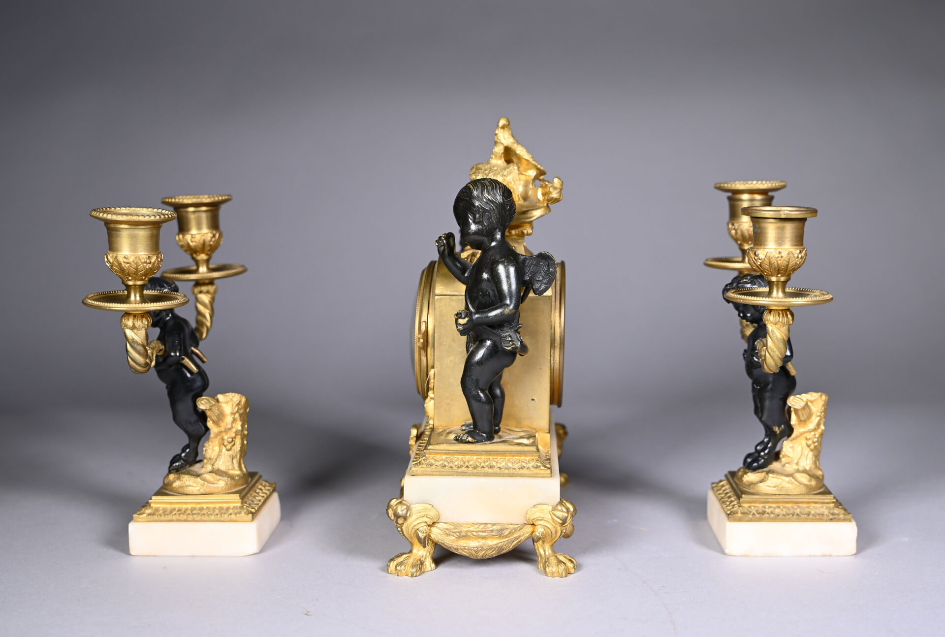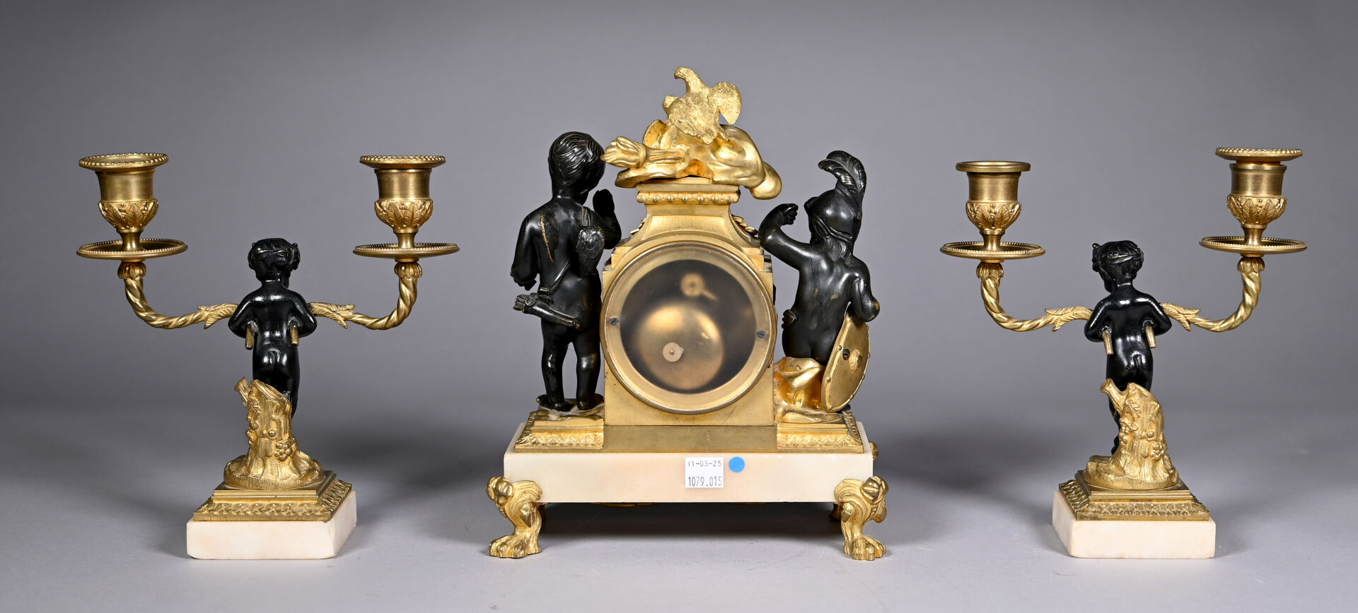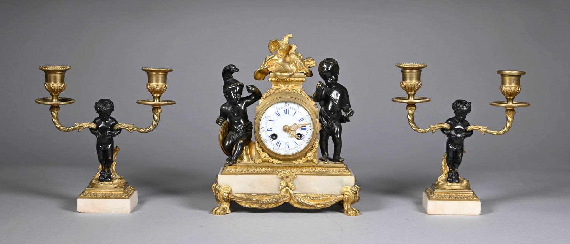 Garniture de cheminée en bronze ciselé, doré, patiné brun et albâtre à décor de putto, cupidon et faunes. La pendule ornée d’un couple de colombes. Le cadran émaillé de chiffres romains pour les heures, chemin de fer et arabes pour les minutes en bleu et noir sur fond blanc. Les bougeoirs à deux bras de lumière. Usures, petits manques et restaurations. Fin du XIXe siècle. Pendule : Haut. : 27 cm – Larg. : 21 cm – Prof. : 10,5 cm.