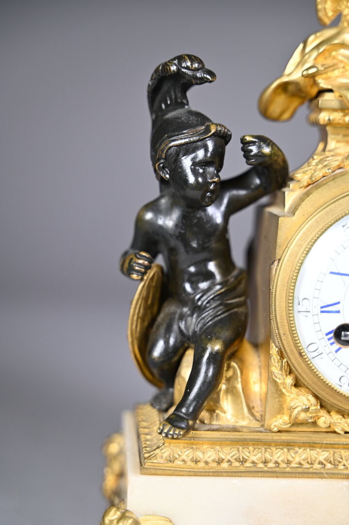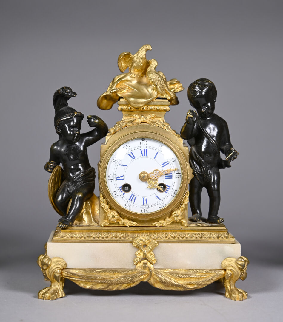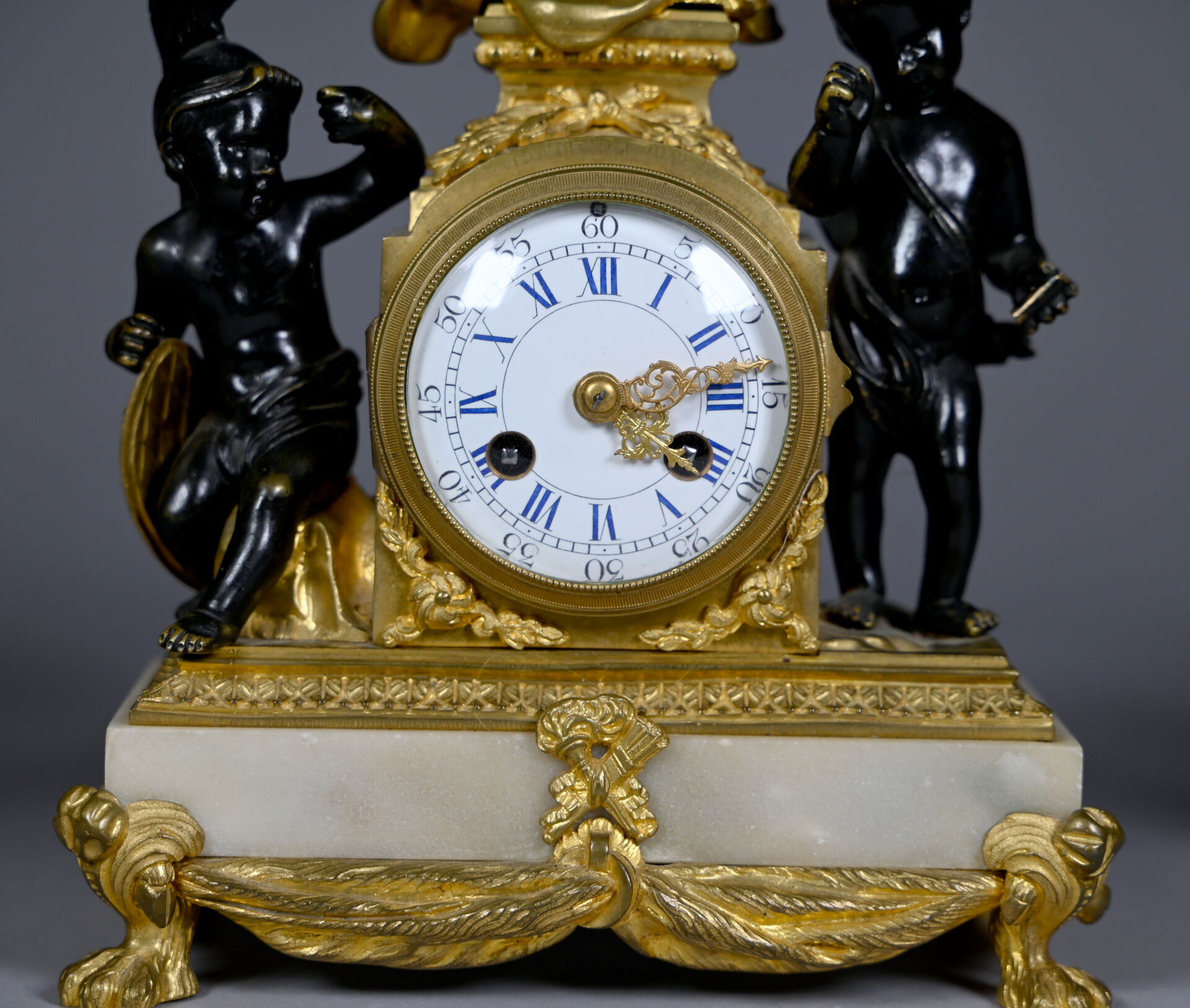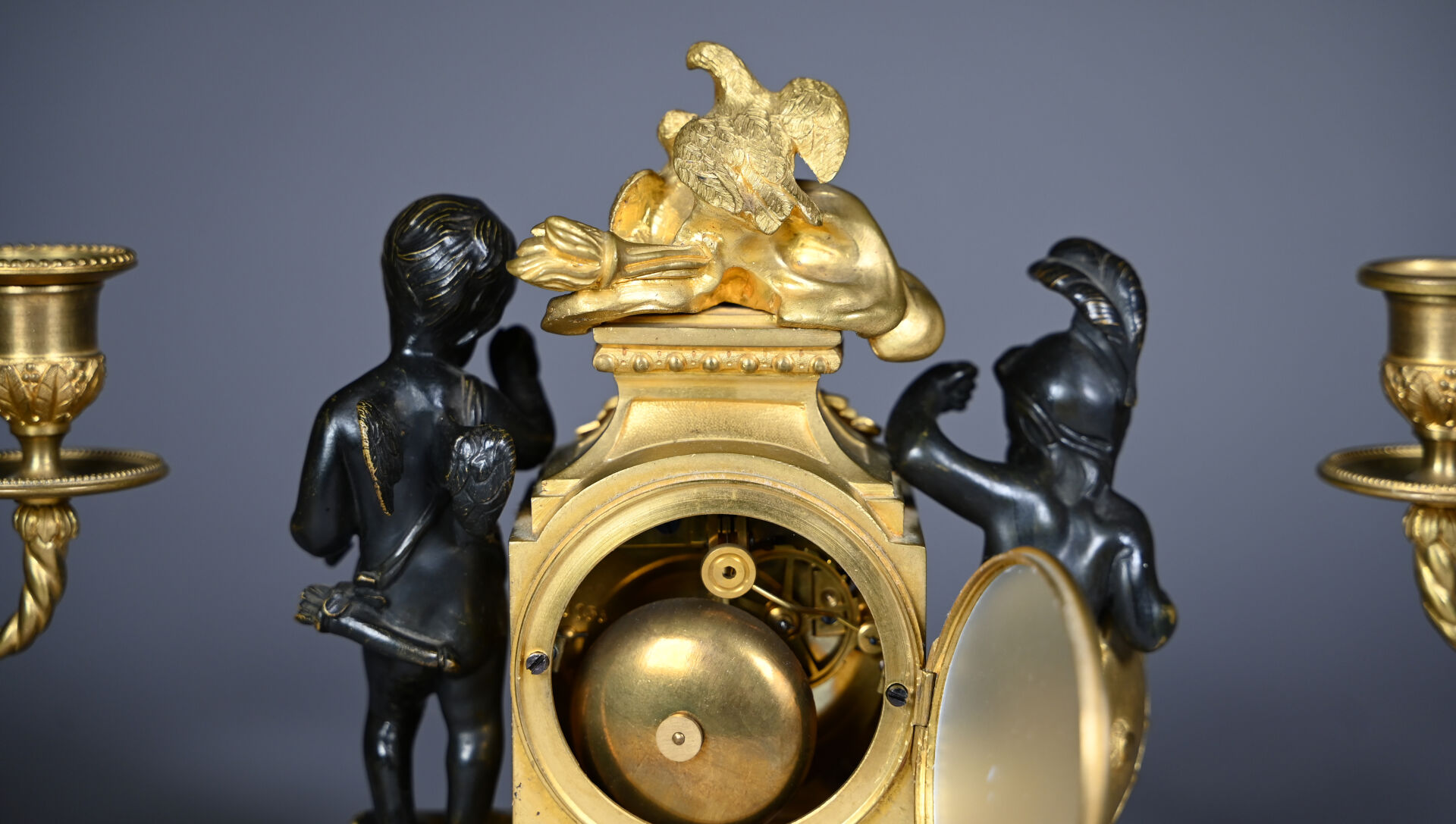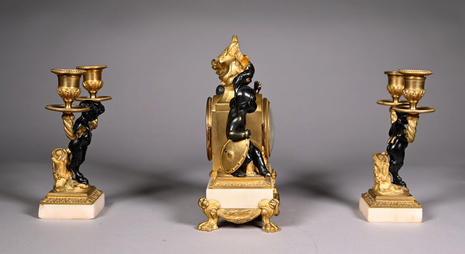 Garniture de cheminée en bronze ciselé, doré, patiné brun et albâtre à décor de putto, cupidon et faunes. La pendule ornée d’un couple de colombes. Le cadran émaillé de chiffres romains pour les heures, chemin de fer et arabes pour les minutes en bleu et noir sur fond blanc. Les bougeoirs à deux bras de lumière. Usures, petits manques et restaurations. Fin du XIXe siècle. Pendule : Haut. : 27 cm – Larg. : 21 cm – Prof. : 10,5 cm.