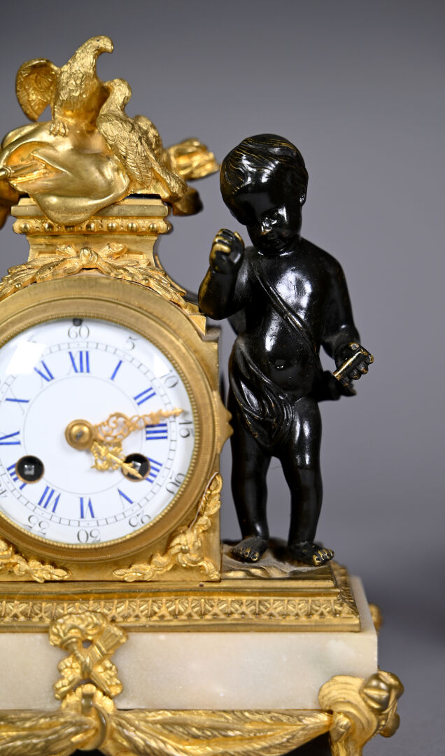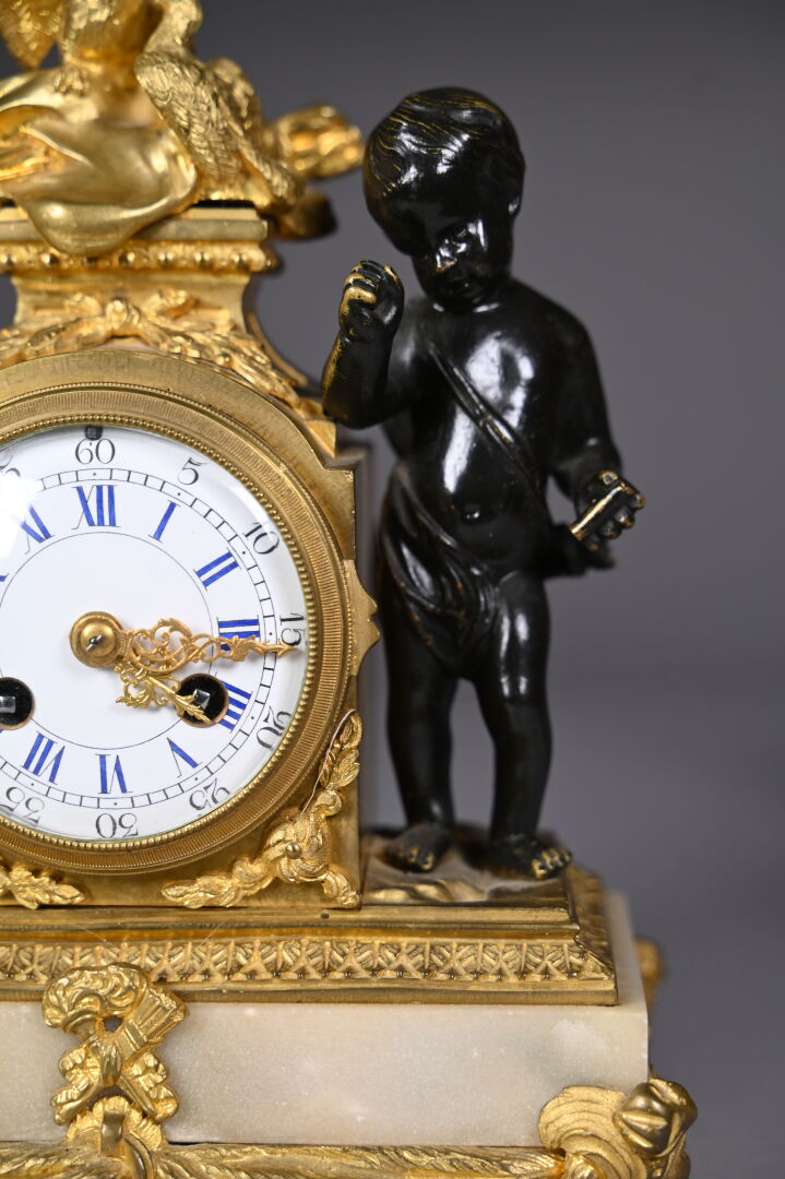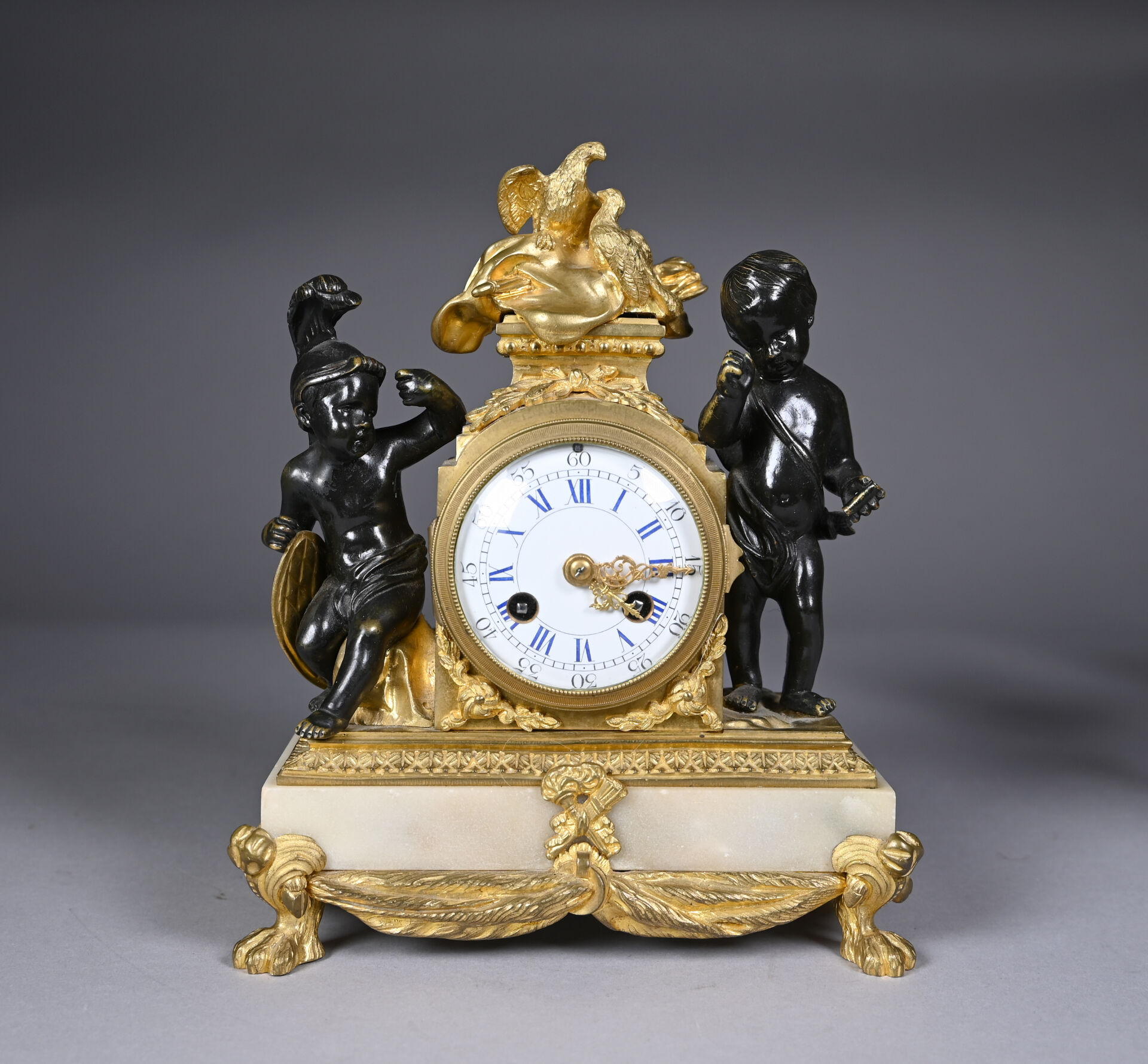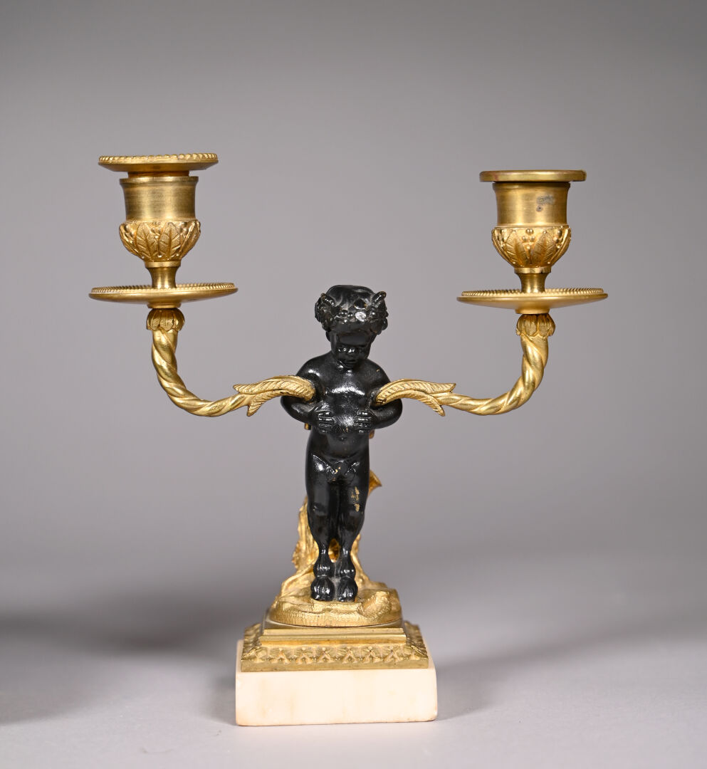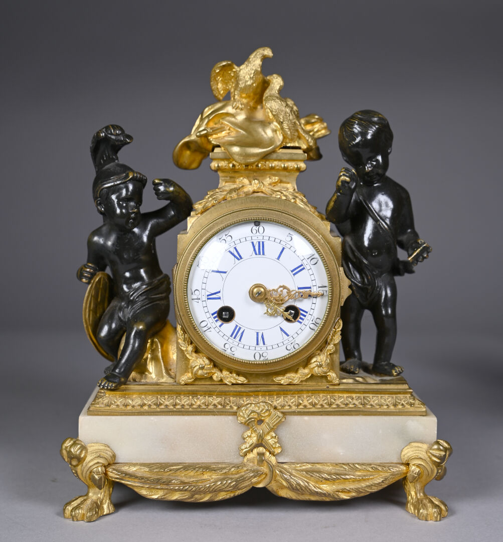 Garniture de cheminée en bronze ciselé, doré, patiné brun et albâtre à décor de putto, cupidon et faunes. La pendule ornée d’un couple de colombes. Le cadran émaillé de chiffres romains pour les heures, chemin de fer et arabes pour les minutes en bleu et noir sur fond blanc. Les bougeoirs à deux bras de lumière. Usures, petits manques et restaurations. Fin du XIXe siècle. Pendule : Haut. : 27 cm – Larg. : 21 cm – Prof. : 10,5 cm.