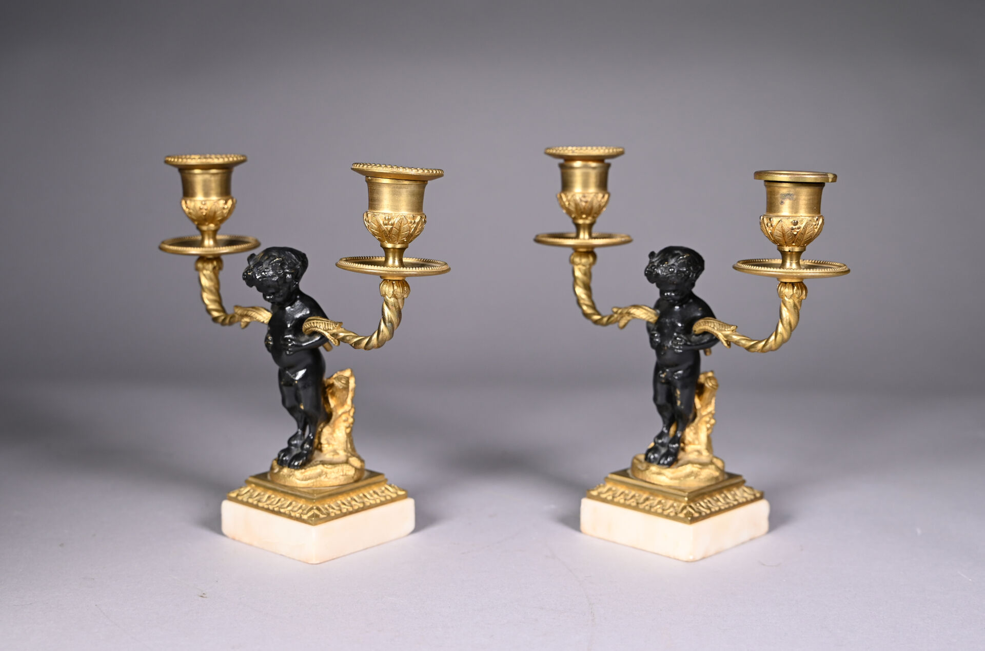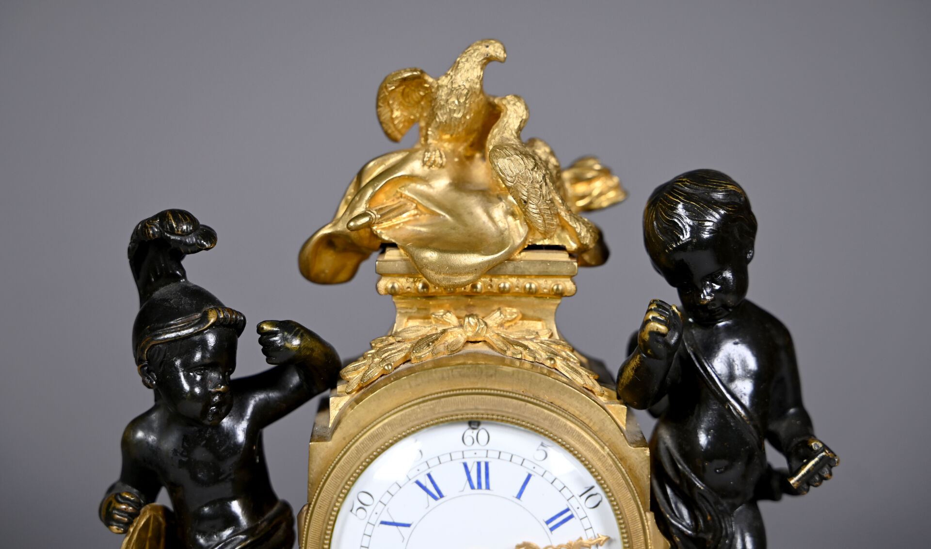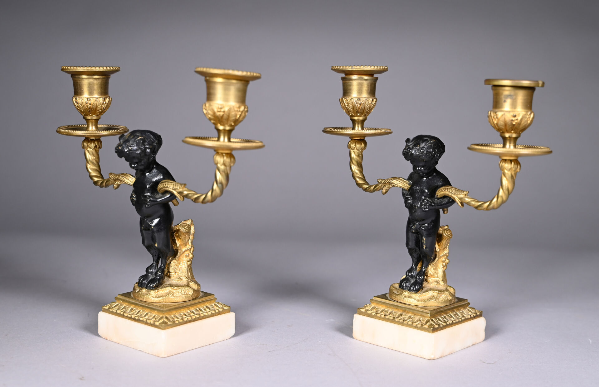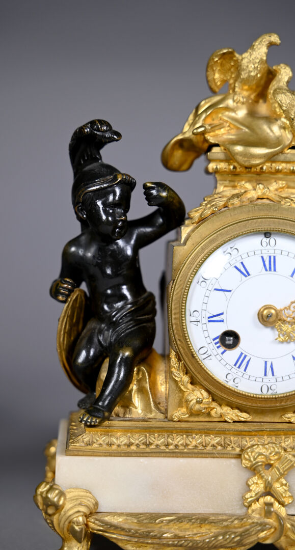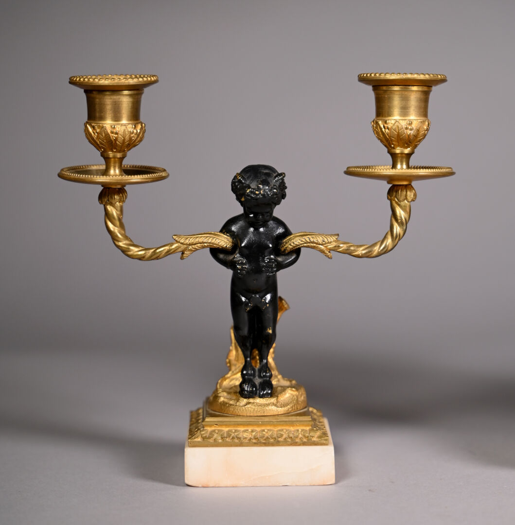 Garniture de cheminée en bronze ciselé, doré, patiné brun et albâtre à décor de putto, cupidon et faunes. La pendule ornée d’un couple de colombes. Le cadran émaillé de chiffres romains pour les heures, chemin de fer et arabes pour les minutes en bleu et noir sur fond blanc. Les bougeoirs à deux bras de lumière. Usures, petits manques et restaurations. Fin du XIXe siècle. Pendule : Haut. : 27 cm – Larg. : 21 cm – Prof. : 10,5 cm.