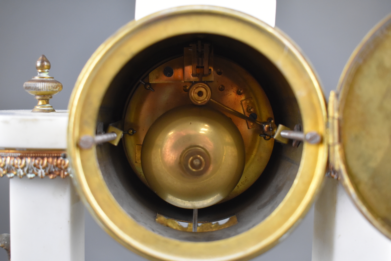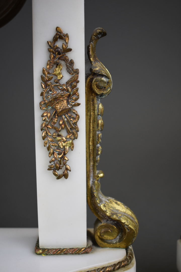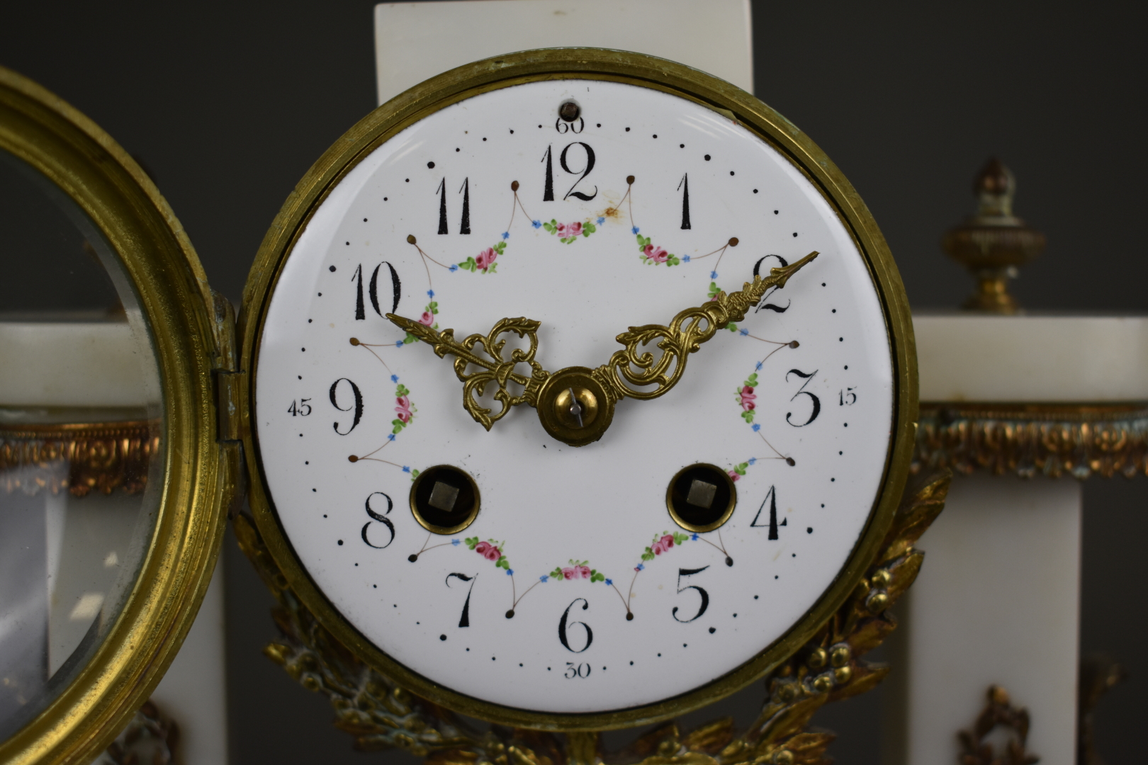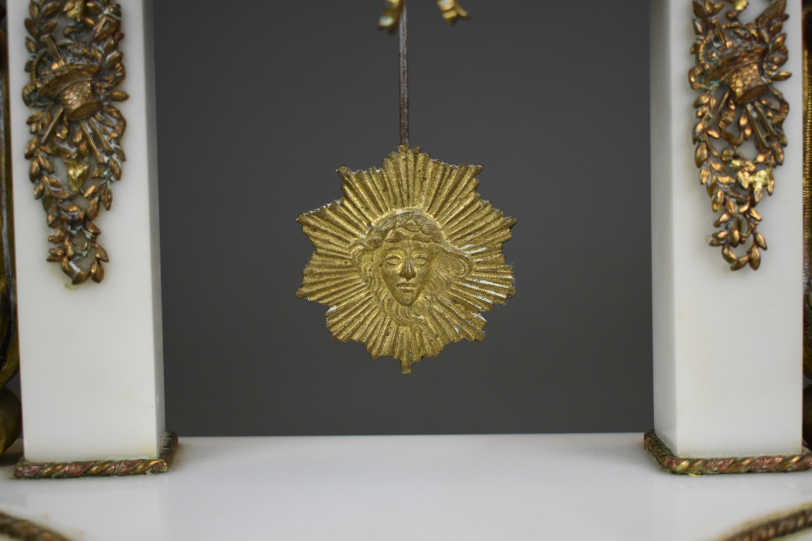 Garniture de cheminée en marbre blanc, bronze et laiton comprenant une pendule portique surmontée d’un pot à feu, le cadran émaillé à chiffres arabes pour les heures et une paire de flambeaux à quatre lumières. Style Louis XVI, vers 1900. Haut. pendule : 42,5 cm.