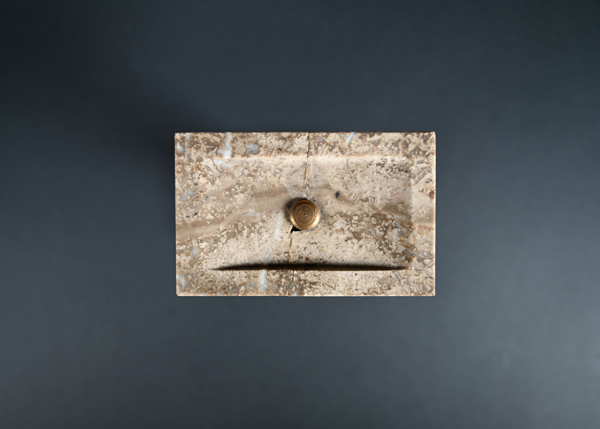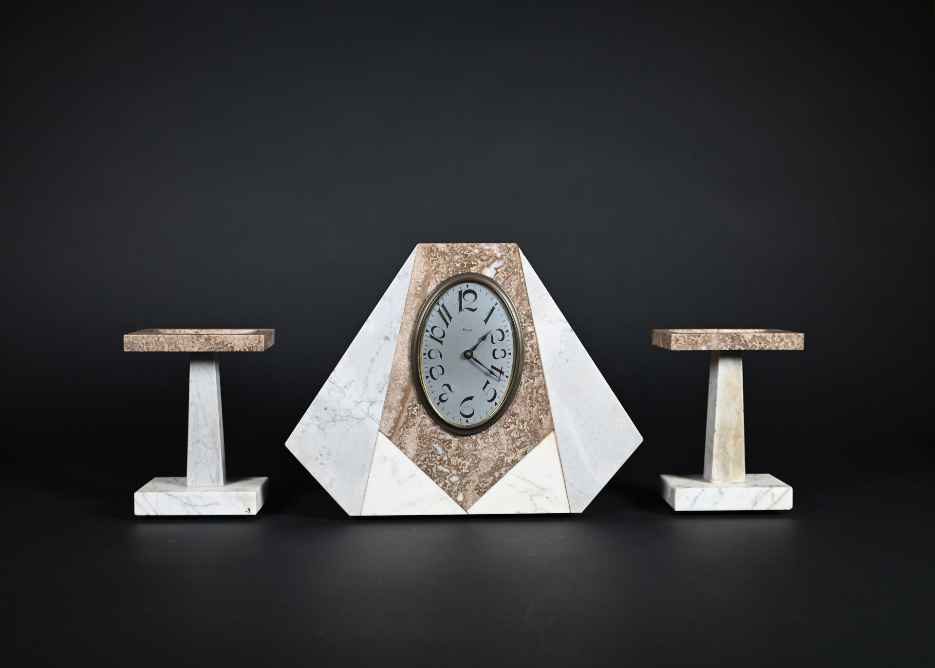 Garniture de cheminée en marbre gris, blanc et taupe comprenant une pendule borne et une paire de coupes (quelques égrenures, une restauration). Epoque Art déco. Haut. pendule : 25 cm – Larg. : 32cm.