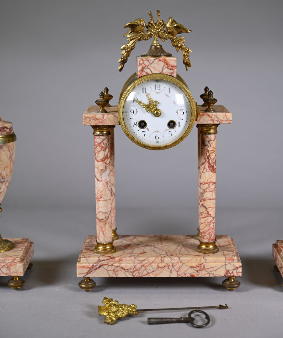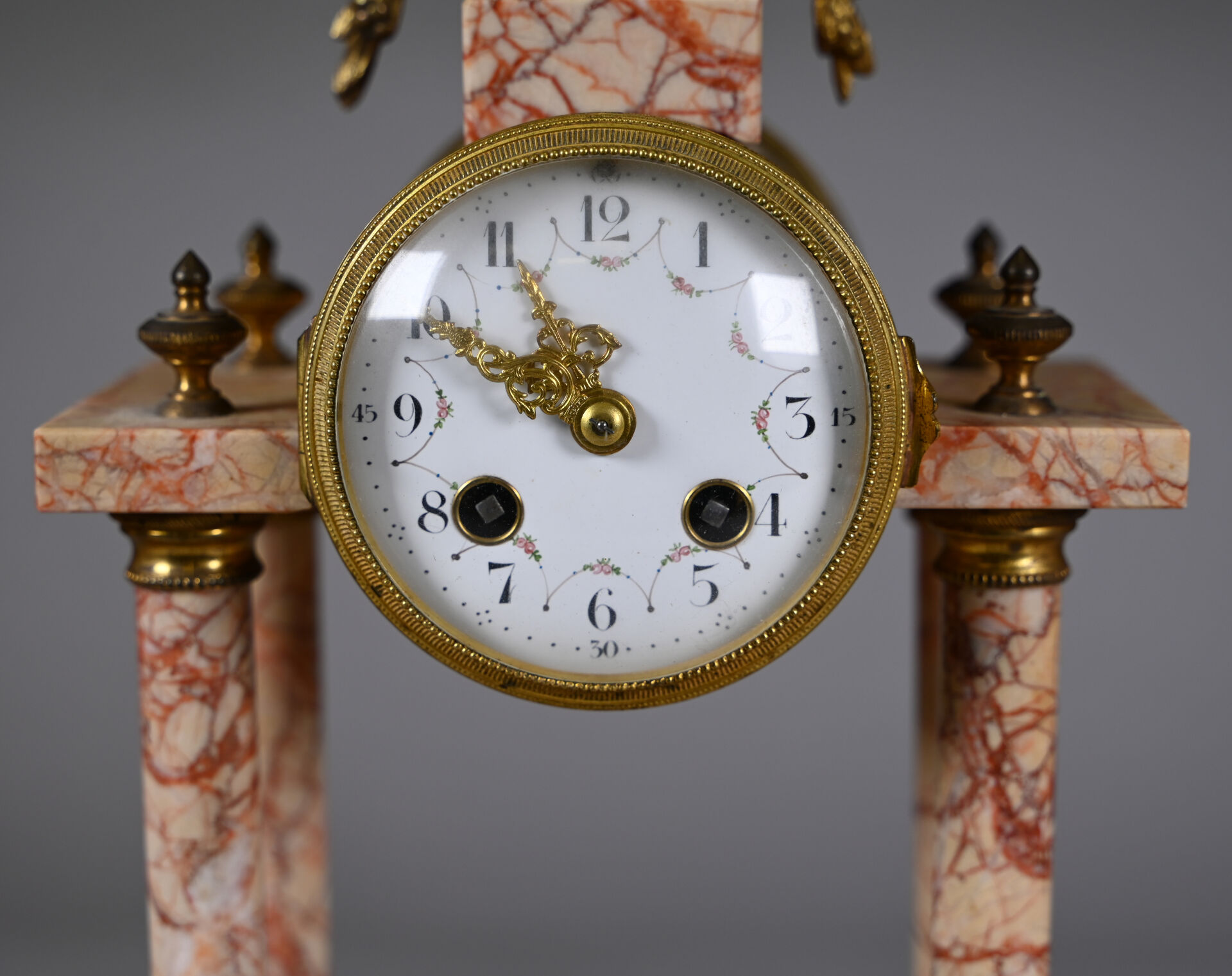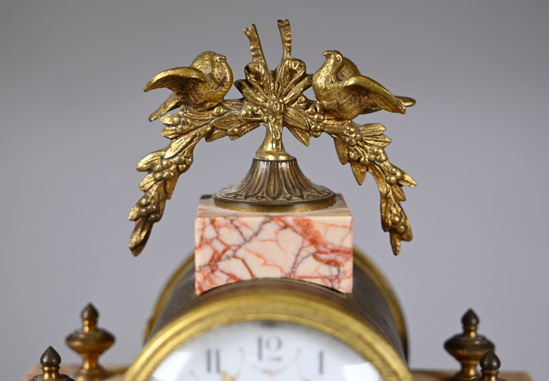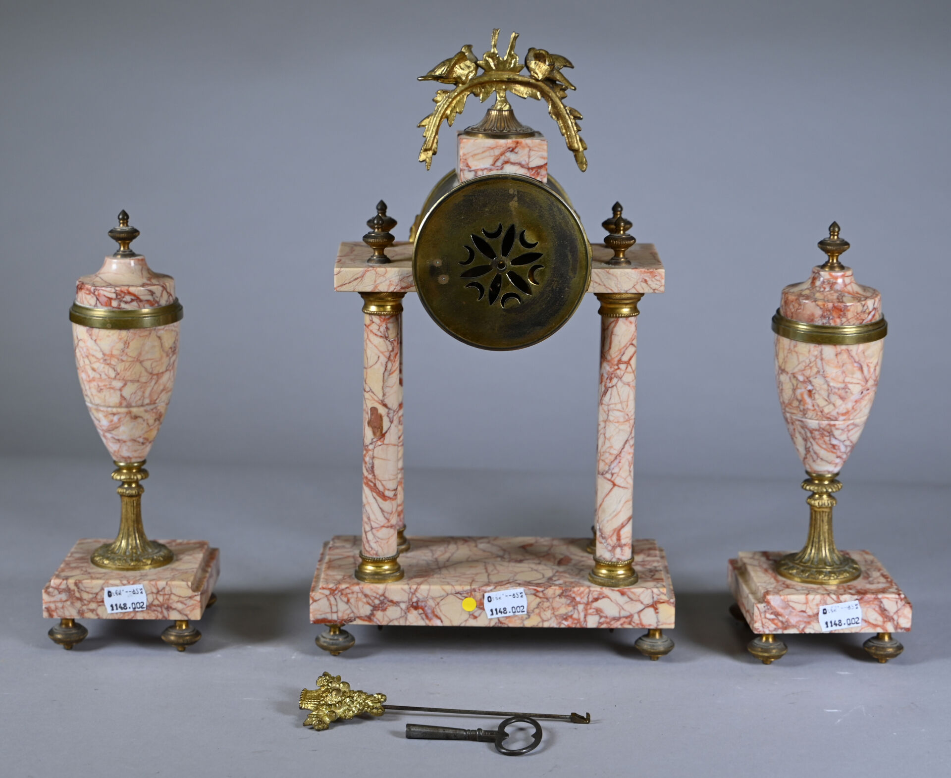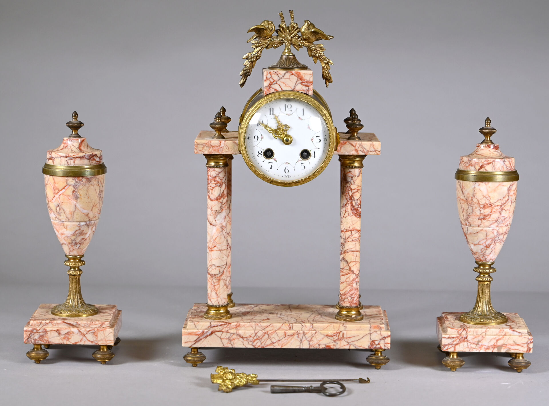 Garniture de cheminée en marbre rose, bronze et laiton comprenant une pendule et une paire de cassolettes. Cadran émaillé à chiffres arabes. Avec clé et balancier. Vers 1900. Haut. pendule : 39 cm.