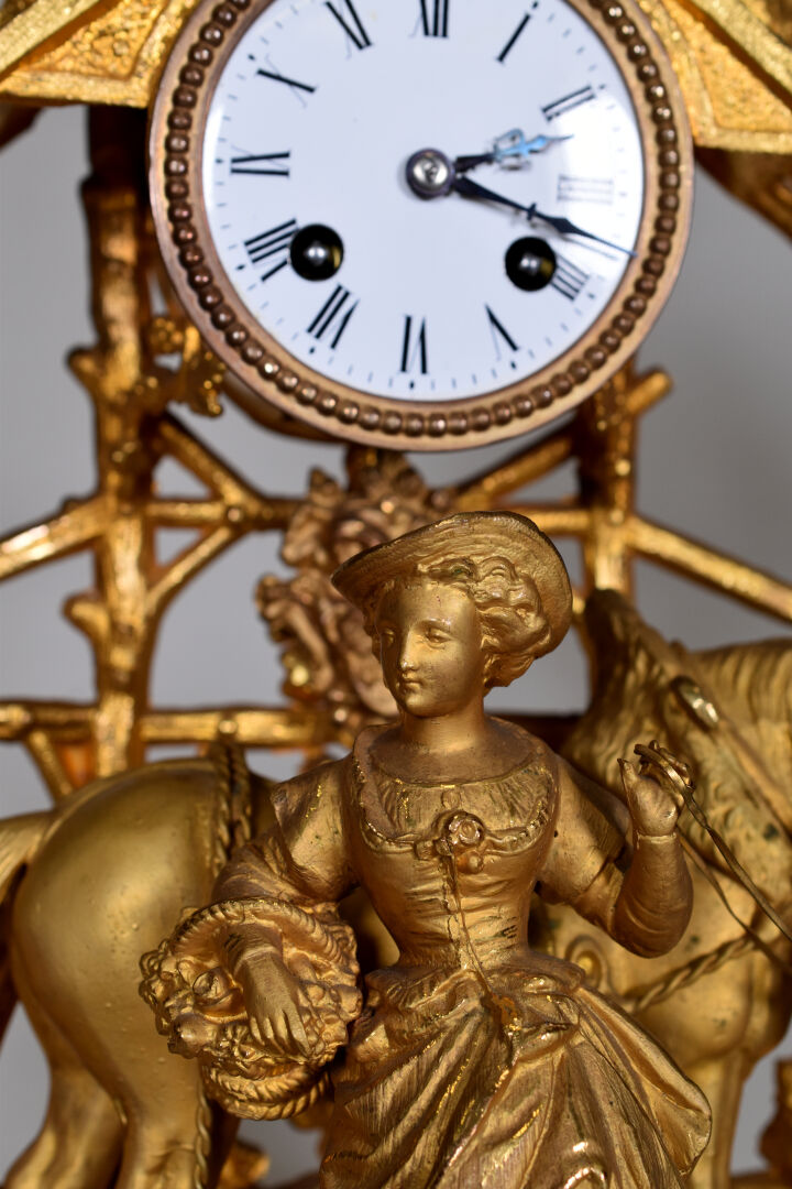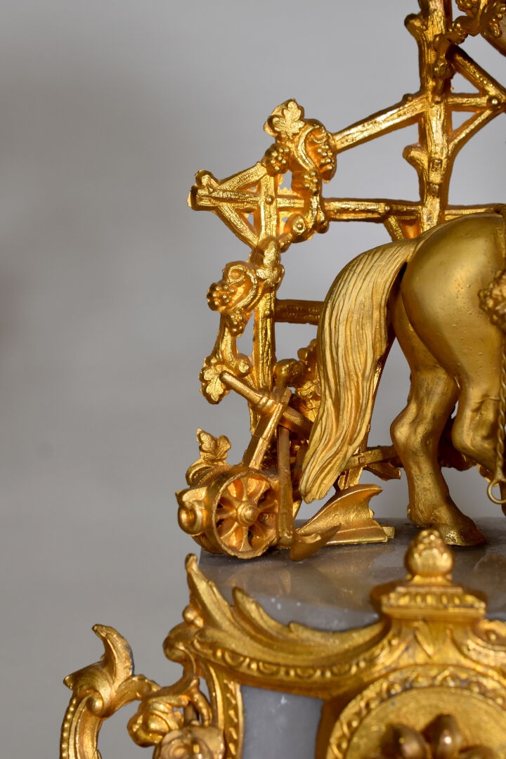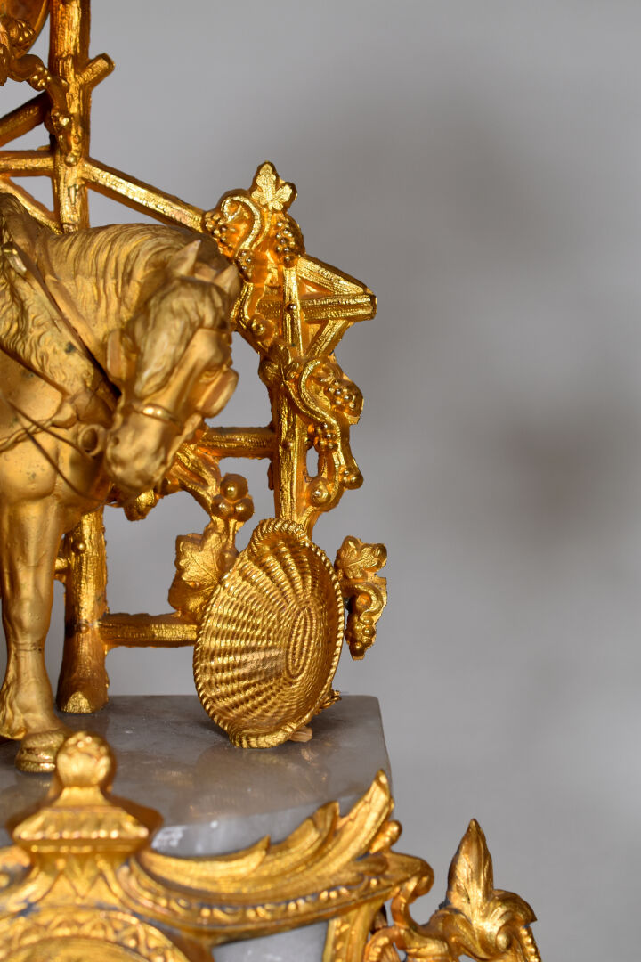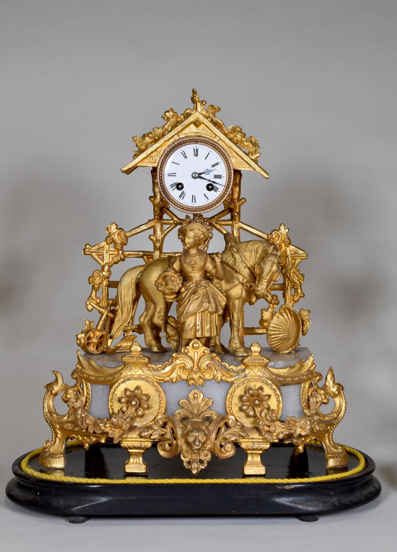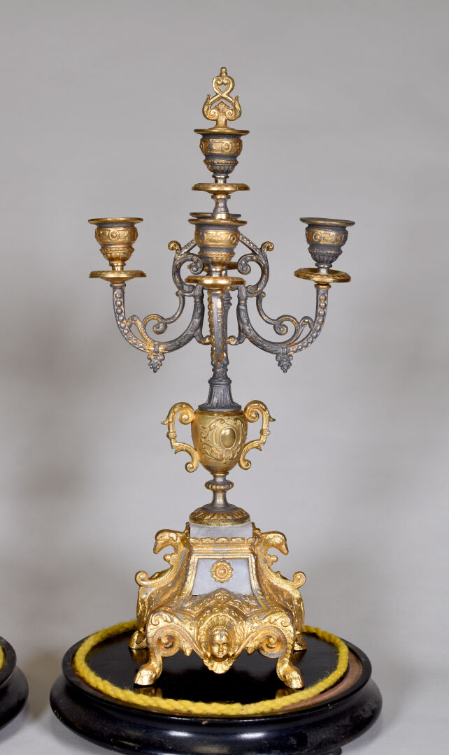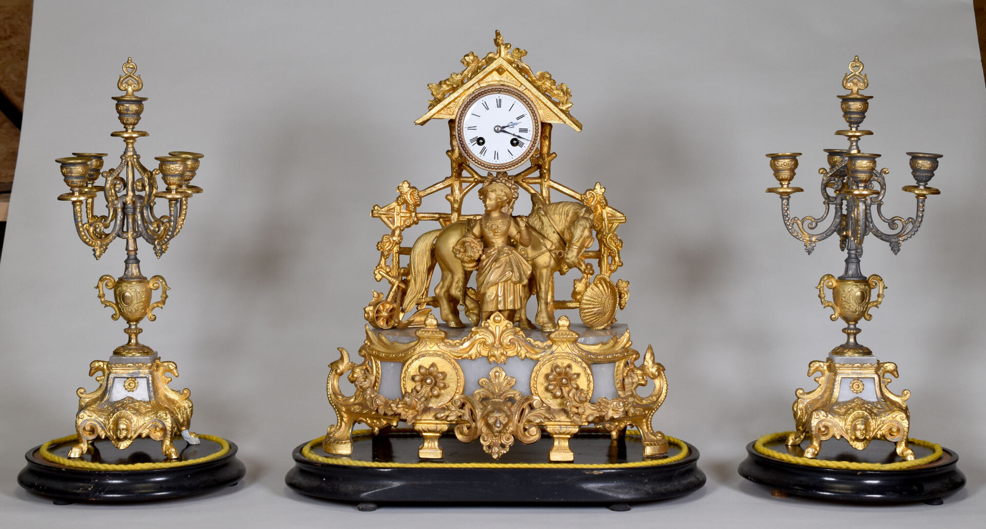 Garniture de cheminée en régule et métal dorés comprenant une pendule ornée d’une figure de bergère et son cheval, panier, fleurs, mascarons de lion et une paire de chandeliers à 4 bras et 5 lumières (usures à la dorure). Fin du XIXe siècle. DIm. de la pendule : Haut. : 48,5 cm – Larg. : 42 cm – Prof. : 18 cm. Le tout avec cloches en verre et bois noirci (une félée).