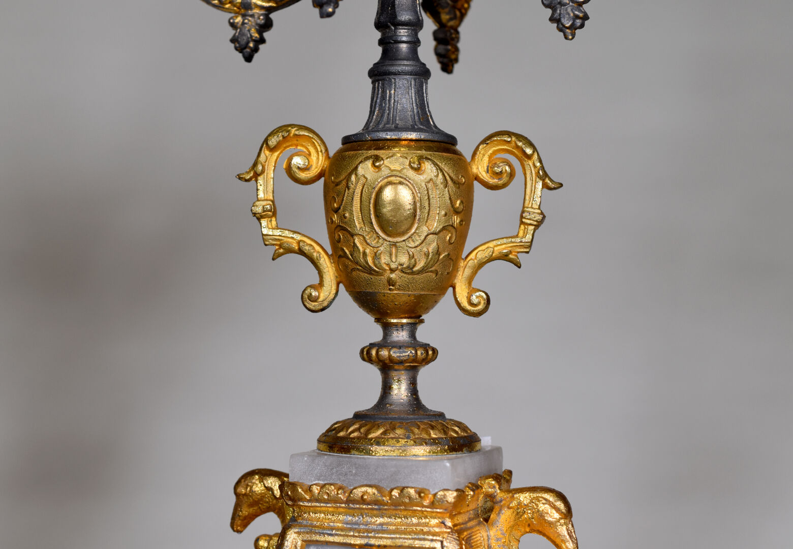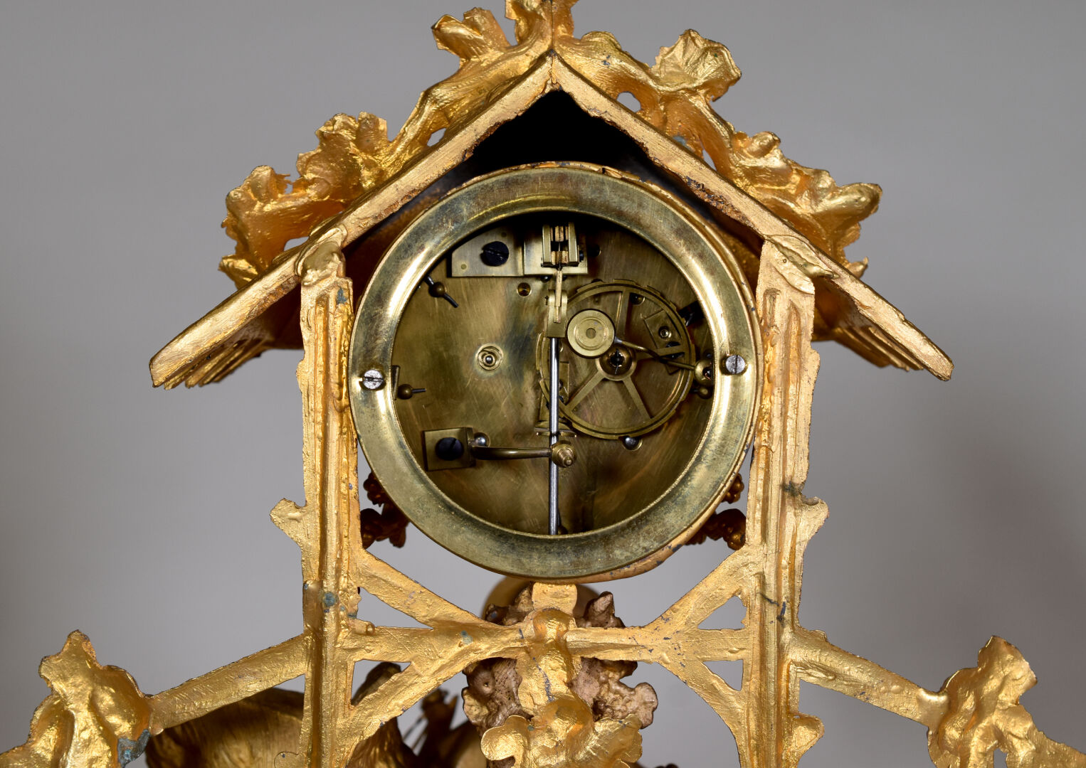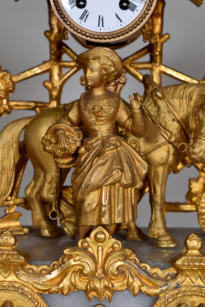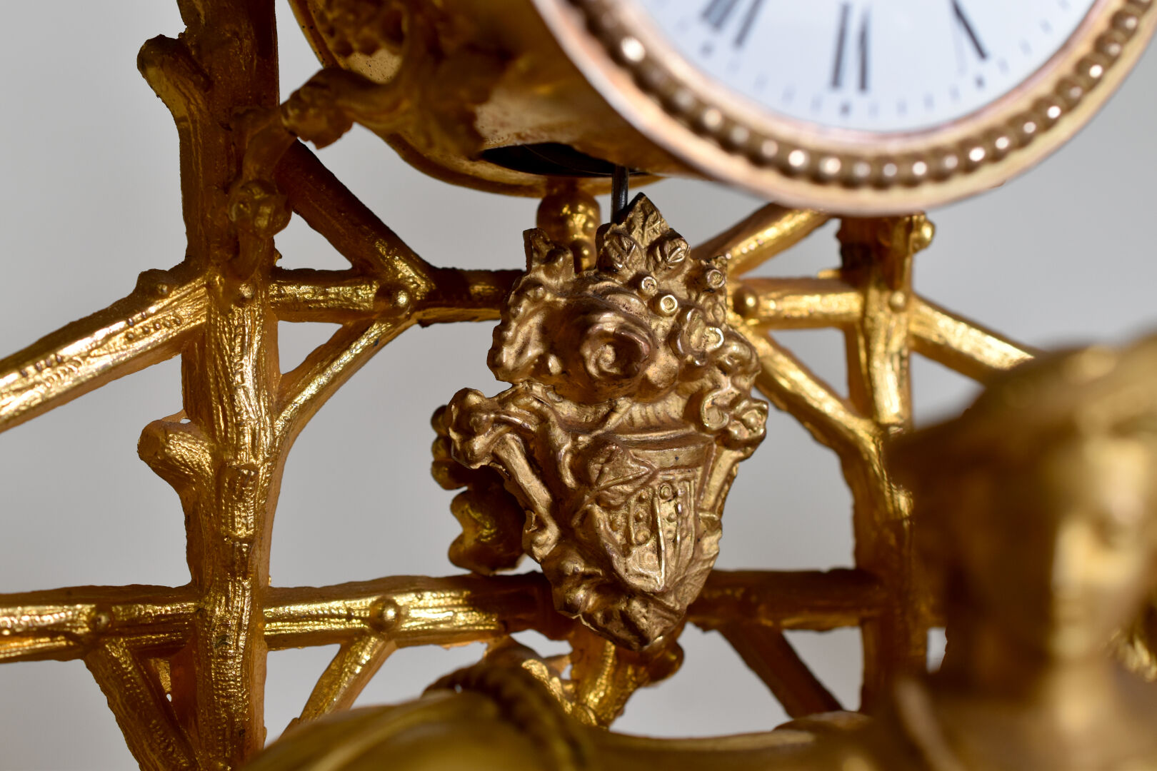 Garniture de cheminée en régule et métal dorés comprenant une pendule ornée d’une figure de bergère et son cheval, panier, fleurs, mascarons de lion et une paire de chandeliers à 4 bras et 5 lumières (usures à la dorure). Fin du XIXe siècle. DIm. de la pendule : Haut. : 48,5 cm – Larg. : 42 cm – Prof. : 18 cm. Le tout avec cloches en verre et bois noirci (une félée).