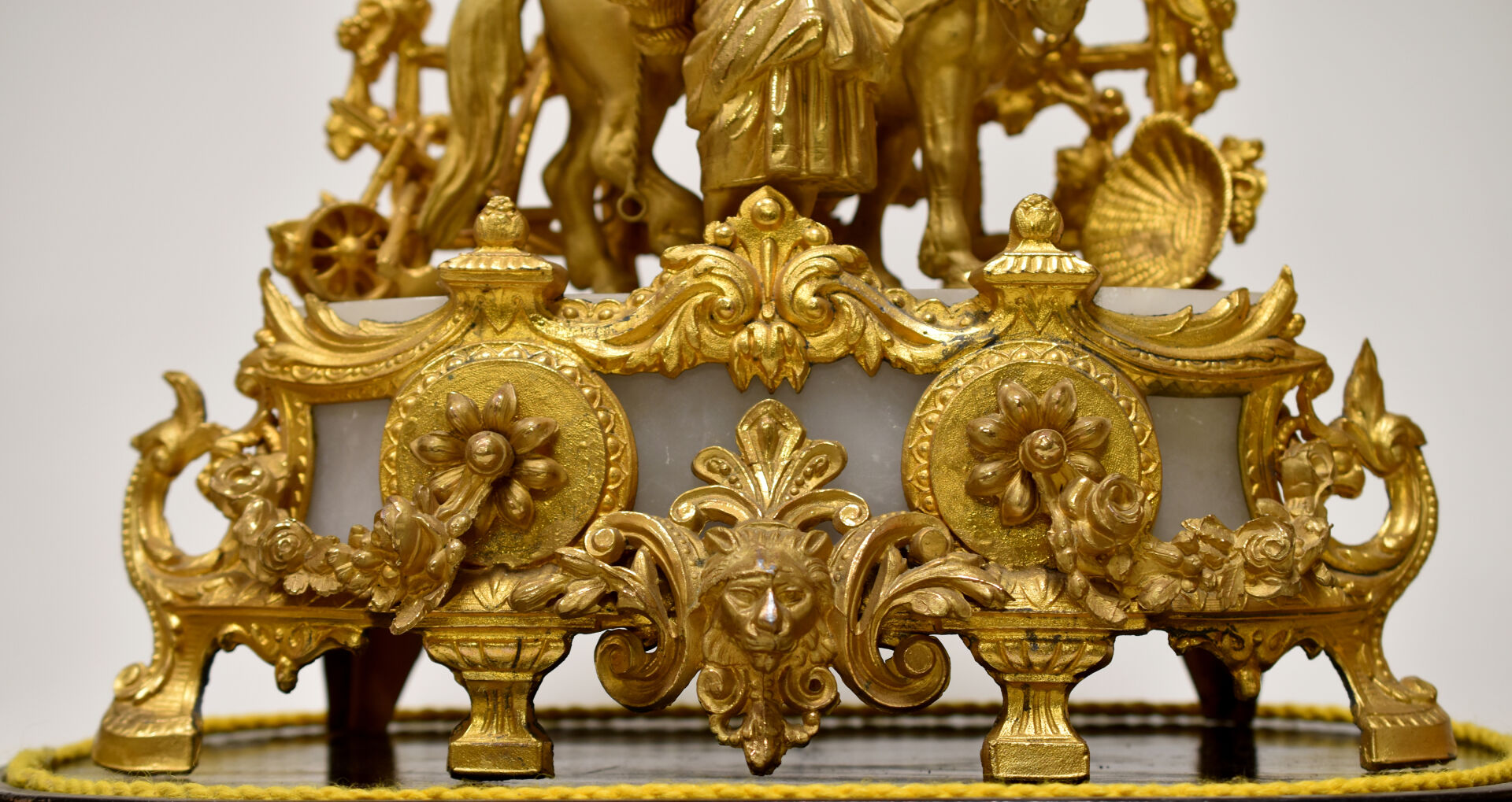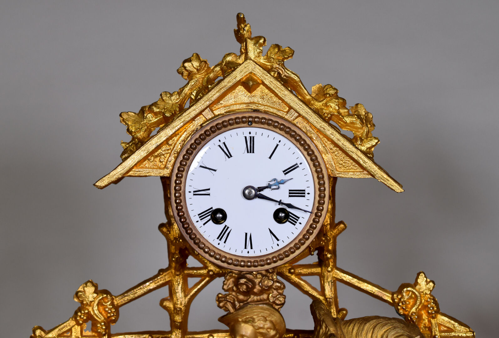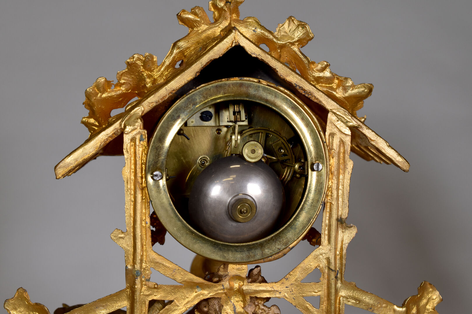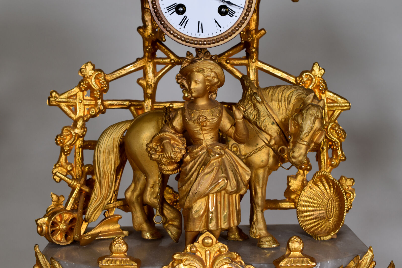 Garniture de cheminée en régule et métal dorés comprenant une pendule ornée d’une figure de bergère et son cheval, panier, fleurs, mascarons de lion et une paire de chandeliers à 4 bras et 5 lumières (usures à la dorure). Fin du XIXe siècle. DIm. de la pendule : Haut. : 48,5 cm – Larg. : 42 cm – Prof. : 18 cm. Le tout avec cloches en verre et bois noirci (une félée).