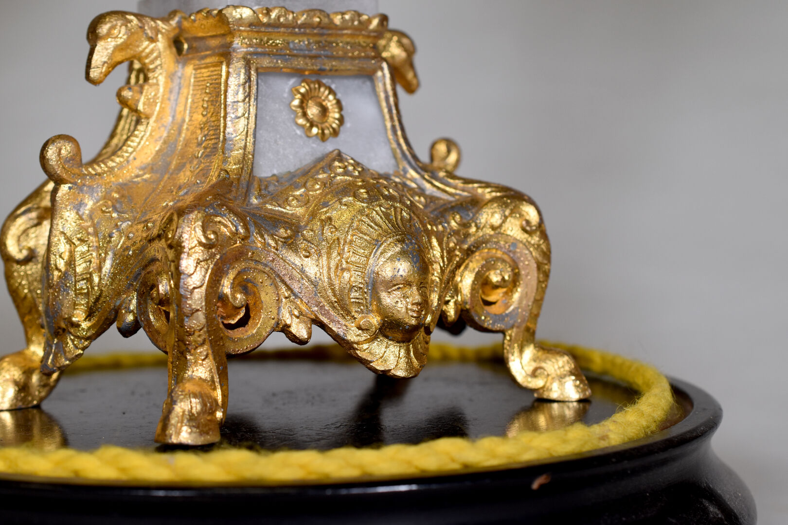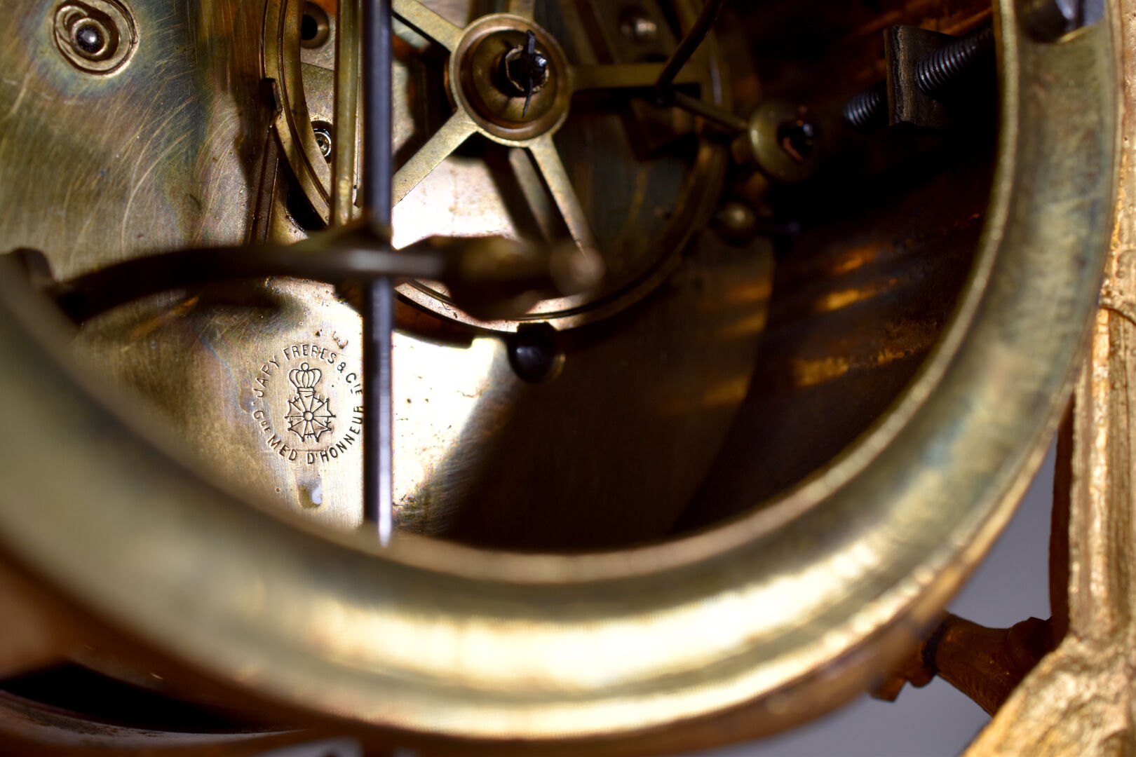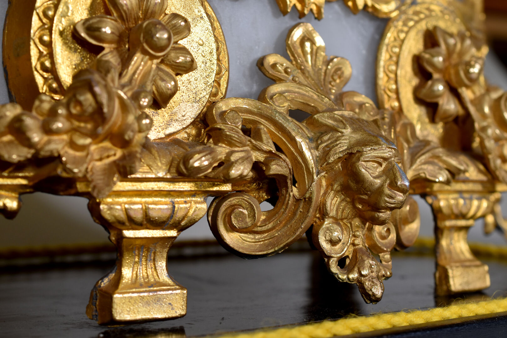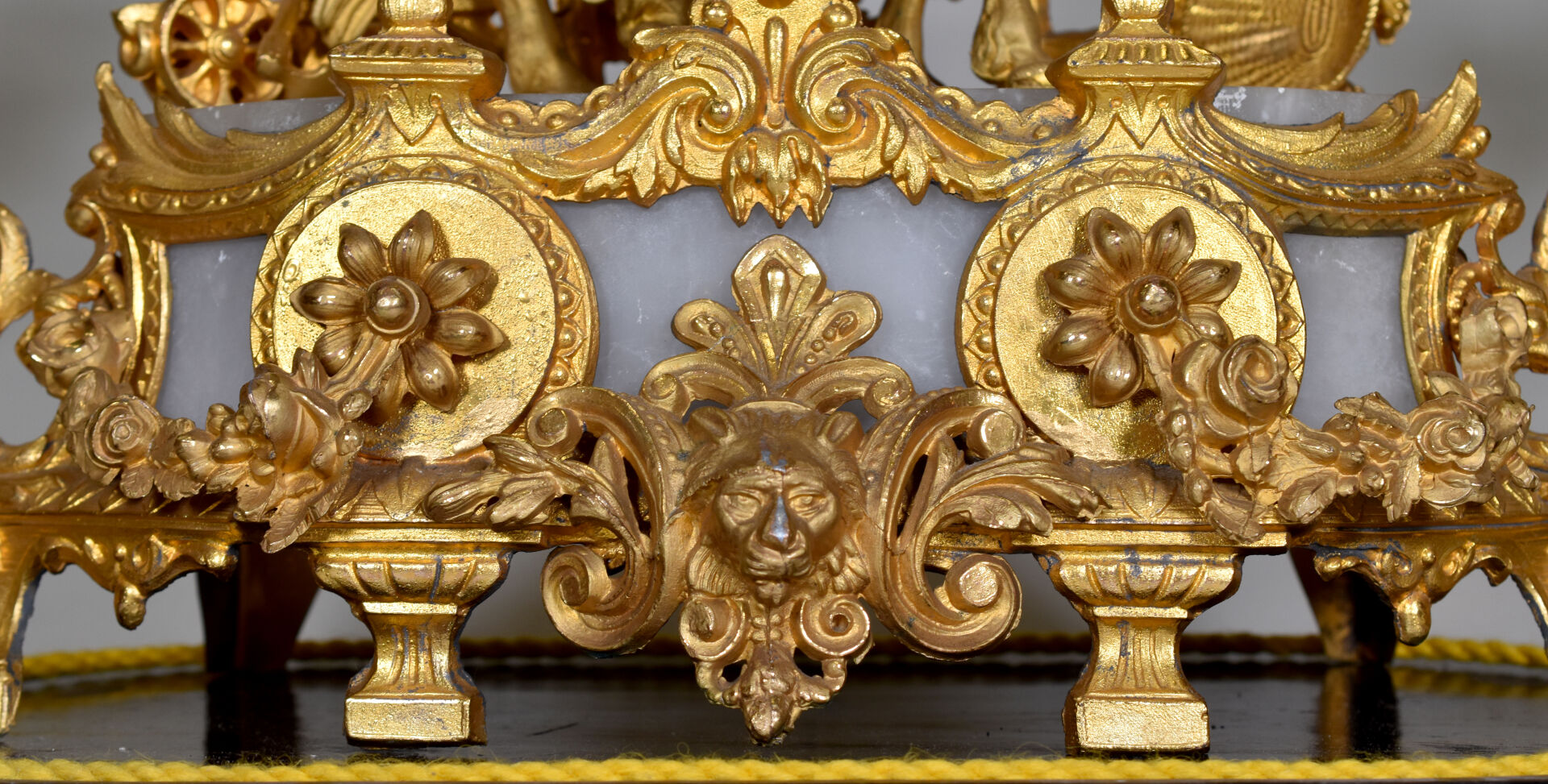 Garniture de cheminée en régule et métal dorés comprenant une pendule ornée d’une figure de bergère et son cheval, panier, fleurs, mascarons de lion et une paire de chandeliers à 4 bras et 5 lumières (usures à la dorure). Fin du XIXe siècle. DIm. de la pendule : Haut. : 48,5 cm – Larg. : 42 cm – Prof. : 18 cm. Le tout avec cloches en verre et bois noirci (une félée).