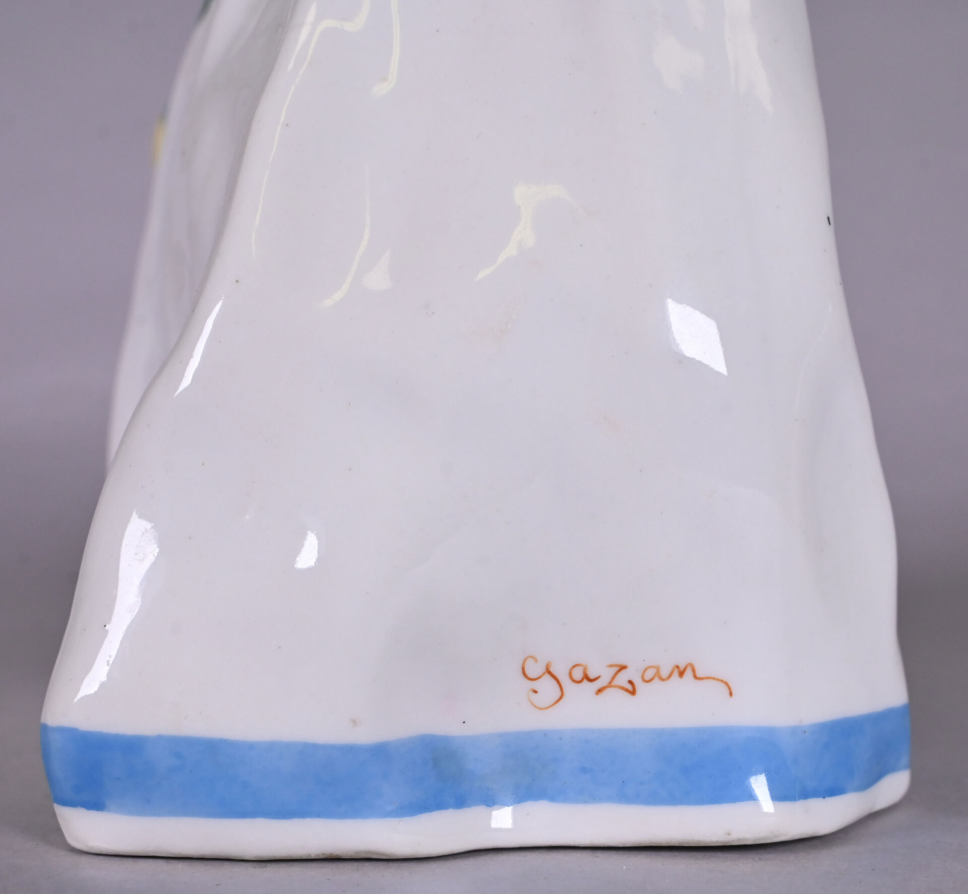 GAZAN Emile (1895-1979) ETLING. Veilleuse brûle-parfum en porcelaine émaillée crème et polychrome figurant une femme au bouquet. Marquée au dessous ETLING Made In France. Haut. : 27 cm.