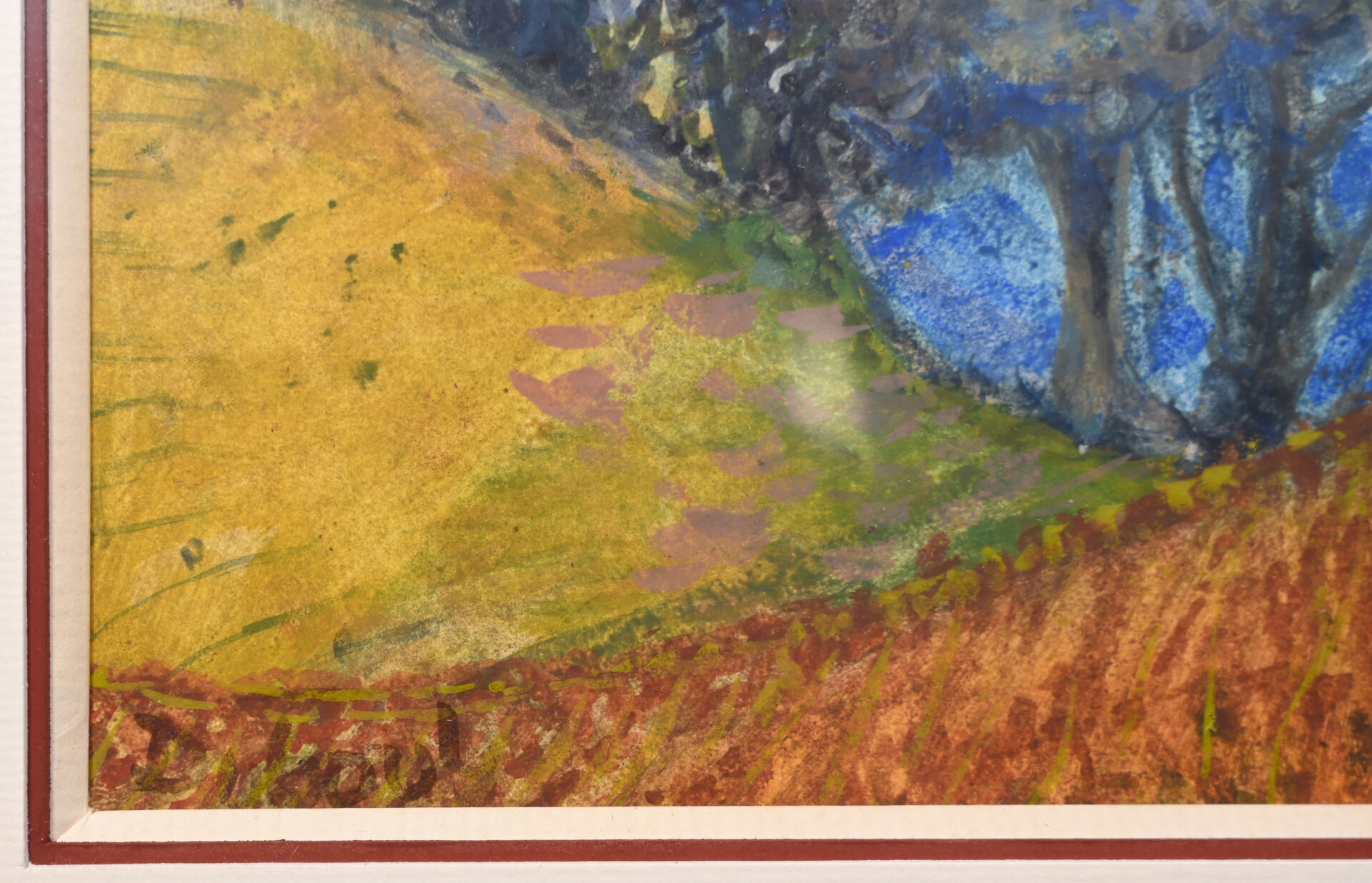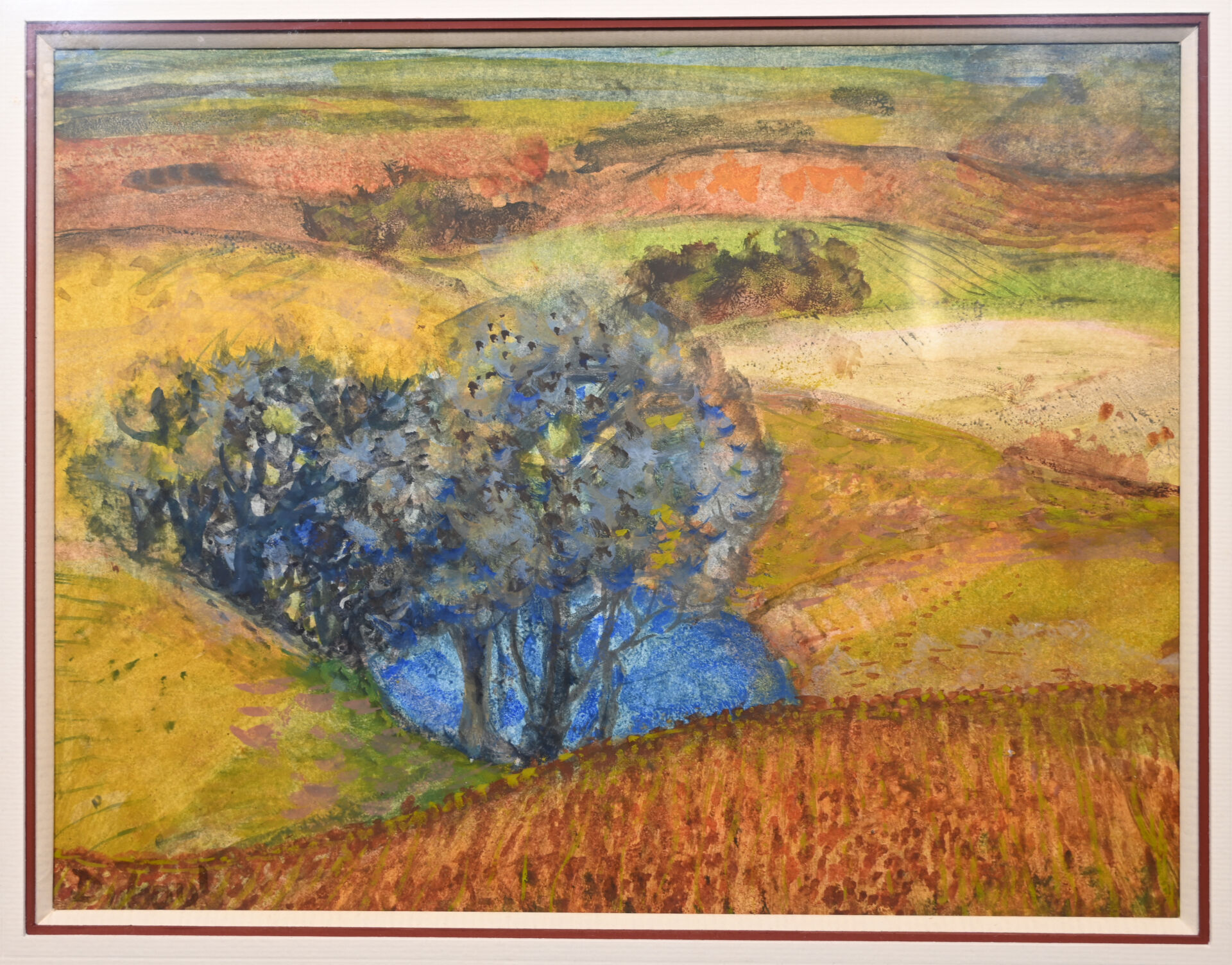 Geneviève DUBOUL (1913-2007). Paysage aux arbres bleu. Aquarelle et gouache signée en bas à gauche. 23,5 x 30 cm à vue.