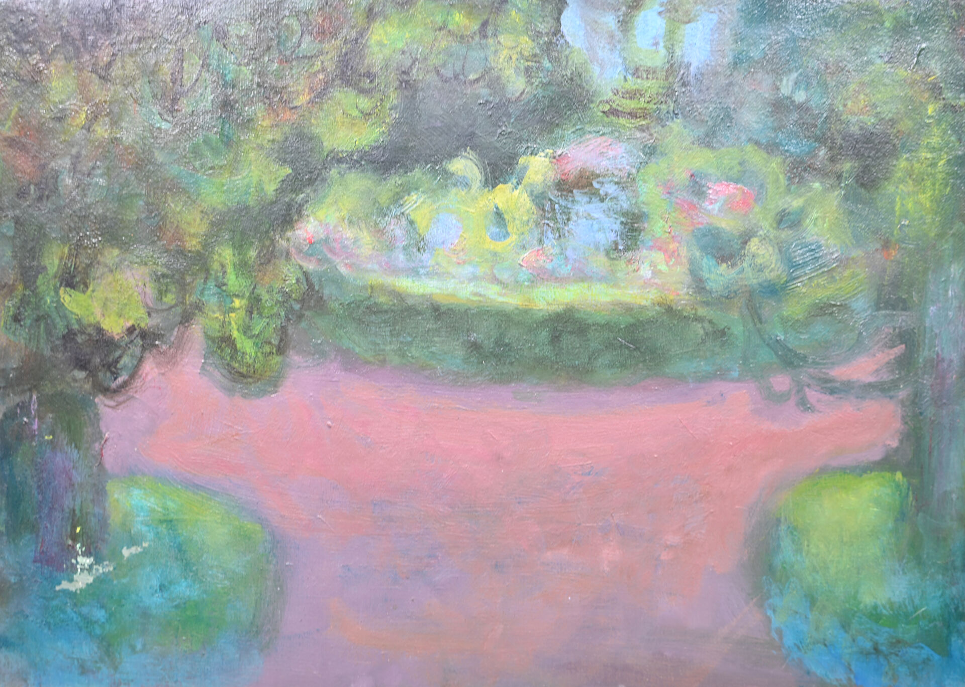 Geneviève DUBOUL (1913-2007). Vue d’un jardin. Huile sur toile, non signée (un enfoncement en bas à gauche). 24 x 33 cm.