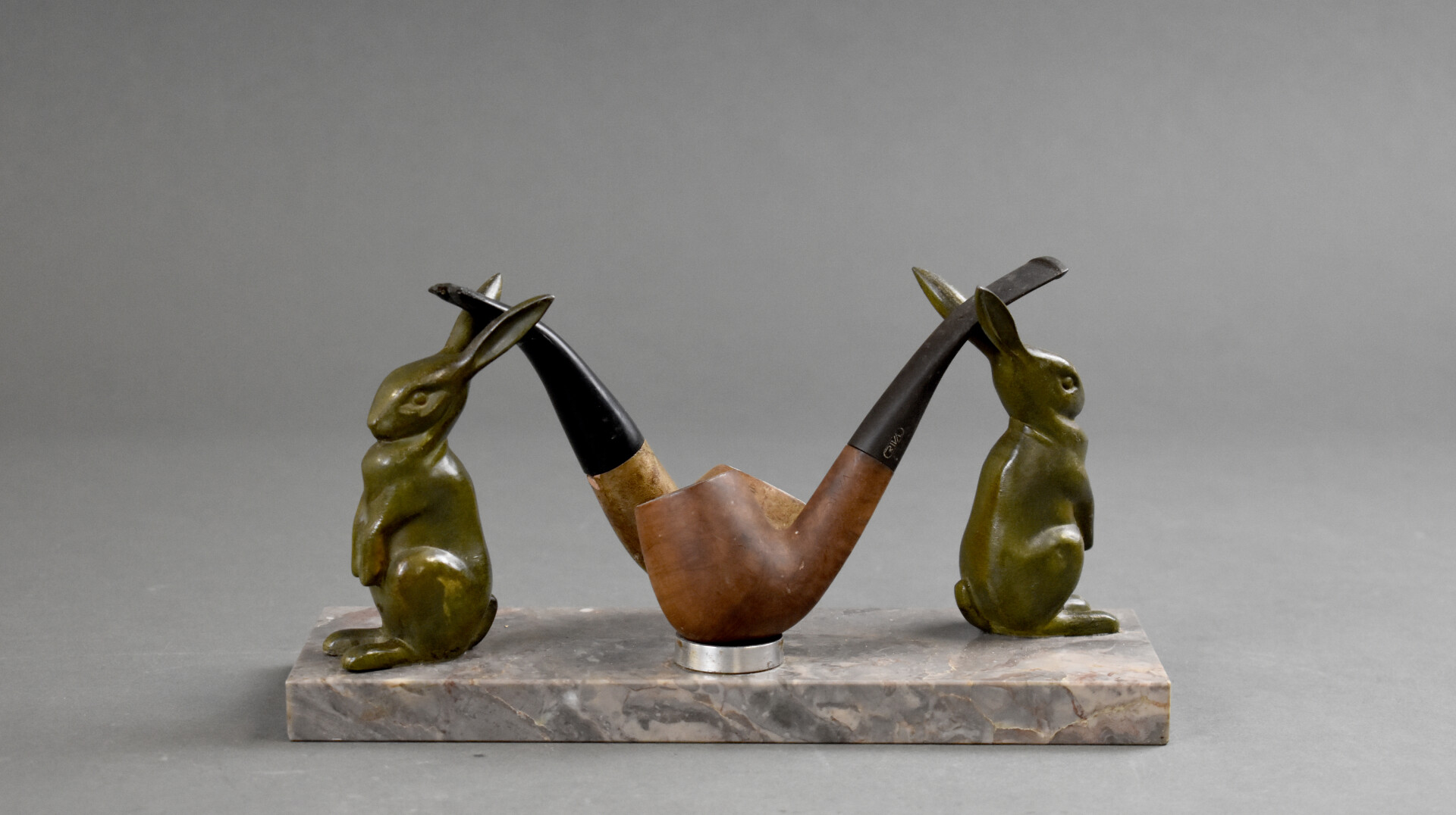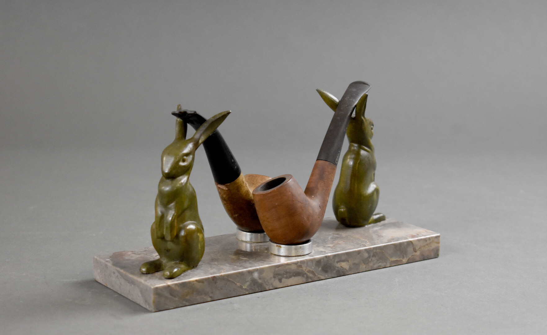 George GAREAU (Né en 1885). Porte pipe double représentant un couple de lapin de dos en régule patiné vert. La base en marbre gris. Signé. Haut. : 13 cm – Larg. : 23 cm – Prof. : 8 cm.