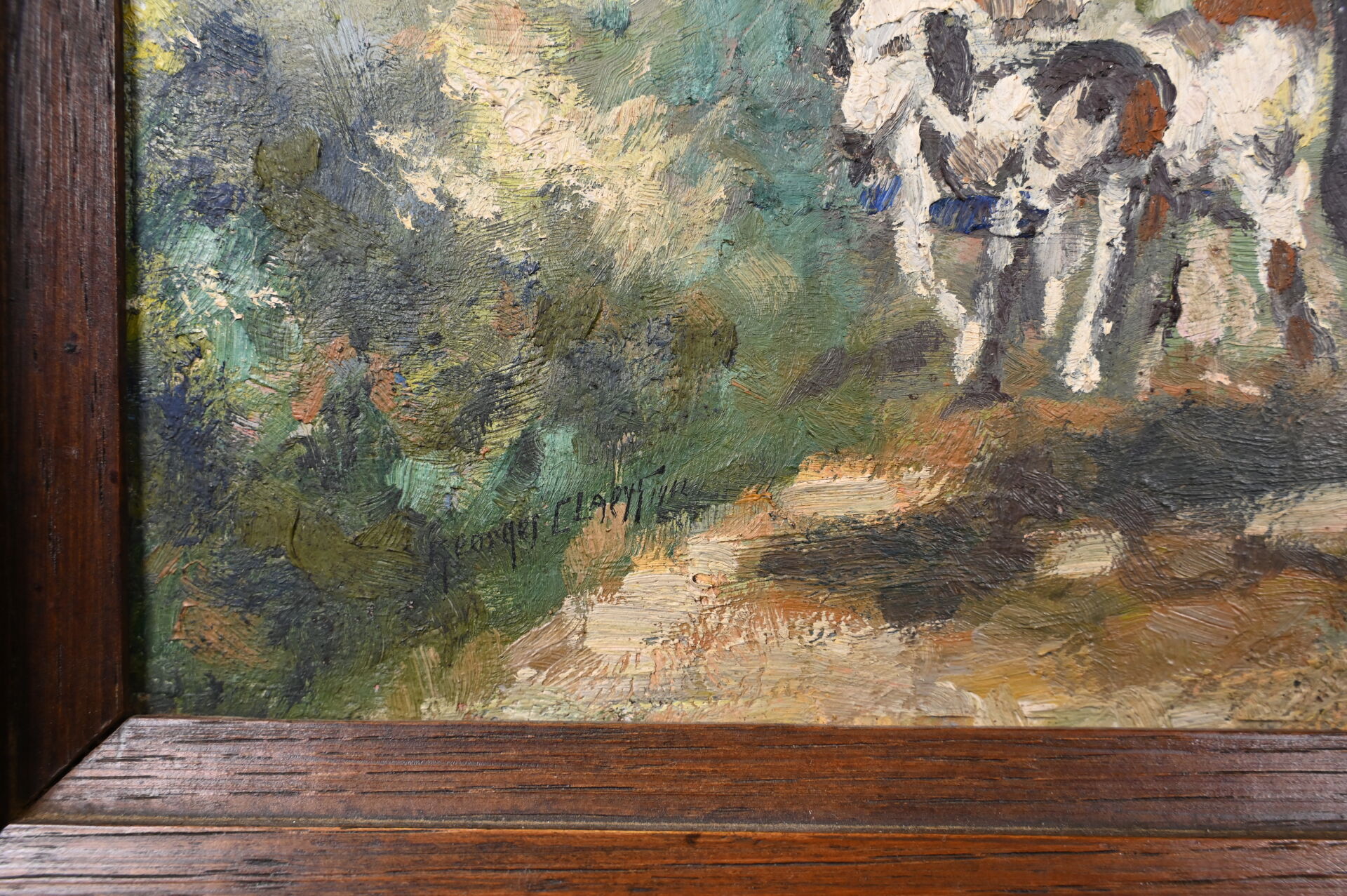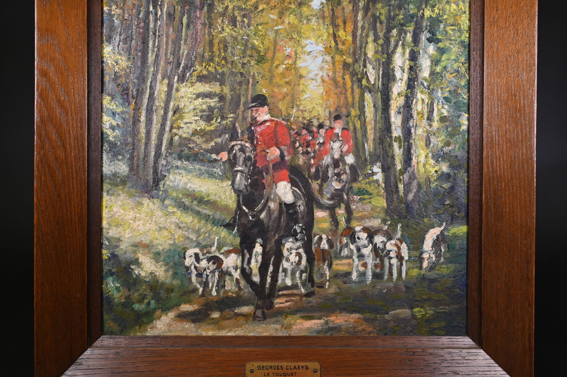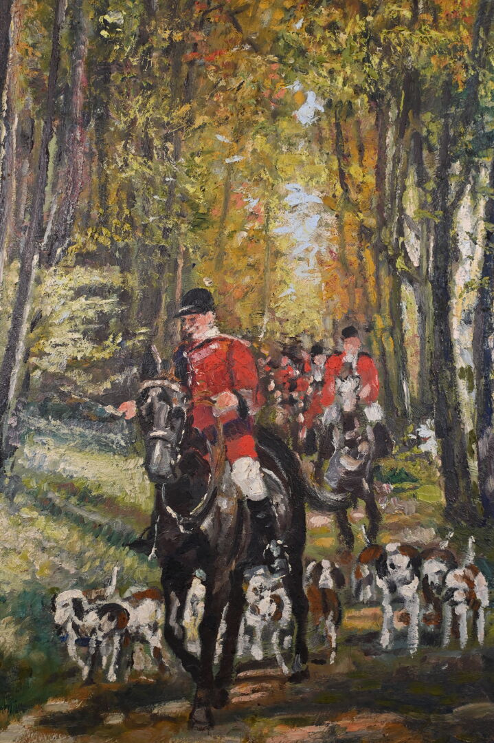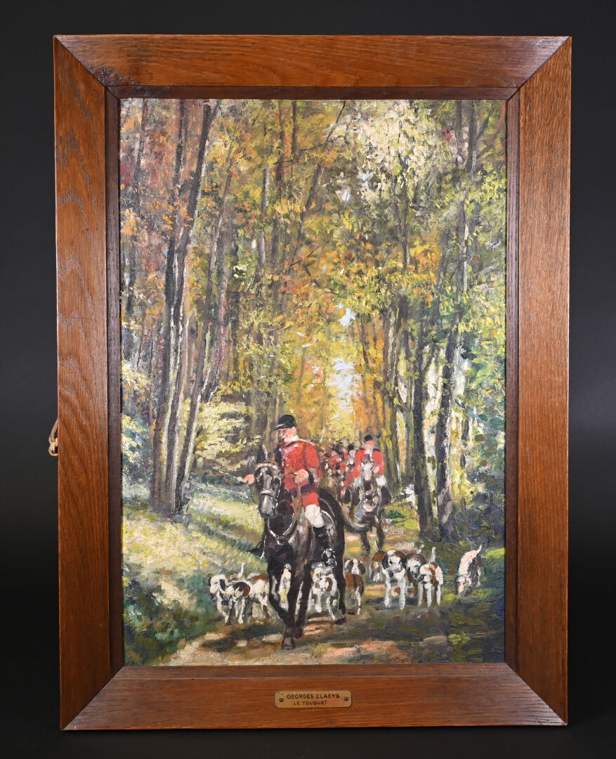 Georges CLAYES (XXe siècle). La chasse à coure. Huile sur carton signée en bas à gauche. 53,5 x 38 cm.