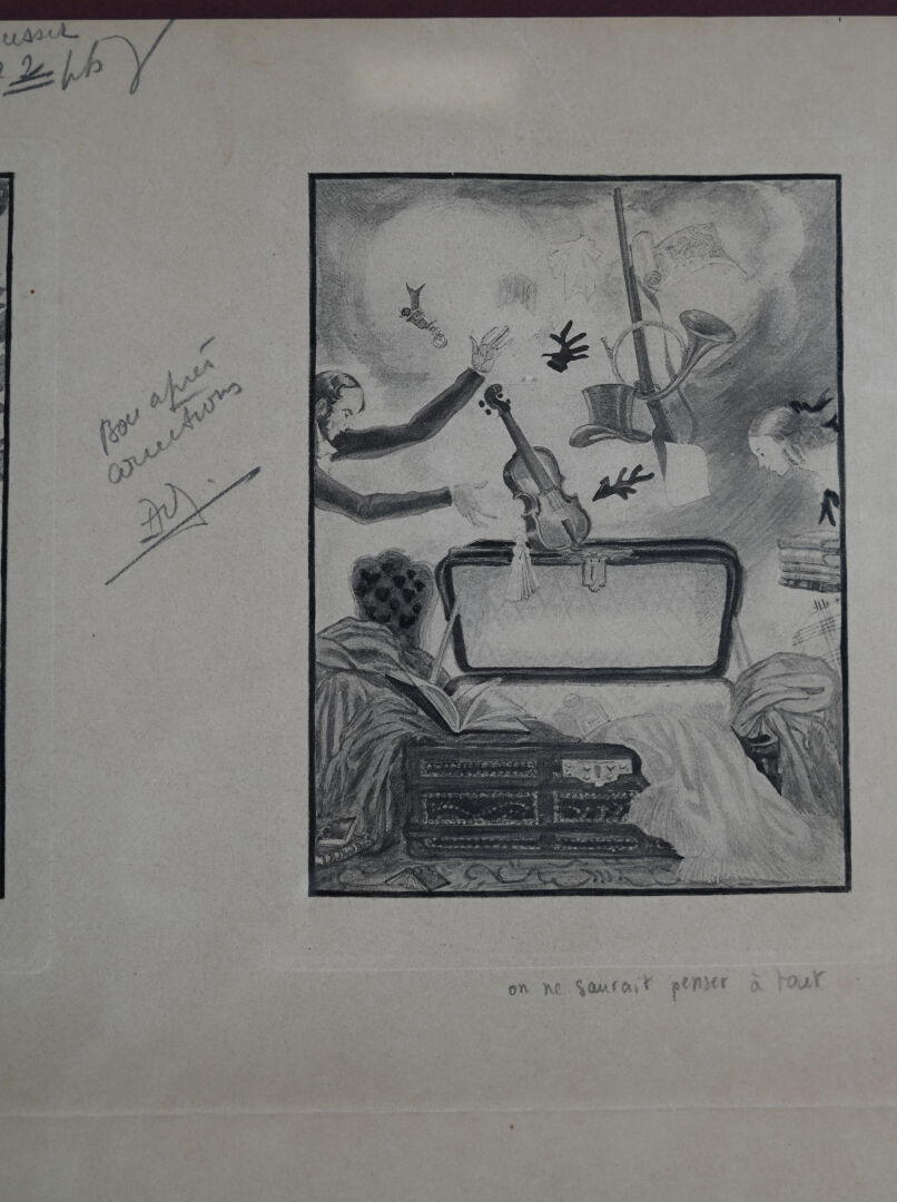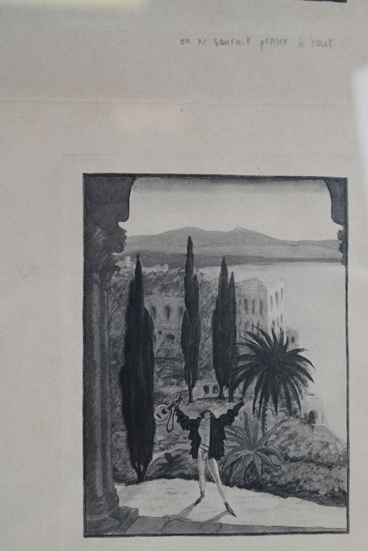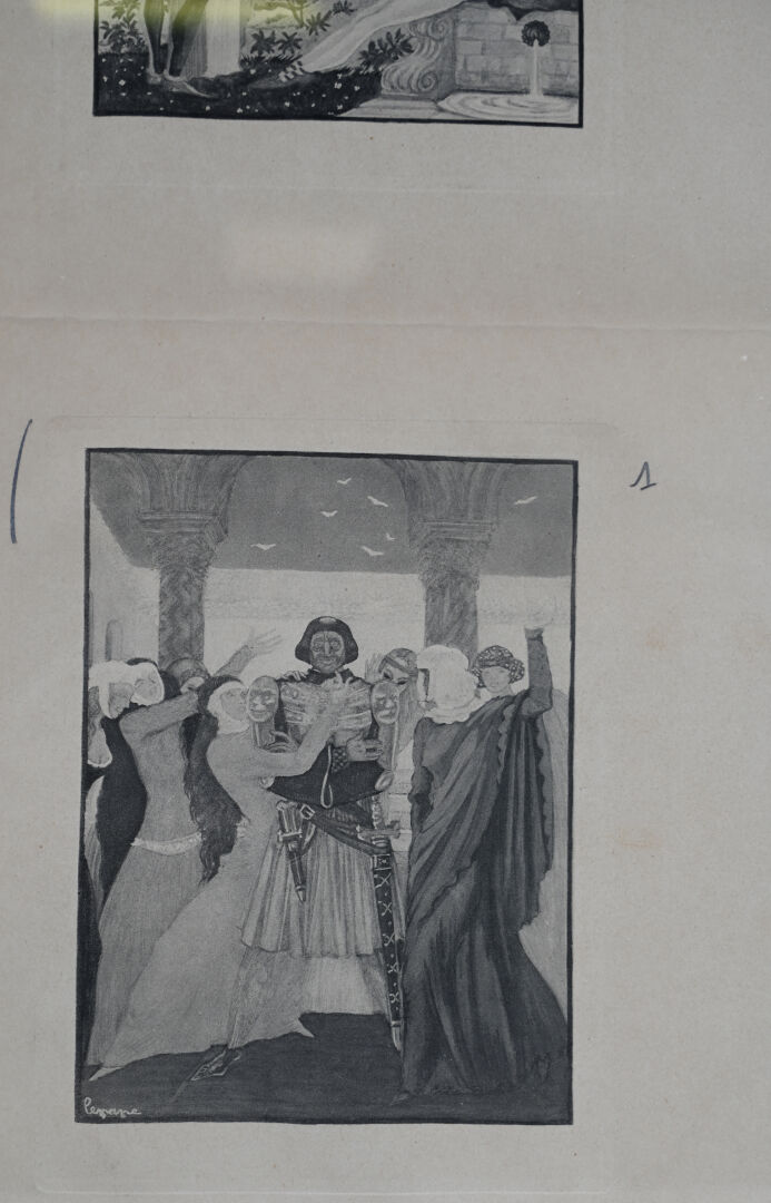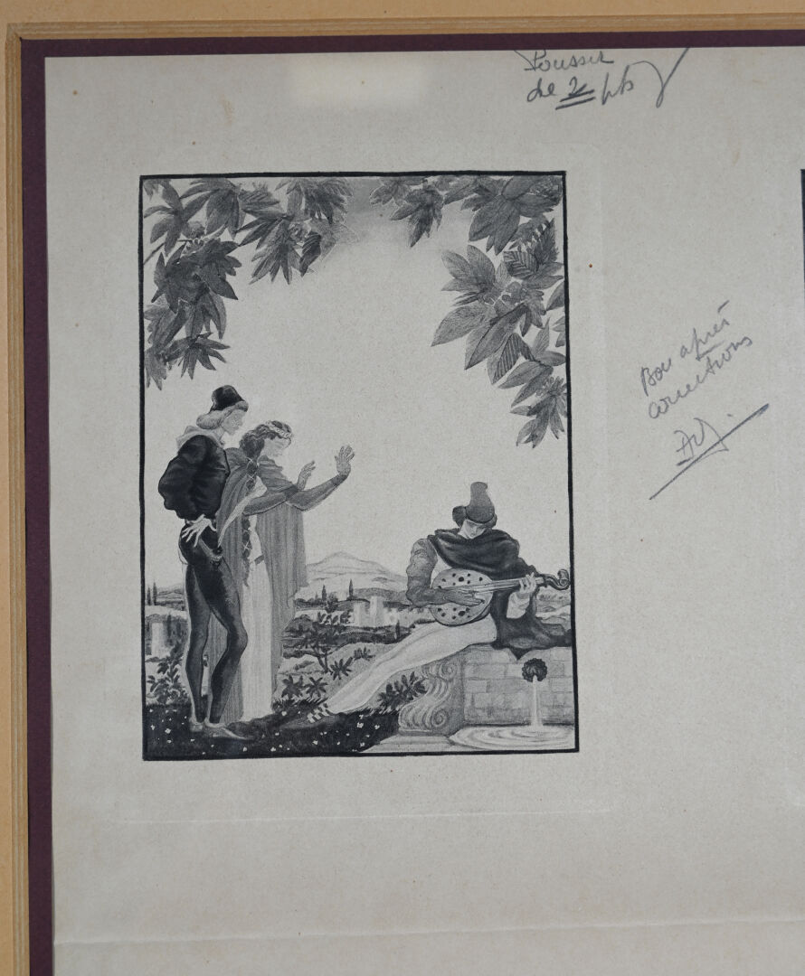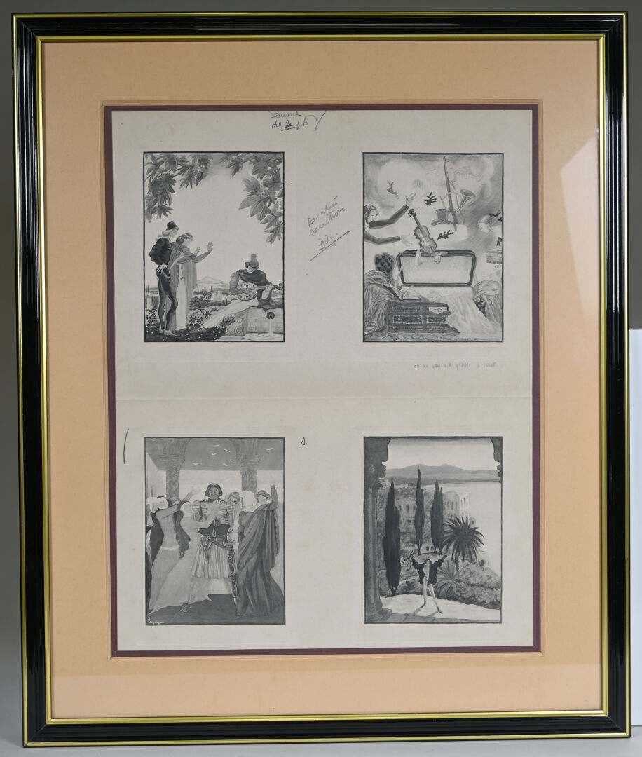 Georges LEPAPE. (1887-1971). Quatre gravures en noir sur un feuillet (pliures). 45 x 35,5 cm (pour toute la page).