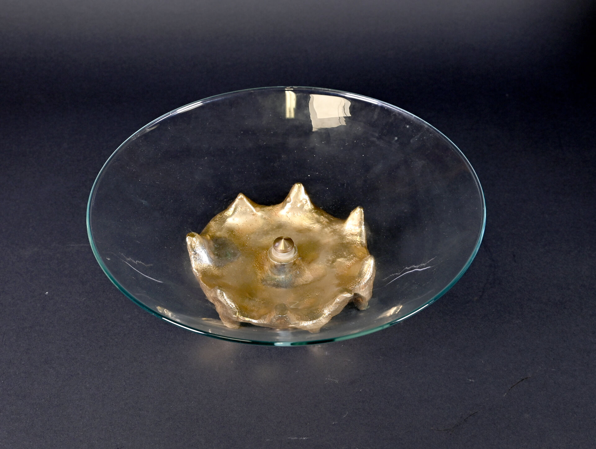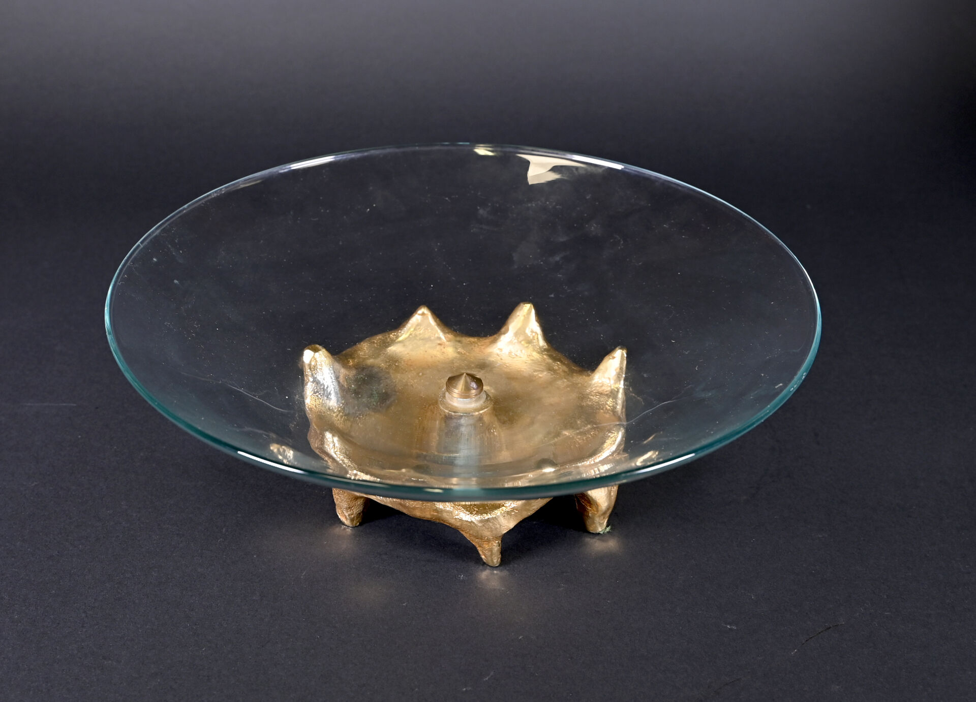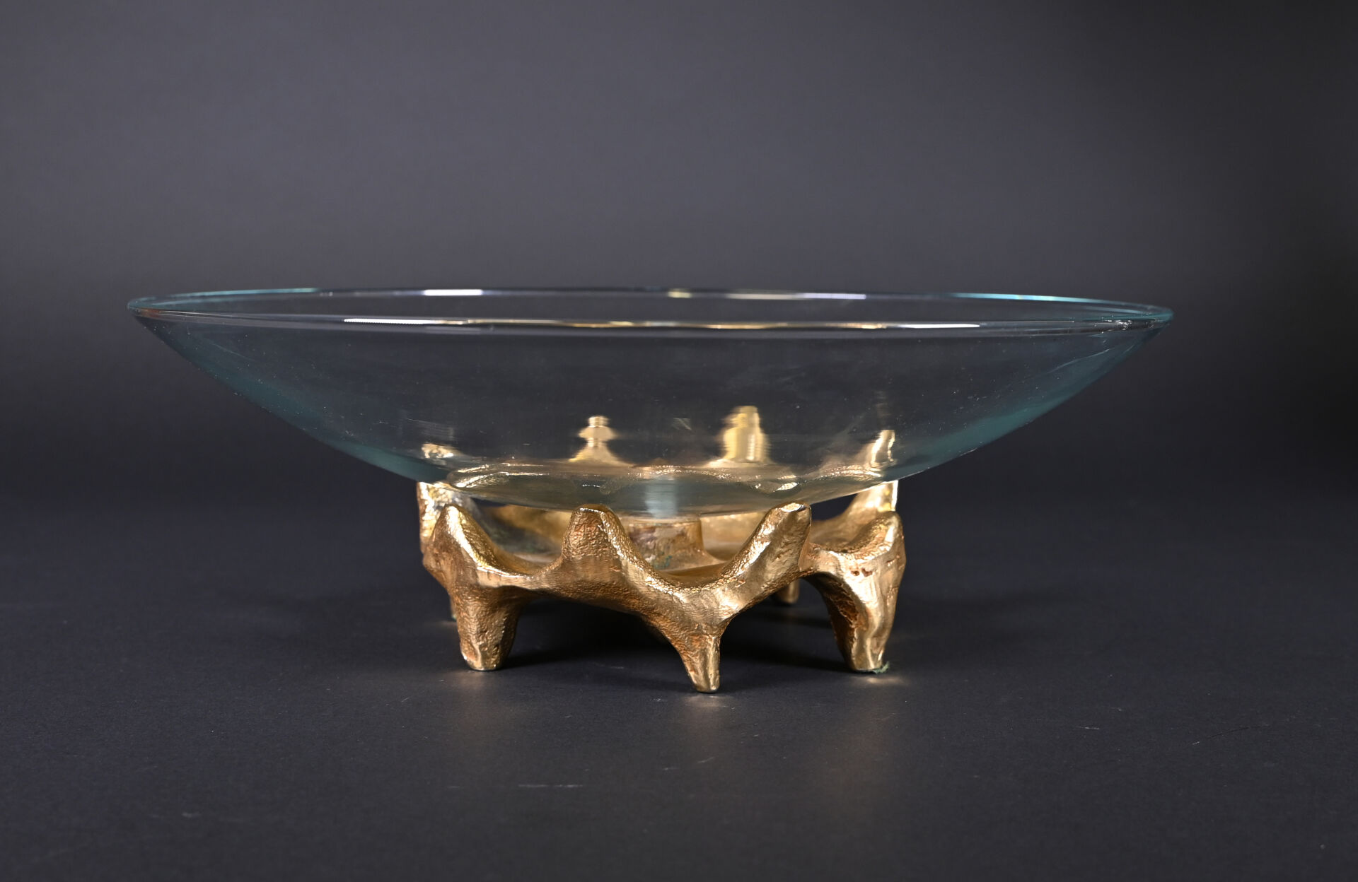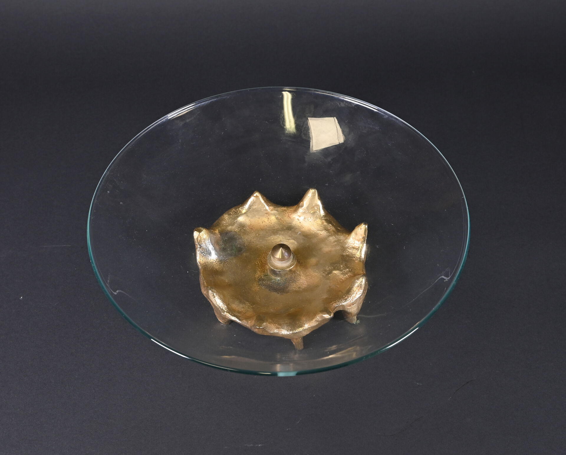 Georges MATHIAS, Paris. Coupe sur pied en verre à piétement de forme libre en bronze doré. Signée au dessous. Haut. : 12 cm – Diam. : 35 cm.