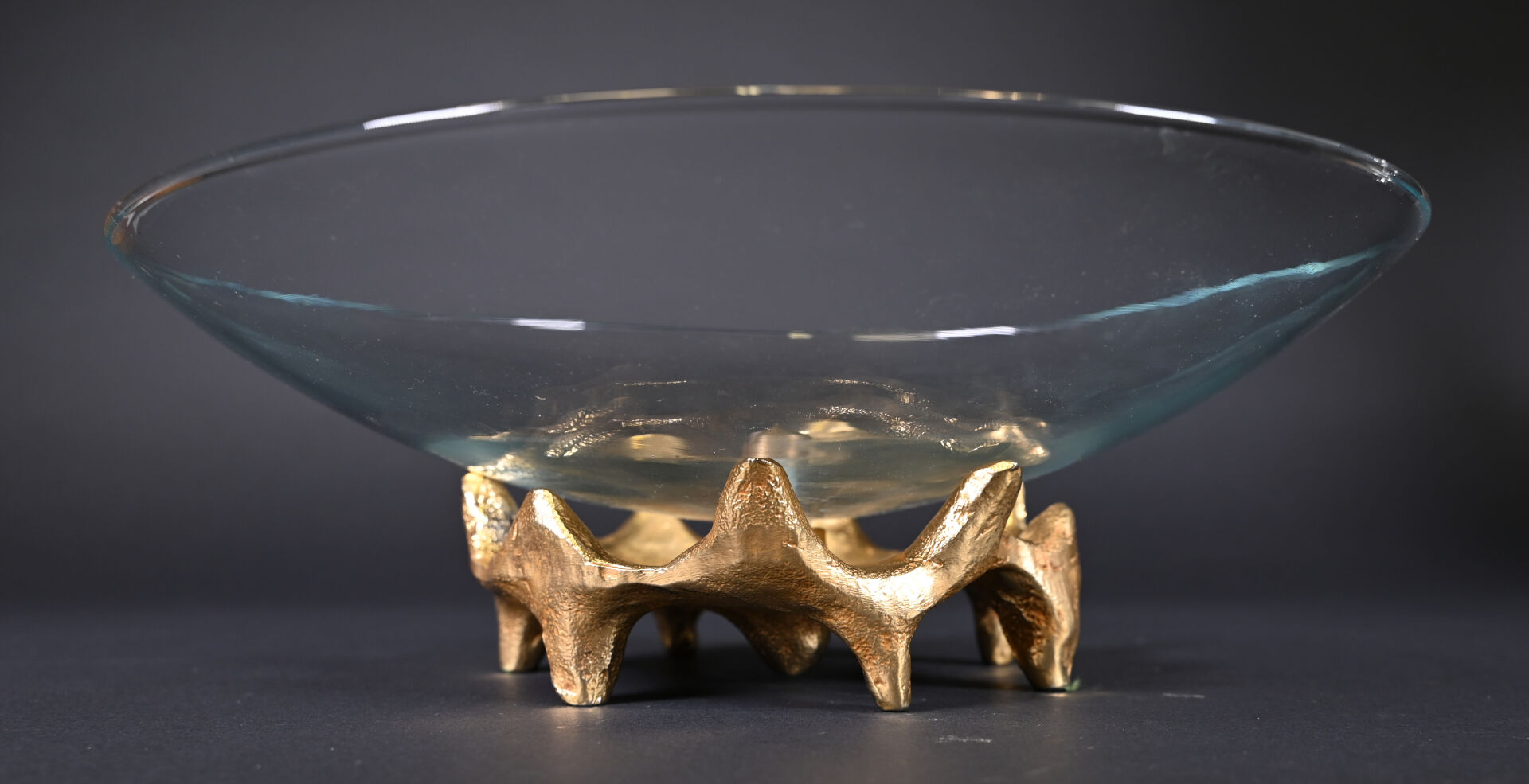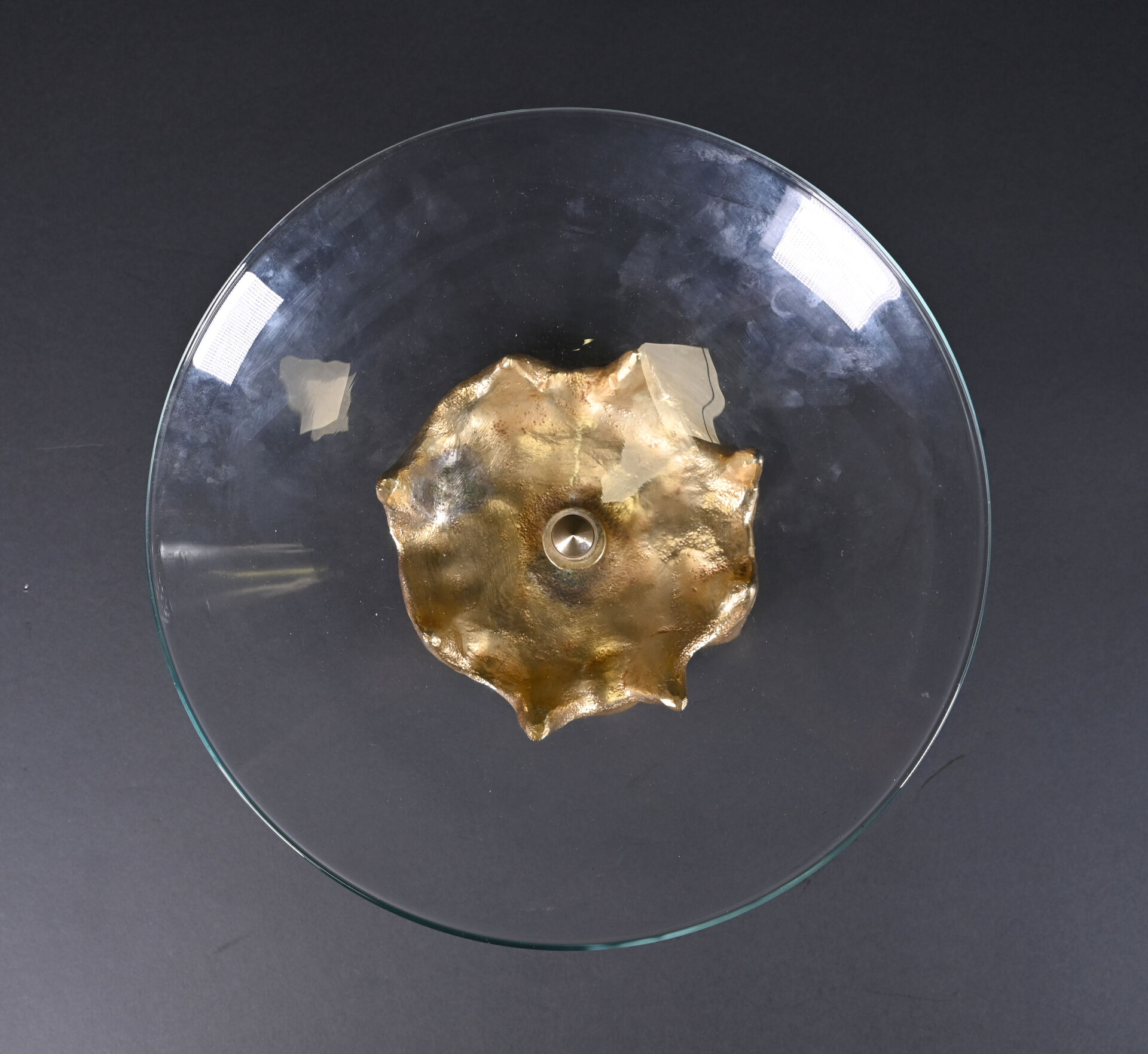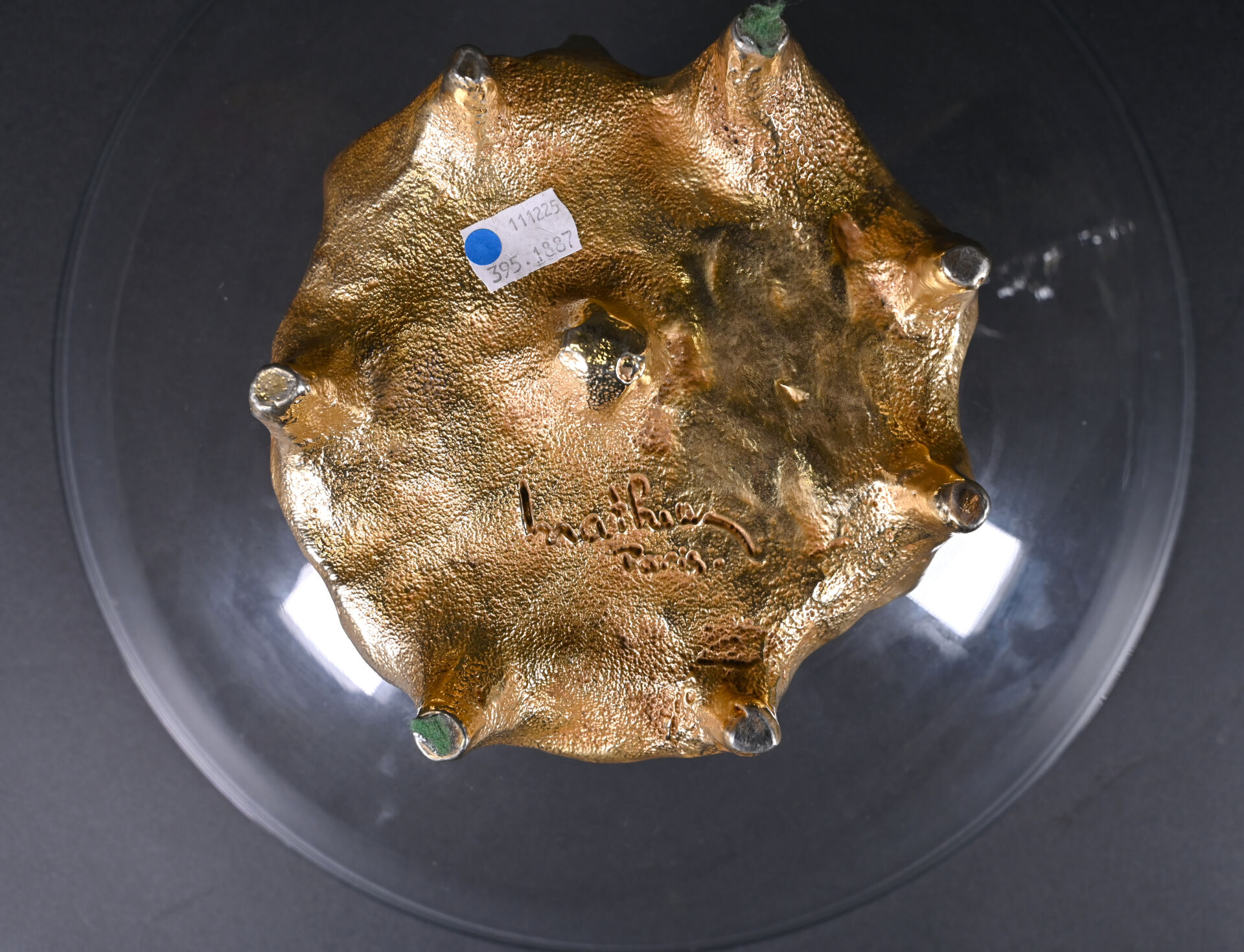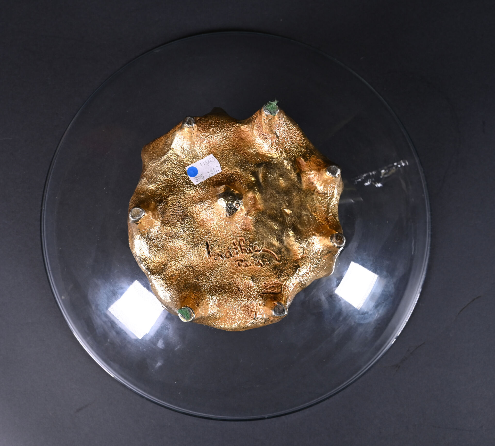 Georges MATHIAS, Paris. Coupe sur pied en verre à piétement de forme libre en bronze doré. Signée au dessous. Haut. : 12 cm – Diam. : 35 cm.