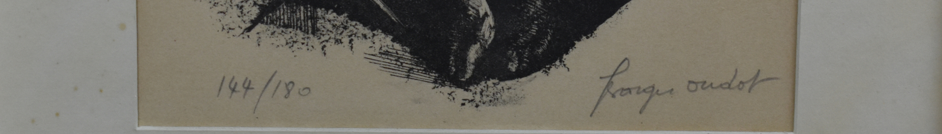 Georges OUDOT Georges (Chaumont, 1928 – Besançon, 2004). Marie LAFORÊT et Nu recroquevillé. Deux gravures signées en bas à droite et an bas à gauche. Numérotées 87/300 et 144/180.La première avec dédicace « Meilleurs voeux de bonne année » au dos par l’artiste. 29,5 x 22 cm et 26 x 20,5 cm.