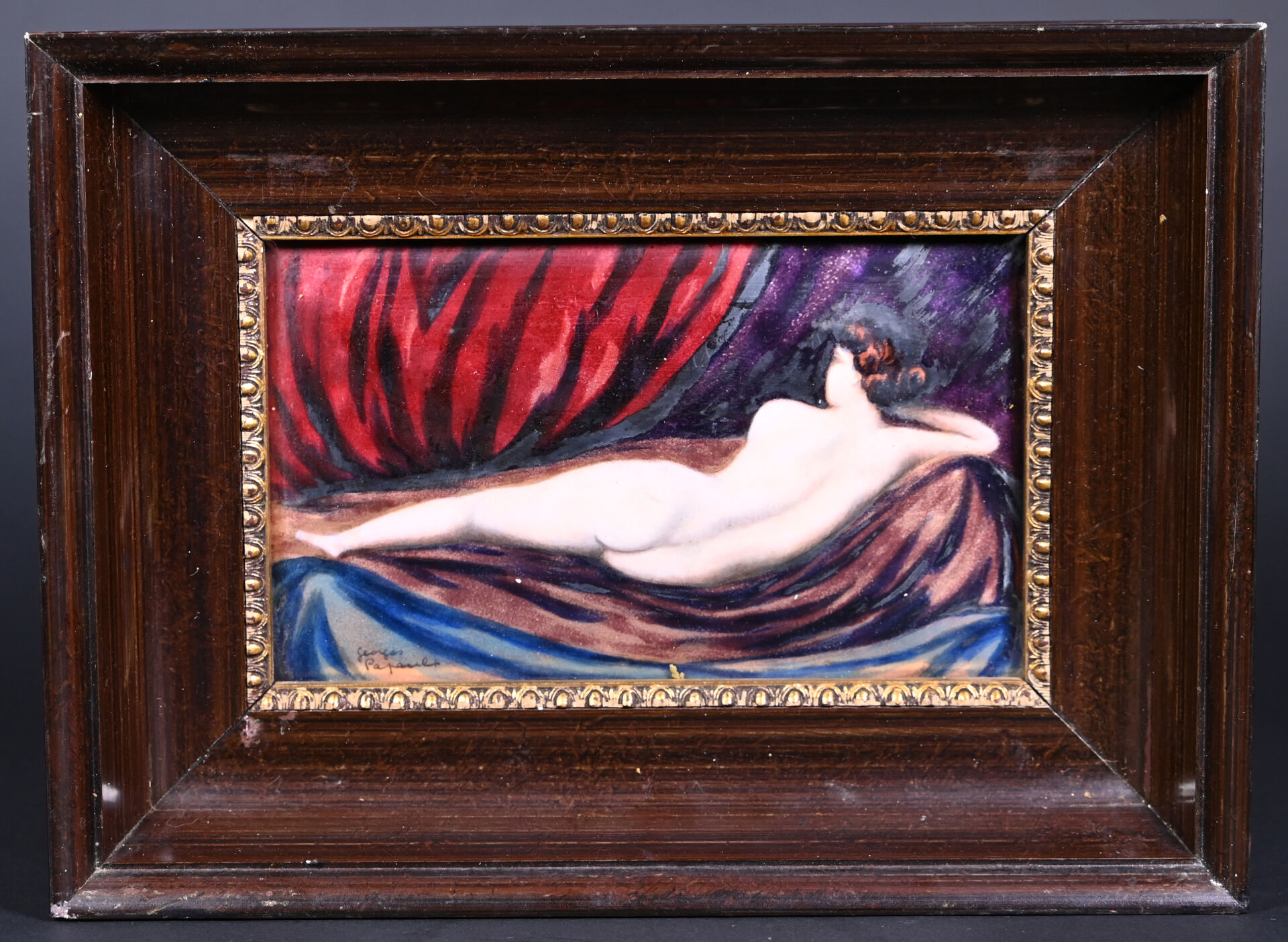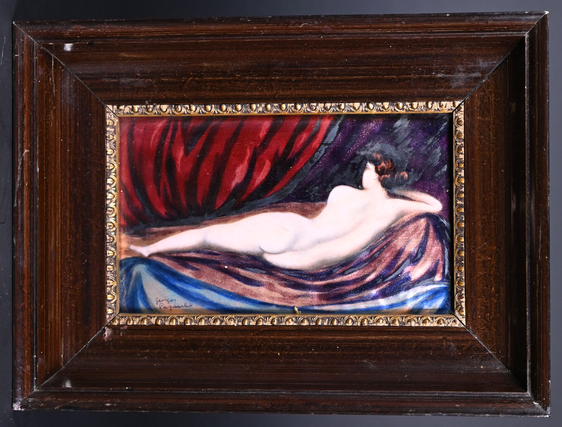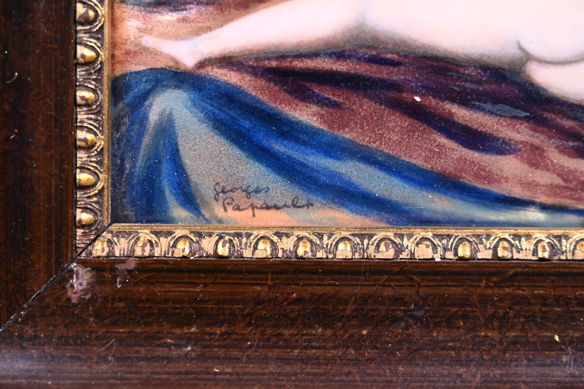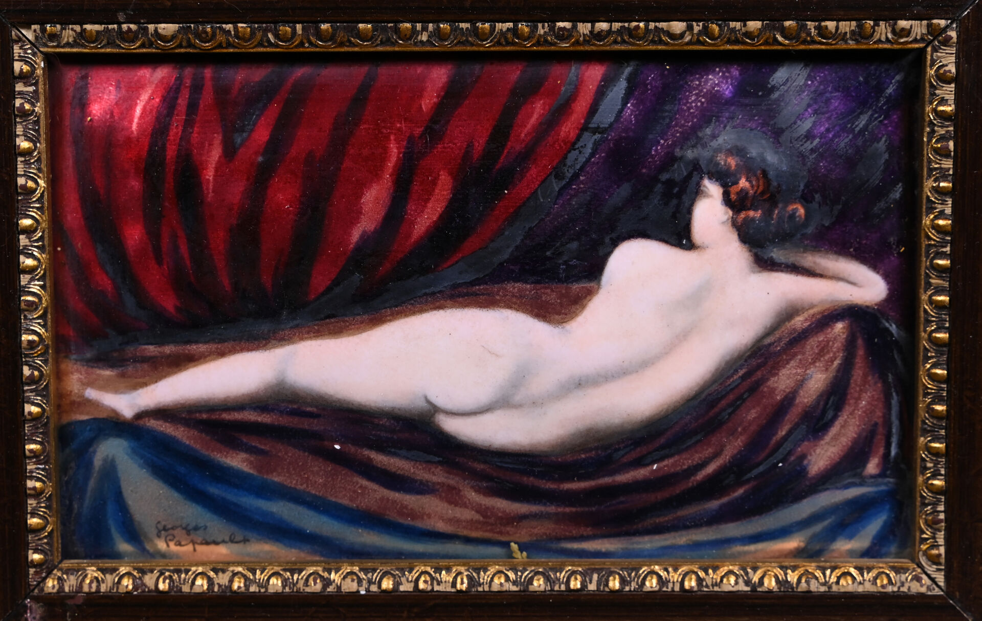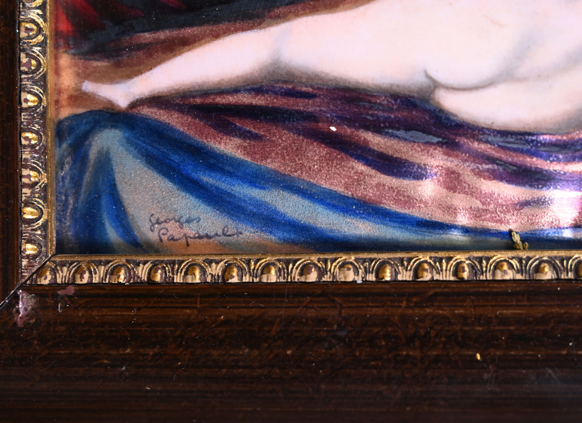 Georges PAPAULT à Limoges (XXe siècle). Plaque émaillée représentant une odalisque. Signée. 12,5 x 20,5 cm. Au dos étiquette.