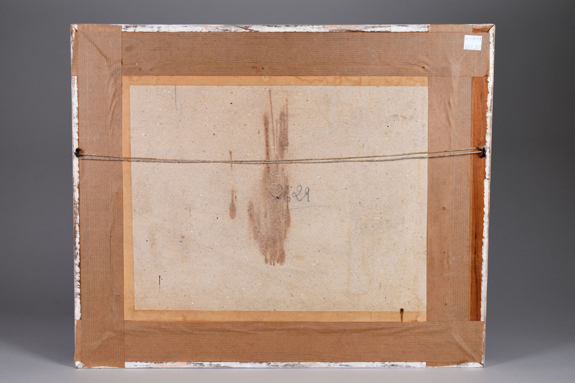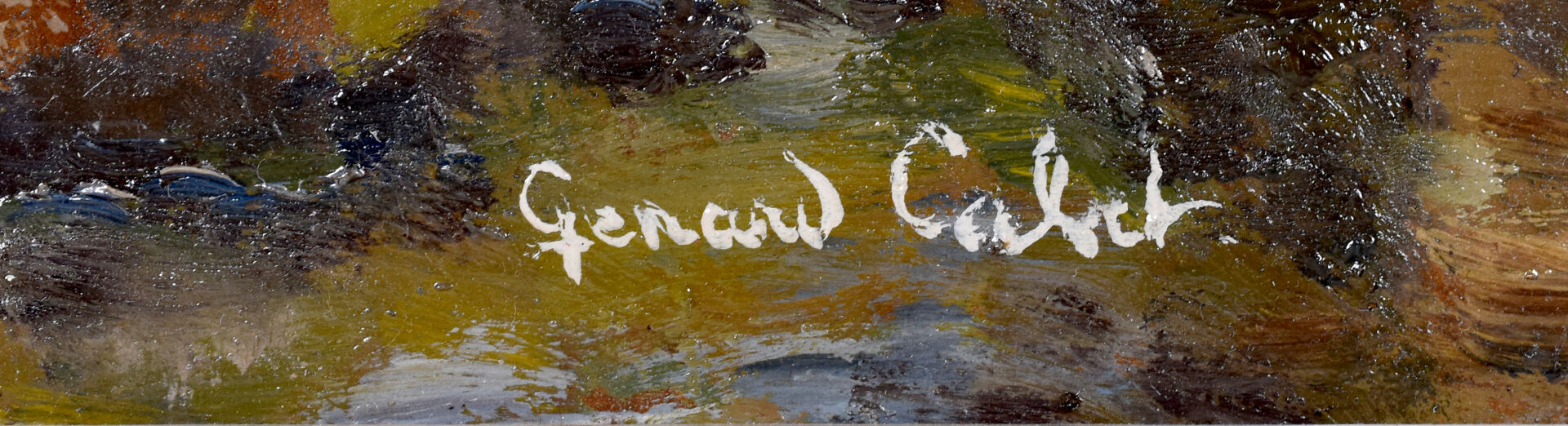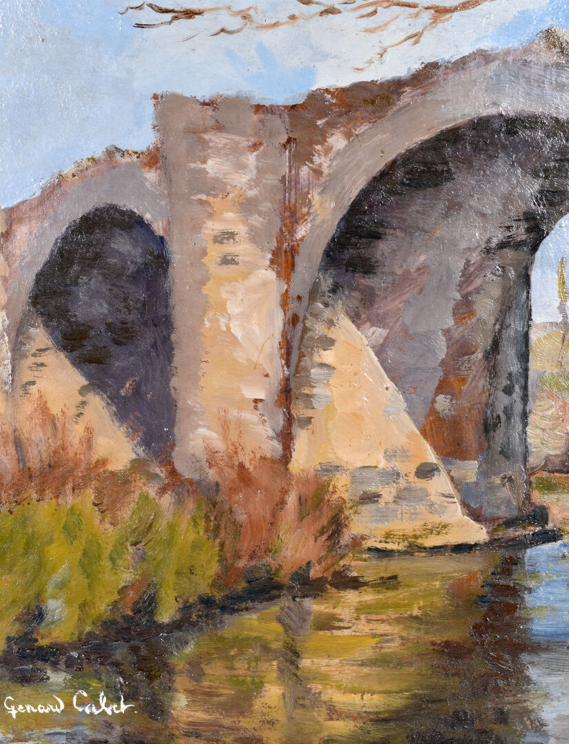 Gérard CALVET (1926-2017). Le pont. Huile sur carton signée en bas à gauche (éclats). 30 x 38.5 cm.