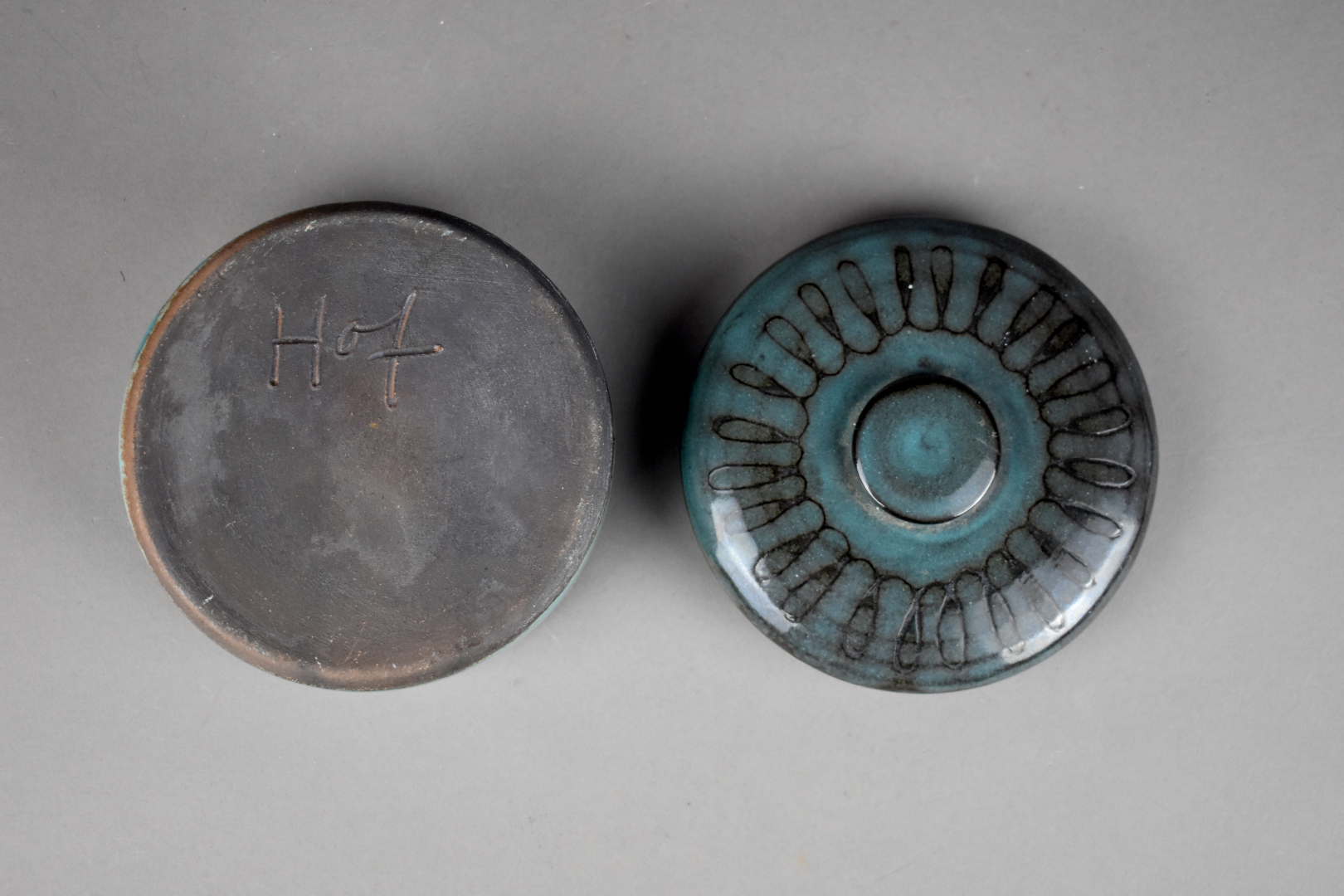 Gérard HOFMANN (1917-1965). Petit pot couvert en céramique émaillée turquoise et noire. Marqué. Haut. : 7,5 cm.