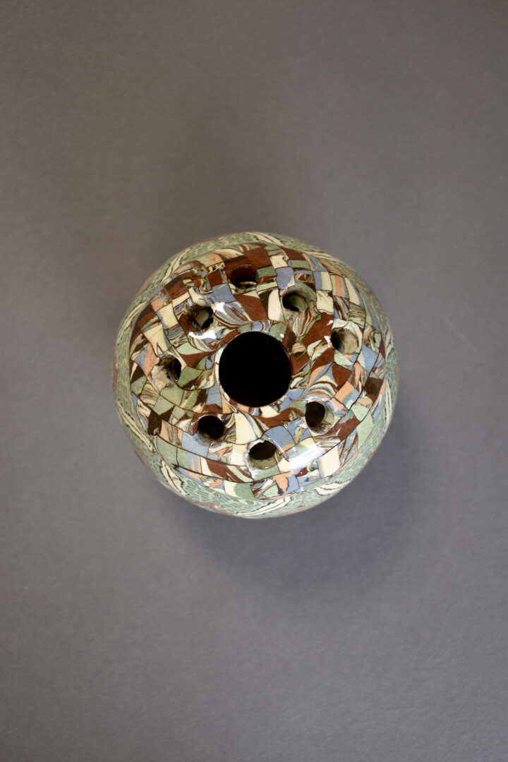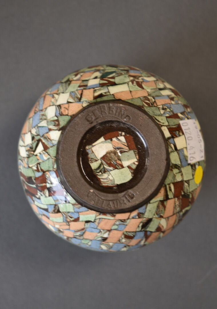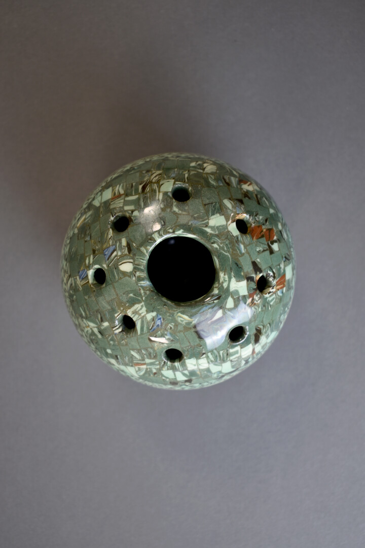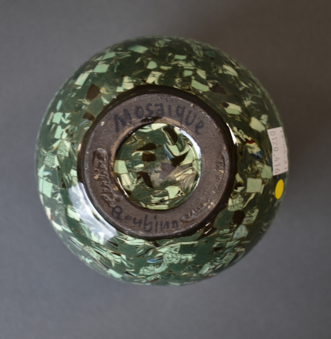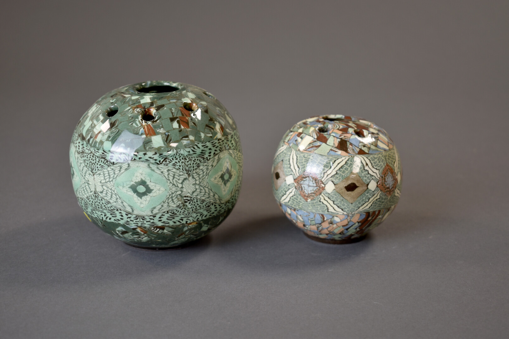 GERBINO à VALLAURIS. Deux vases boule pique-fleurs en terre mélée verte. Signés sous la base. Haut. :12 cm et Haut. : 9 cm.