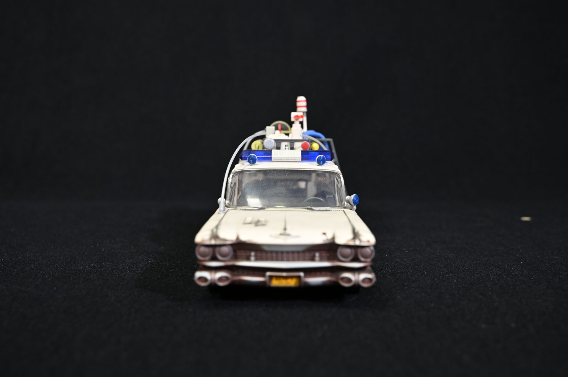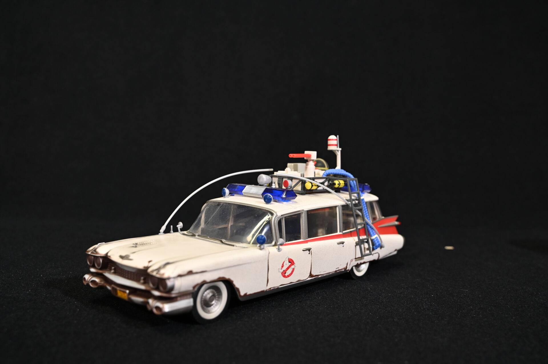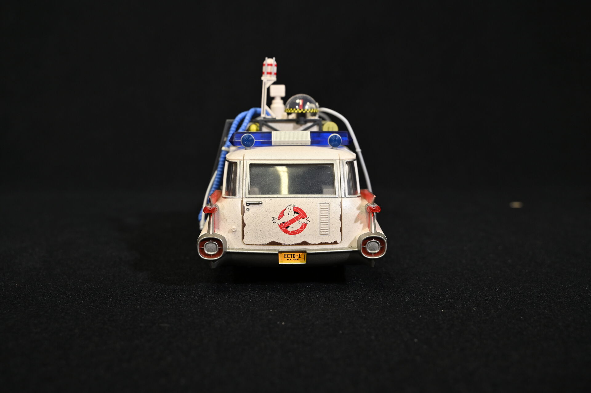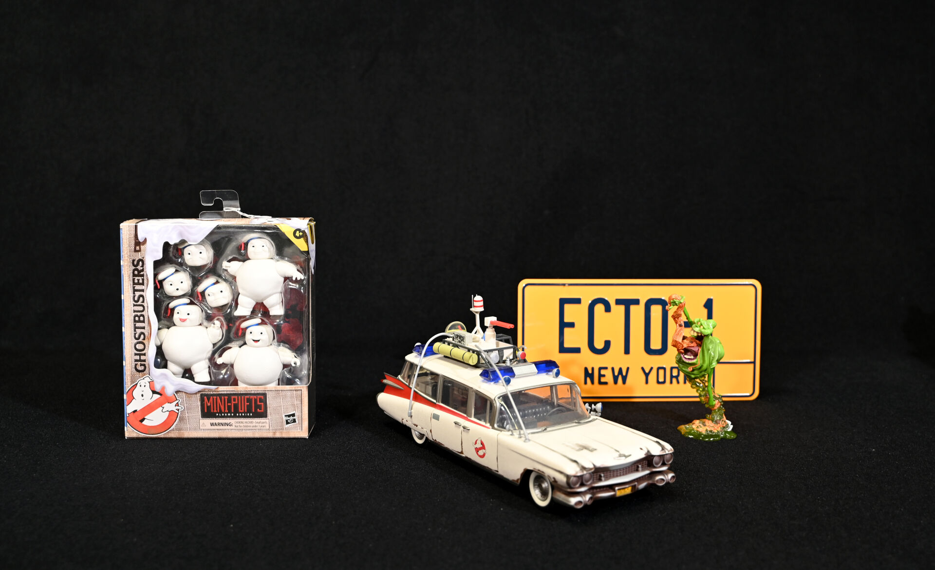 GHOSTBUSTERS – HASBRO. Ambulance Ecto-1. 2020. Dim. de la voiture : 16 x 35 x 12 cm. On joint une plaque d’immatriculation « ECTO-1 NEW YORK », une figurine d’un monstre et une boîte « Mini-Pufts Plasma Series » Hasbro contenant des figurines. 2021.