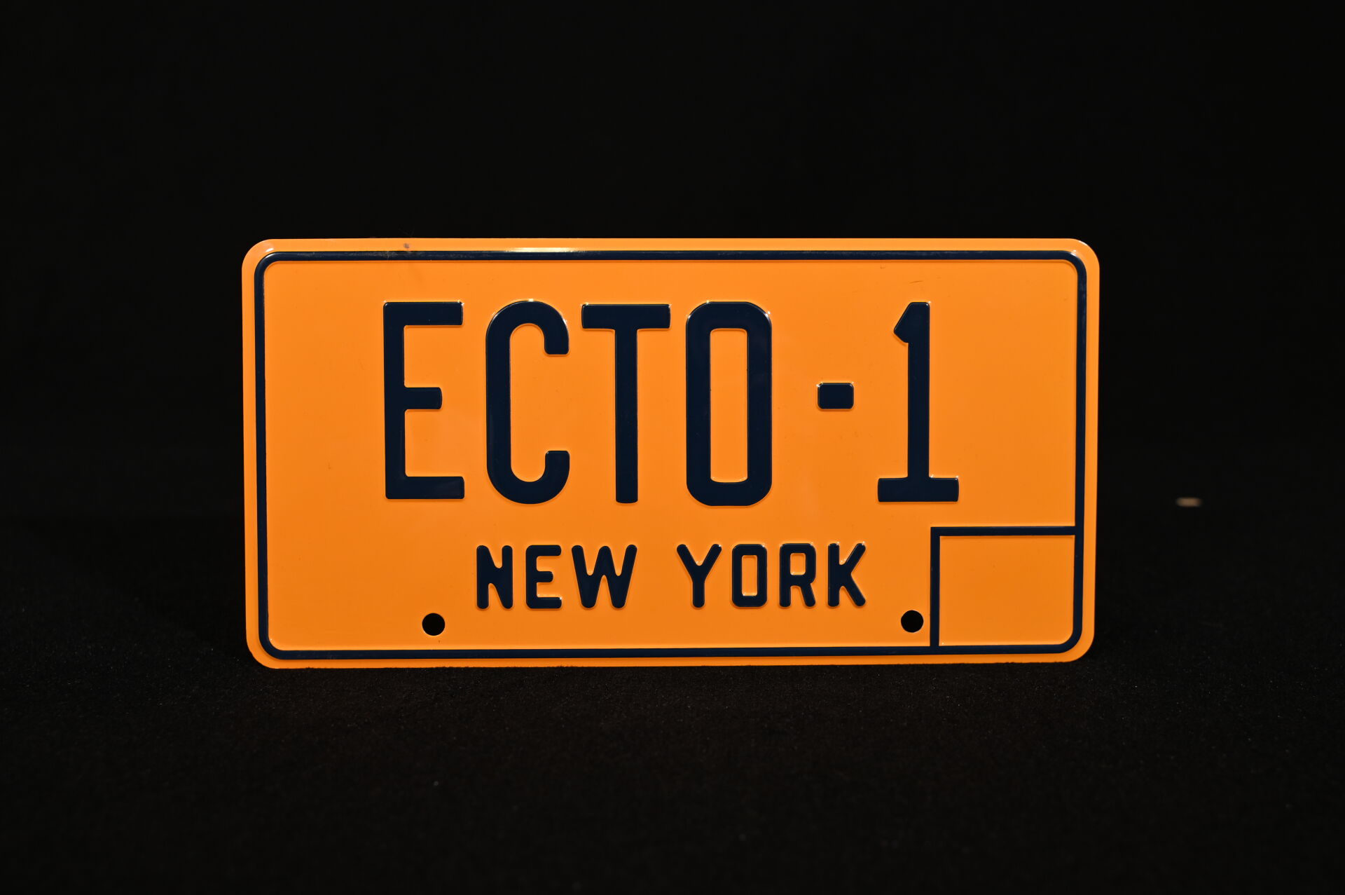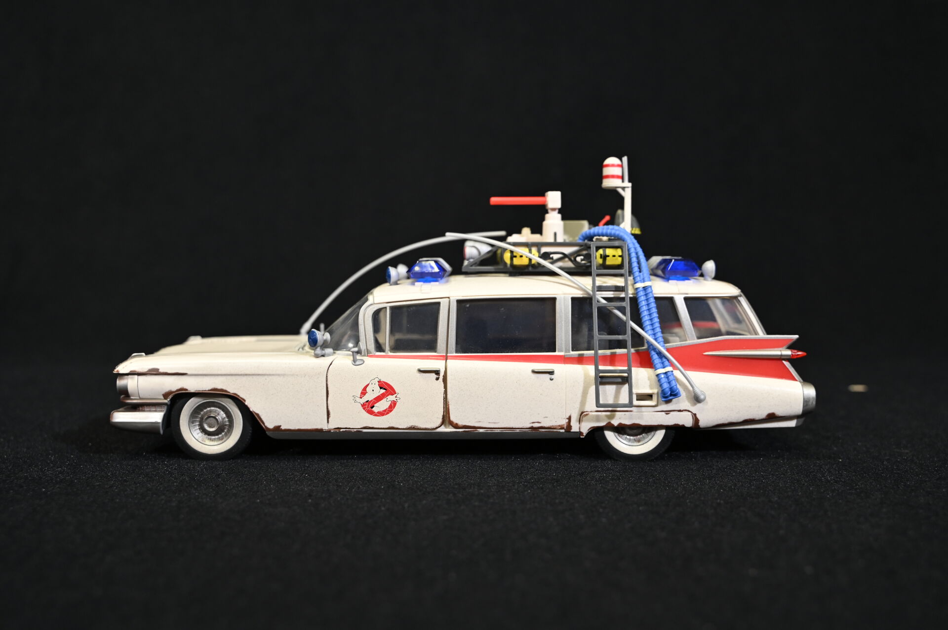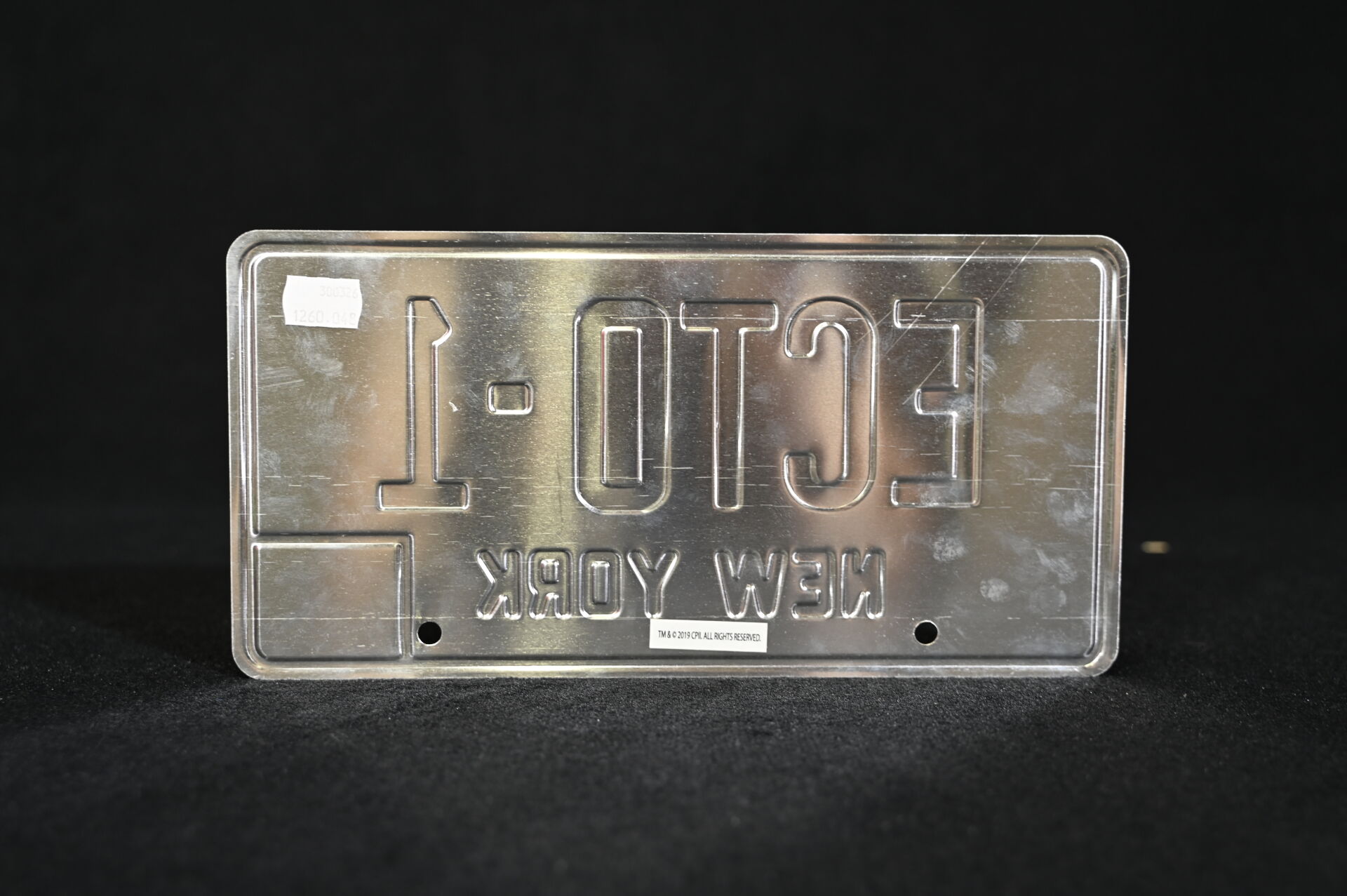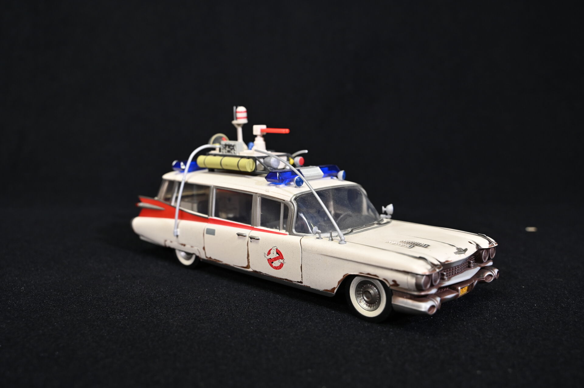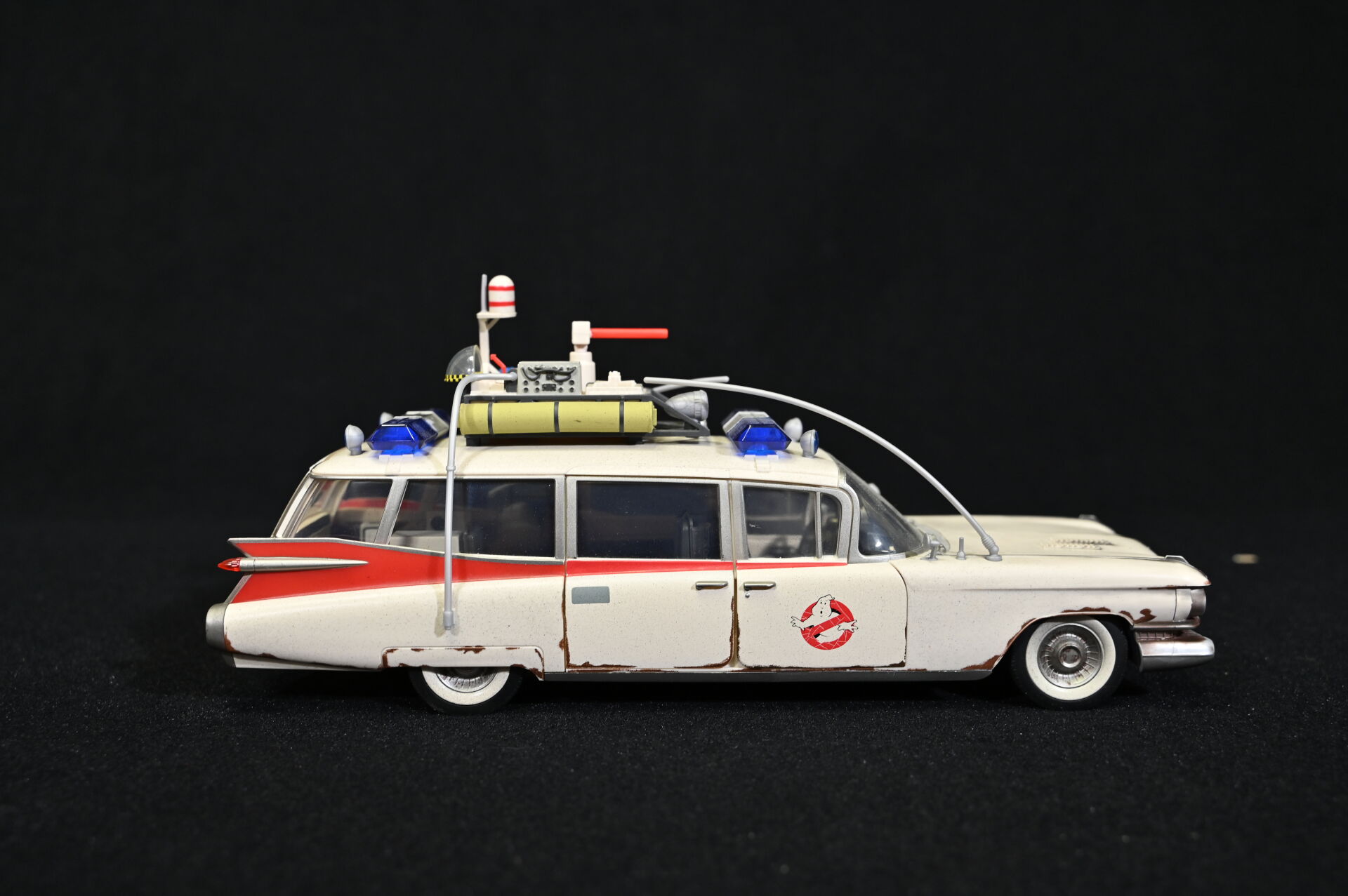 GHOSTBUSTERS – HASBRO. Ambulance Ecto-1. 2020. Dim. de la voiture : 16 x 35 x 12 cm. On joint une plaque d’immatriculation « ECTO-1 NEW YORK », une figurine d’un monstre et une boîte « Mini-Pufts Plasma Series » Hasbro contenant des figurines. 2021.