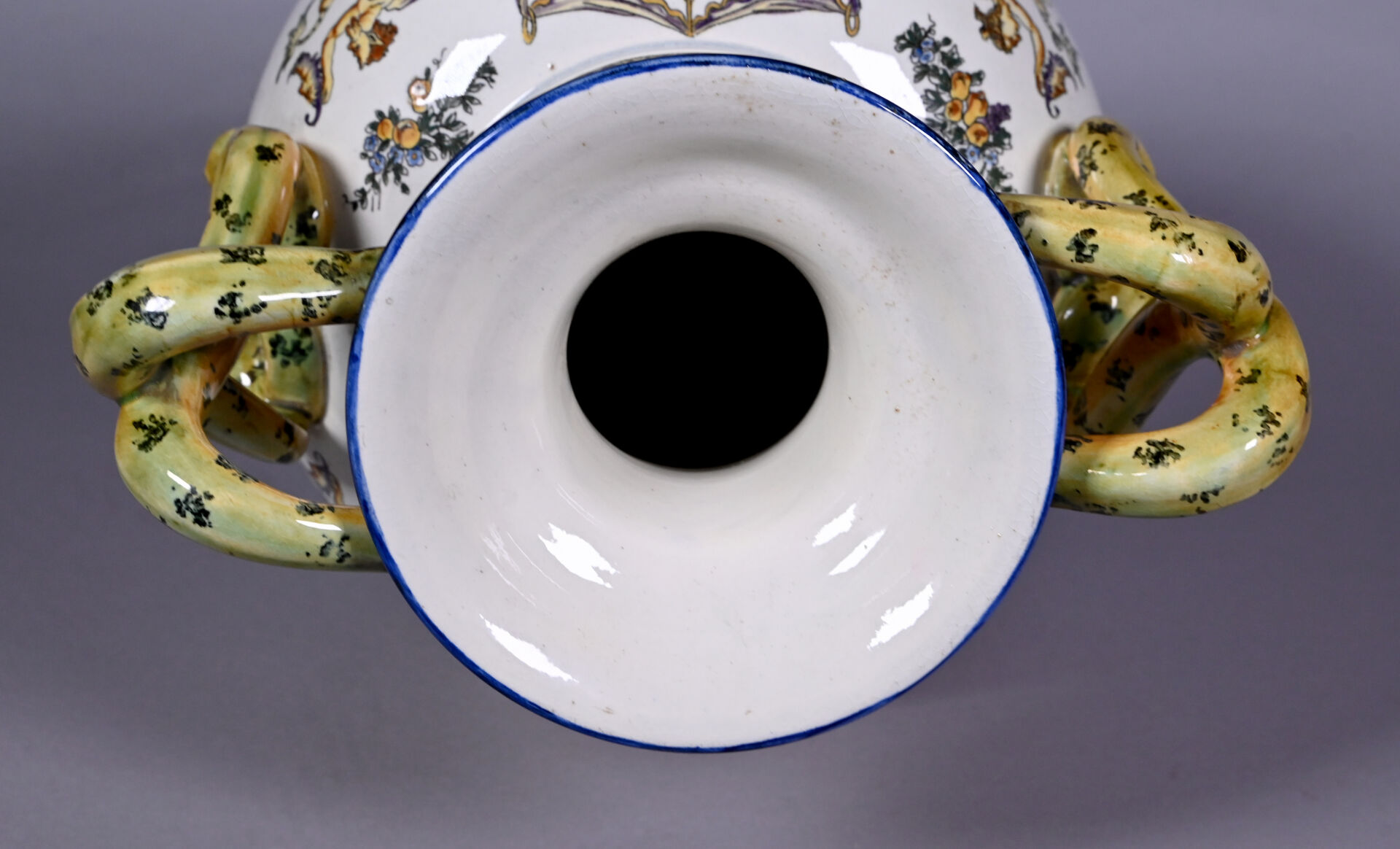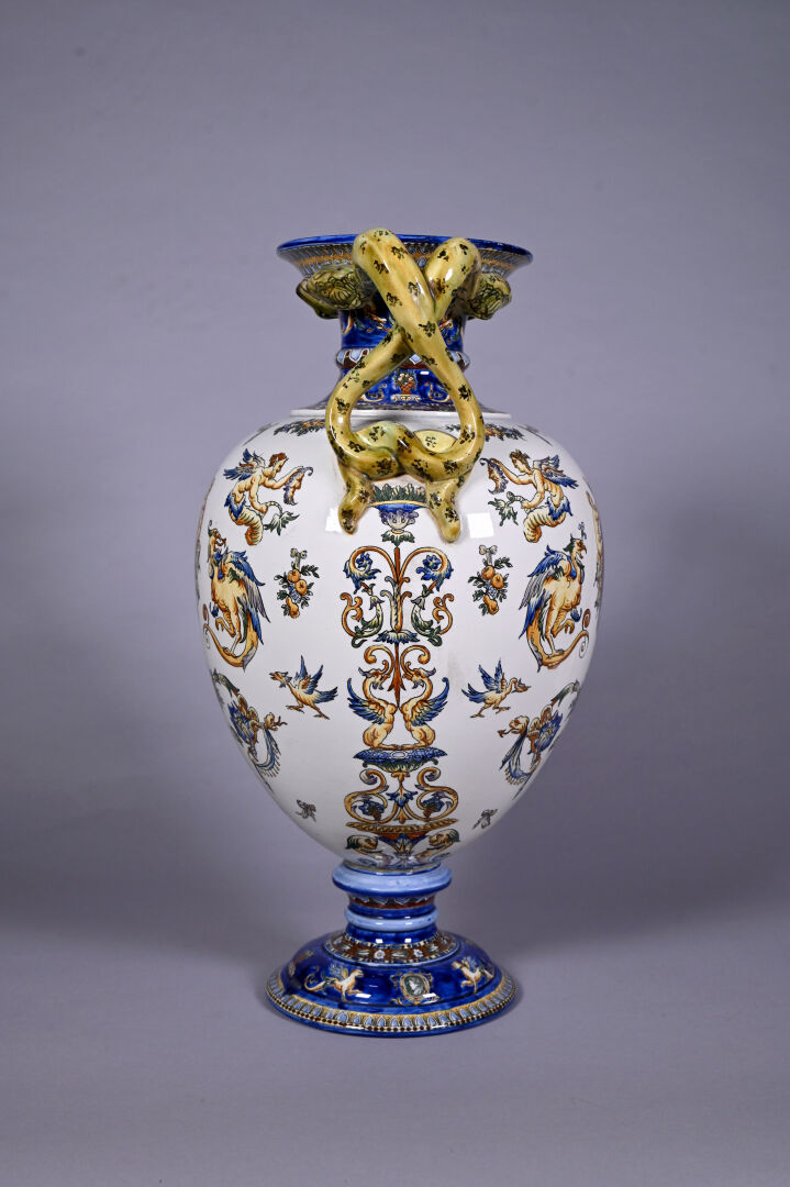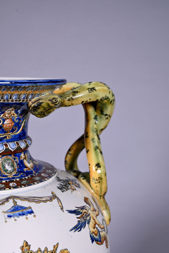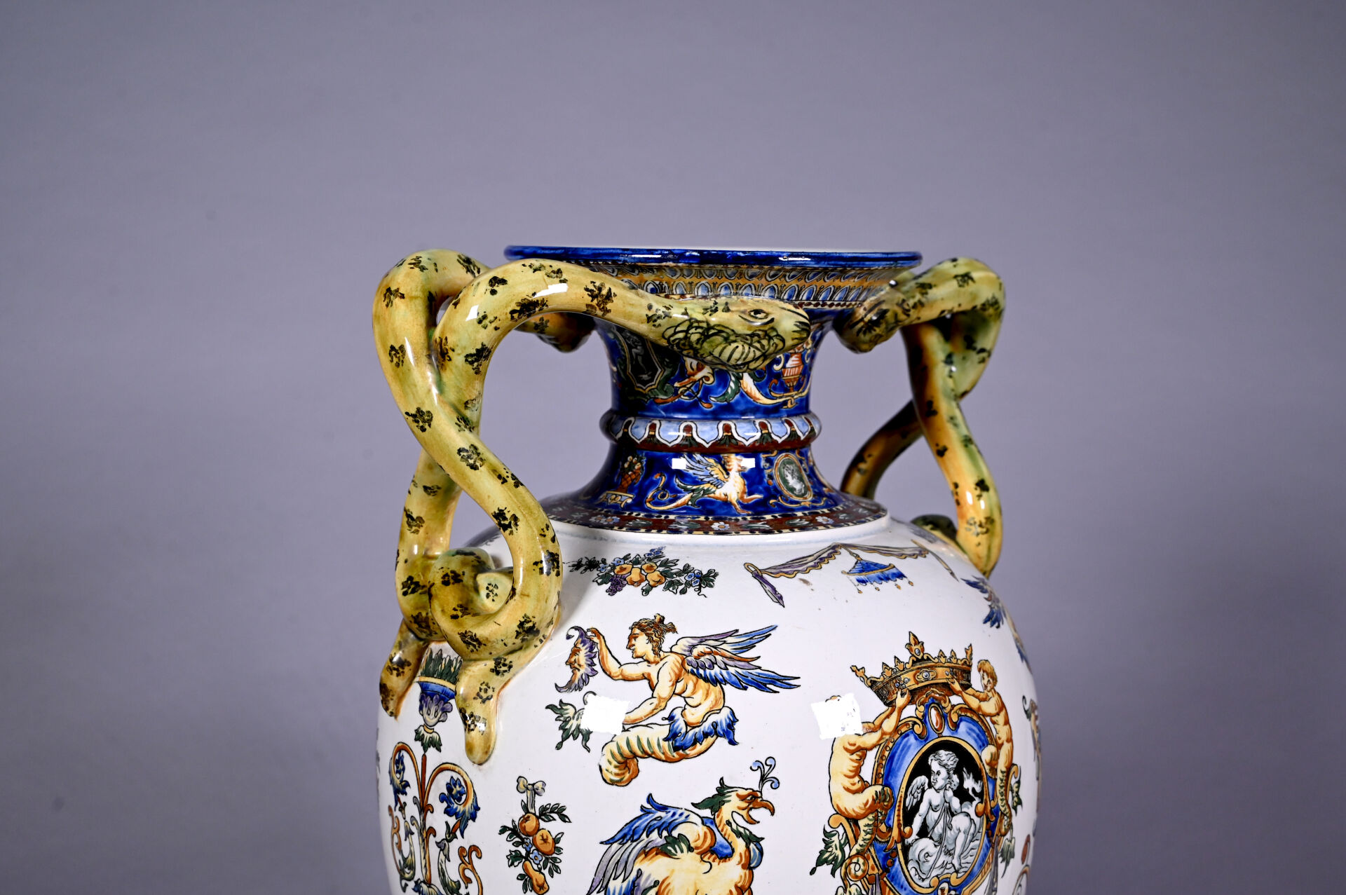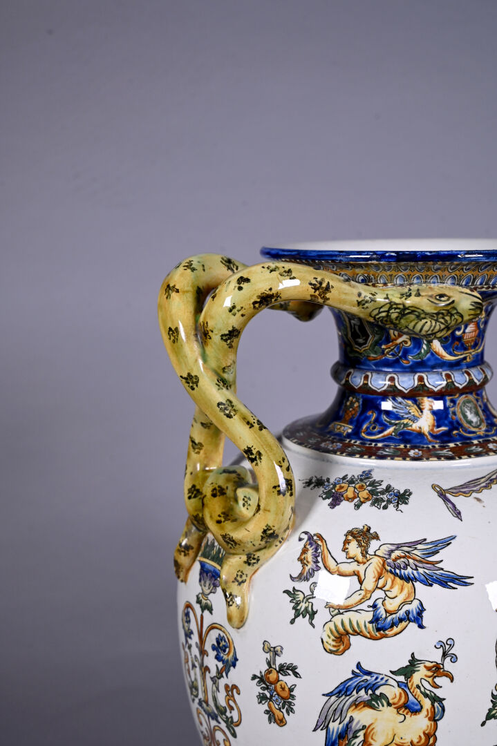 GIEN. Important vase ovoïde sur piédouche, en faïence, les anses formées de serpents entrelacés. Décor dans le goût de la Renaissance. Marqué au dessous. Haut. : 50,5 cm.
