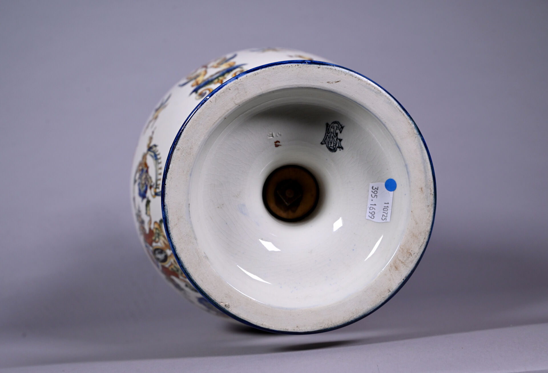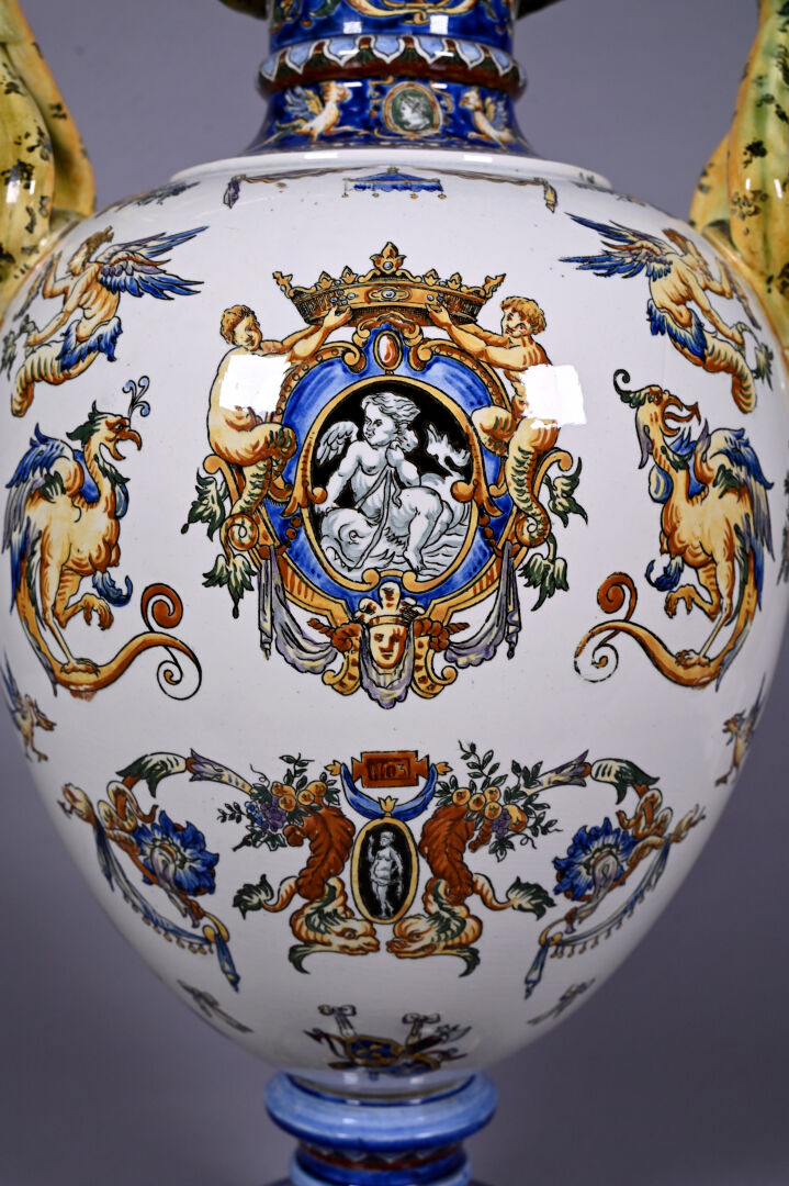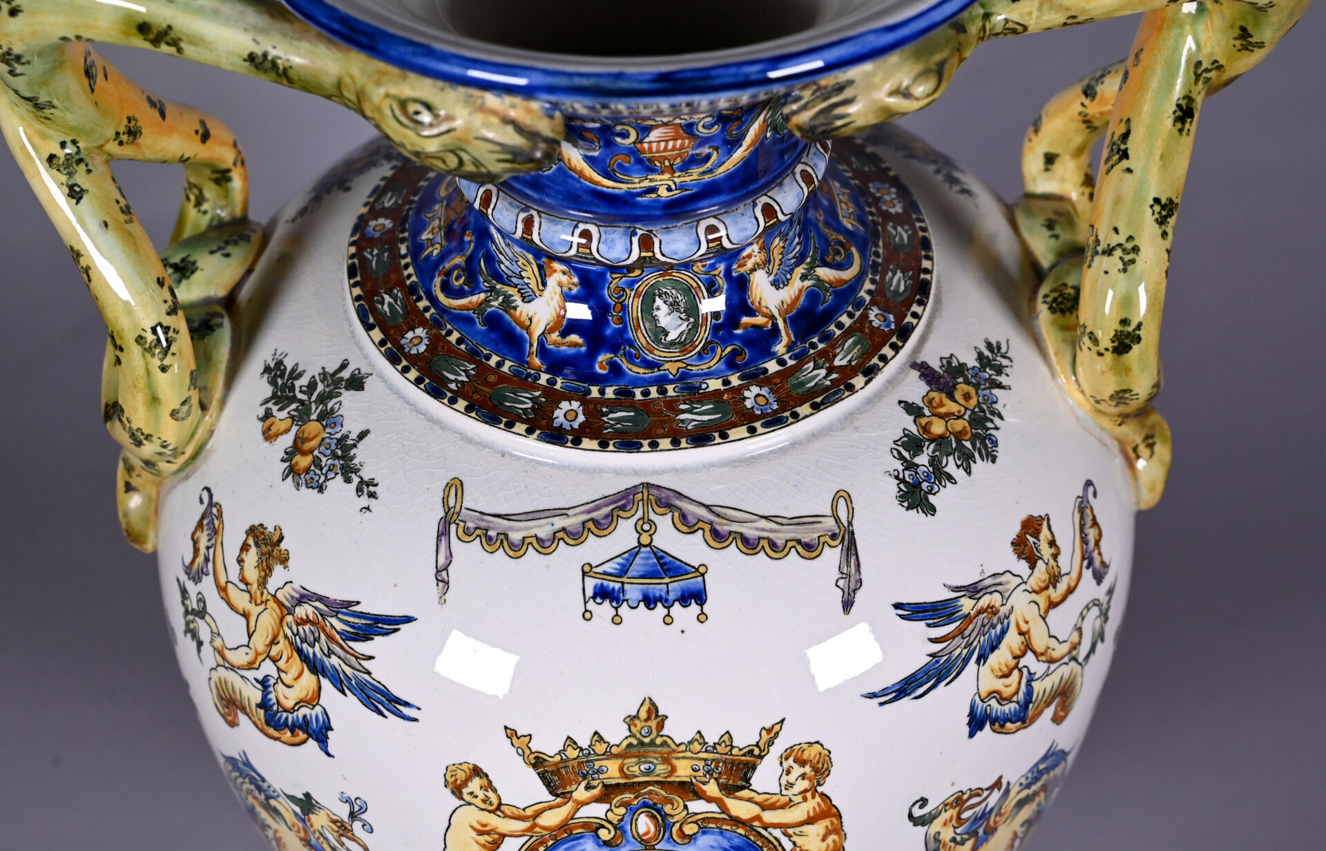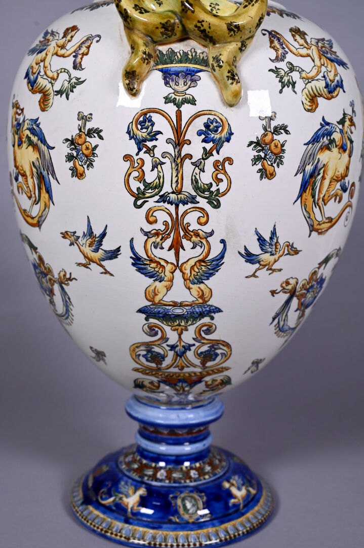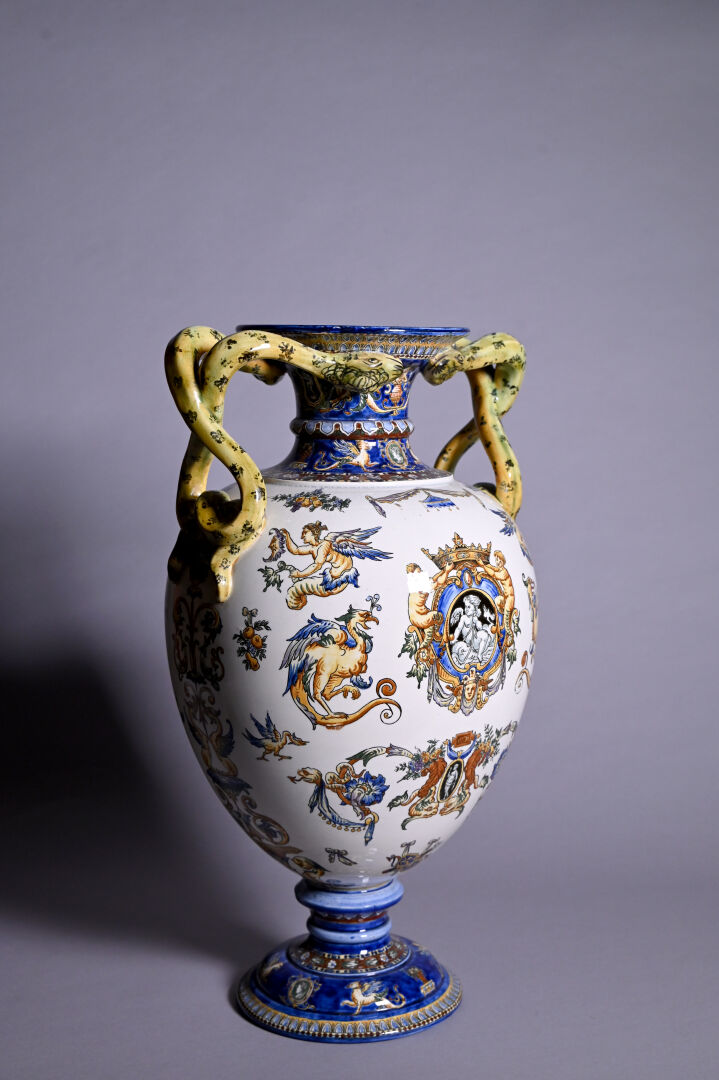 GIEN. Important vase ovoïde sur piédouche, en faïence, les anses formées de serpents entrelacés. Décor dans le goût de la Renaissance. Marqué au dessous. Haut. : 50,5 cm.