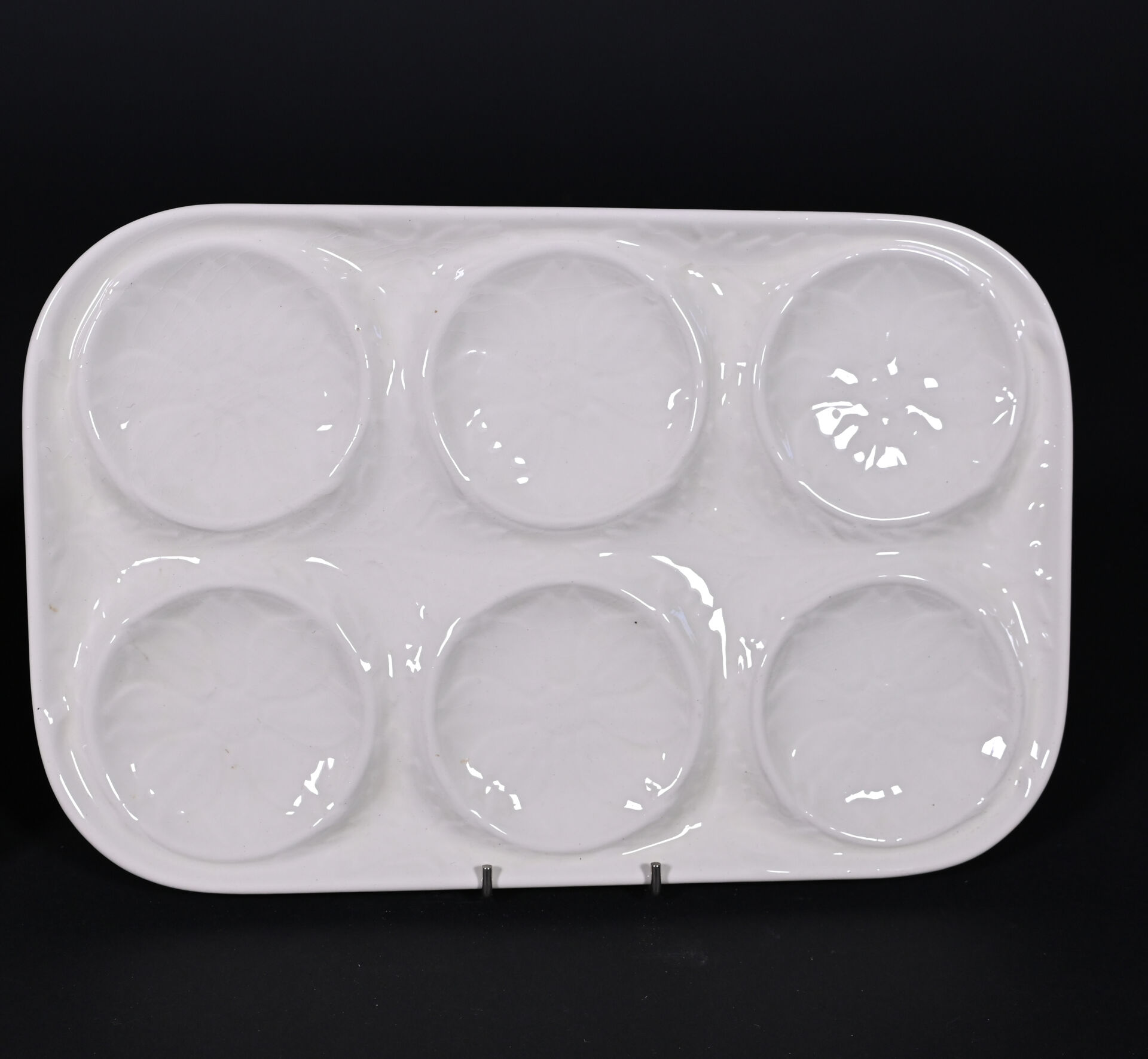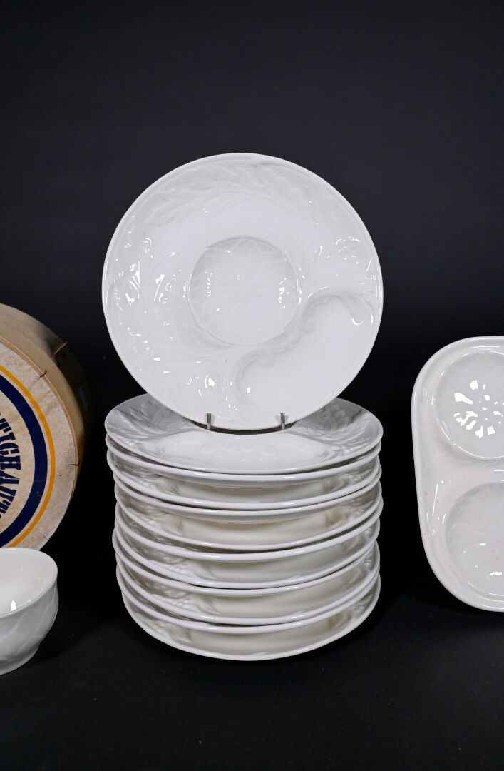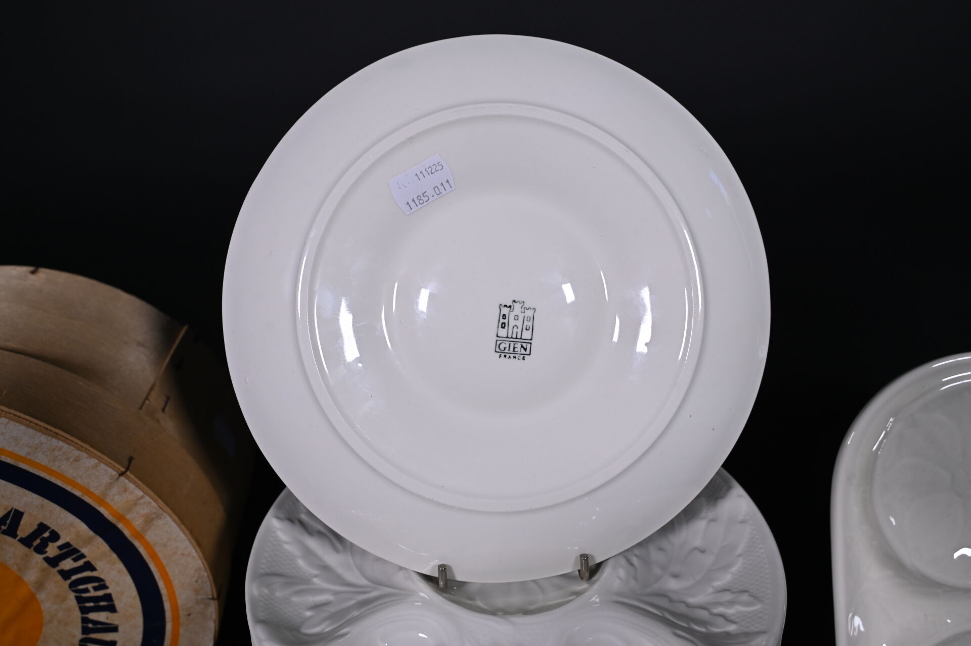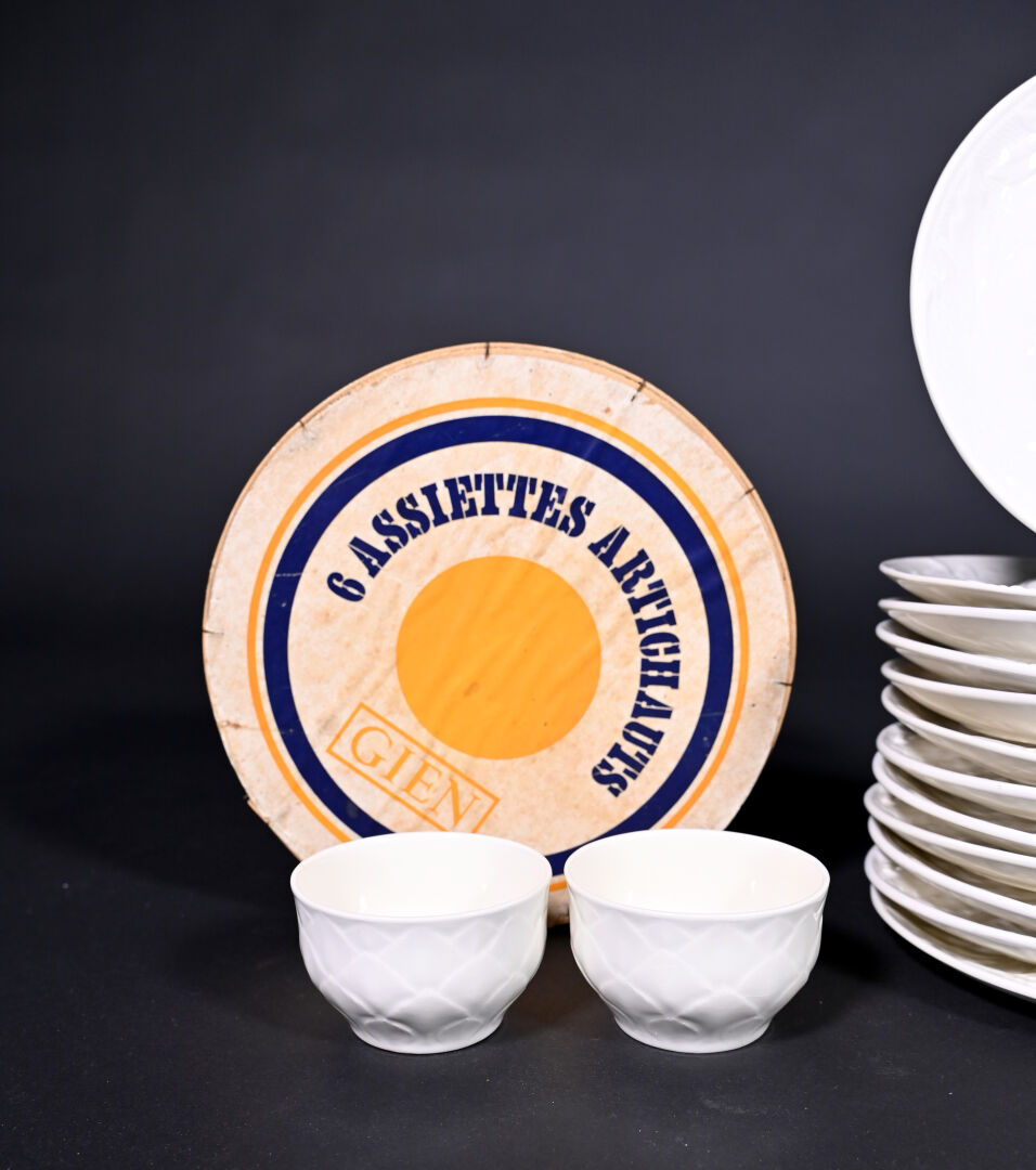 GIEN. Service à artichauts en faïence à décor ton sur ton de feuilles et fleurs en léger relief comprenant 12 assiettes, 1 plat et 2 bols. Marqués.