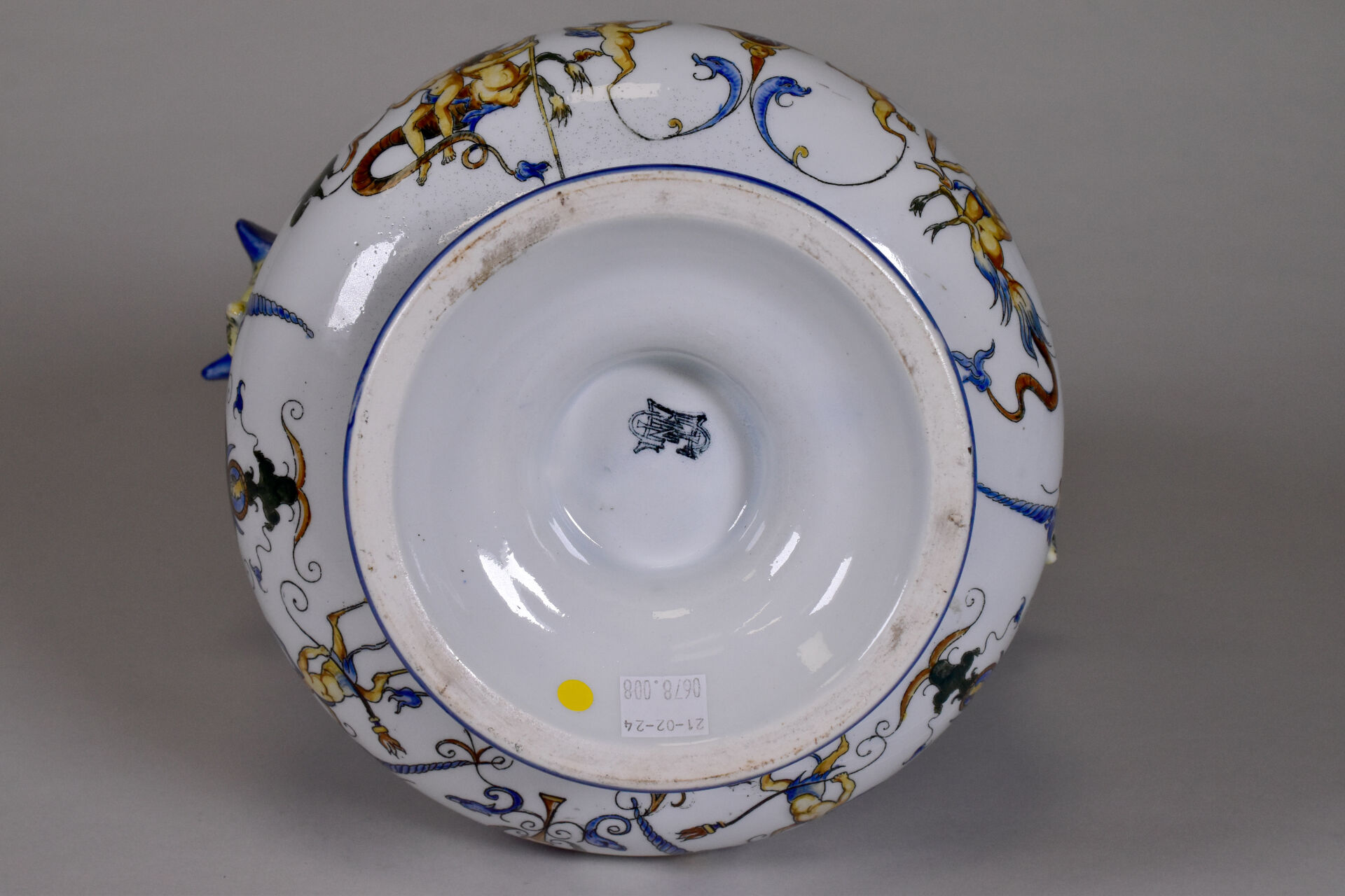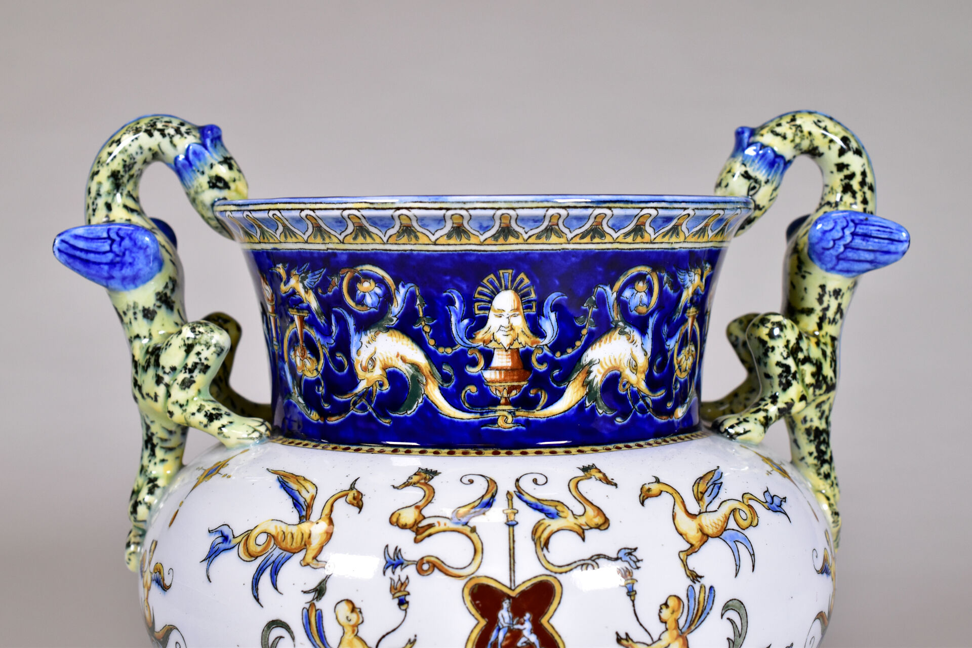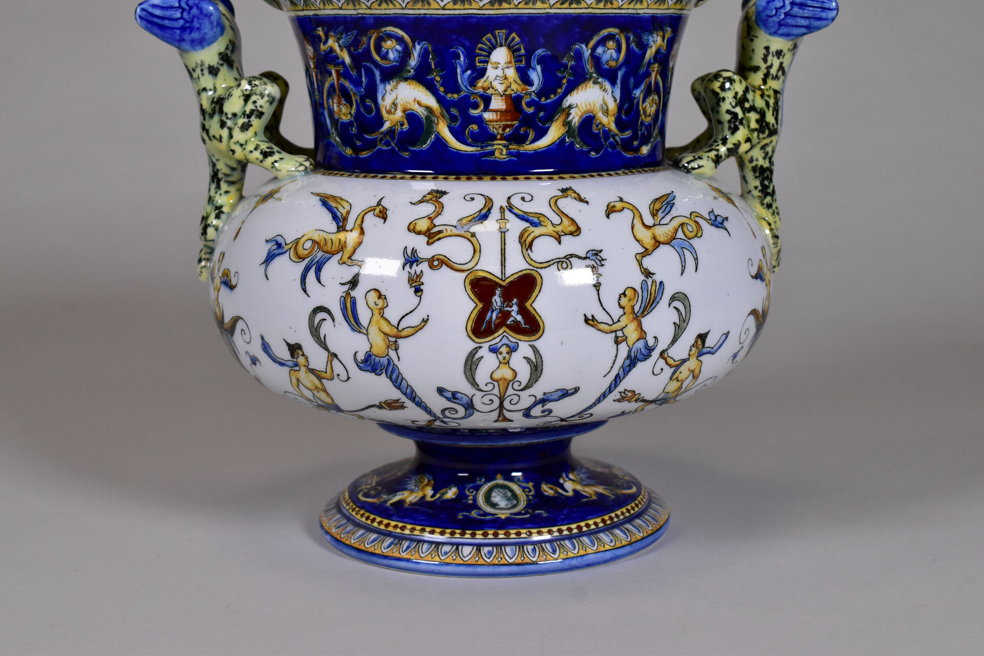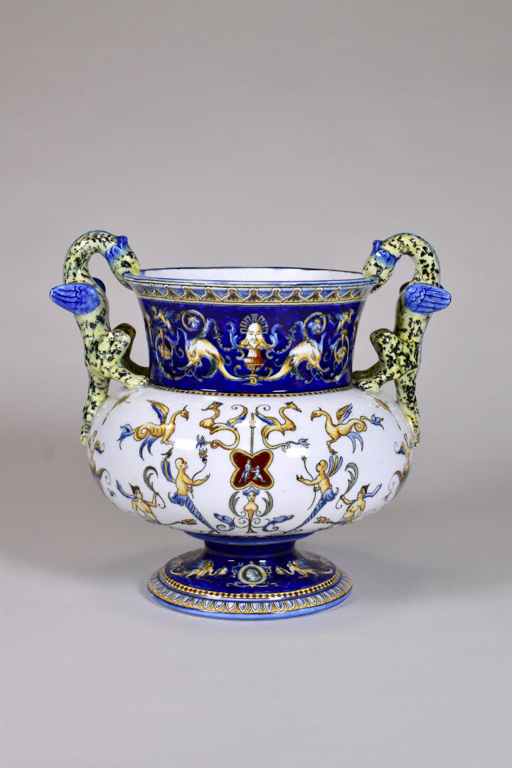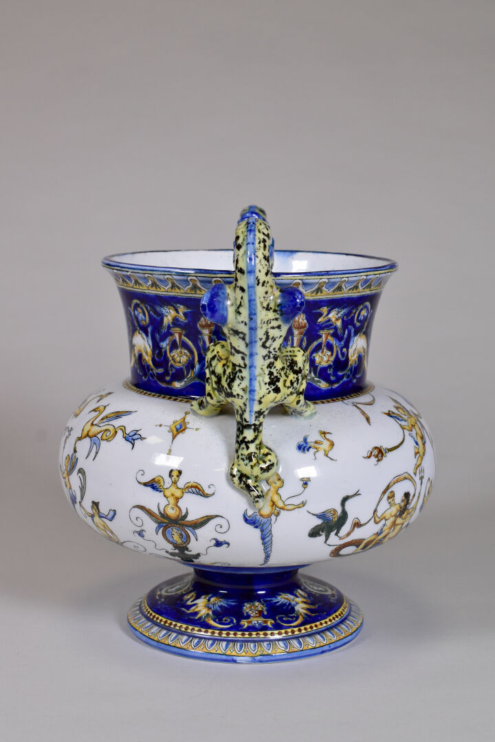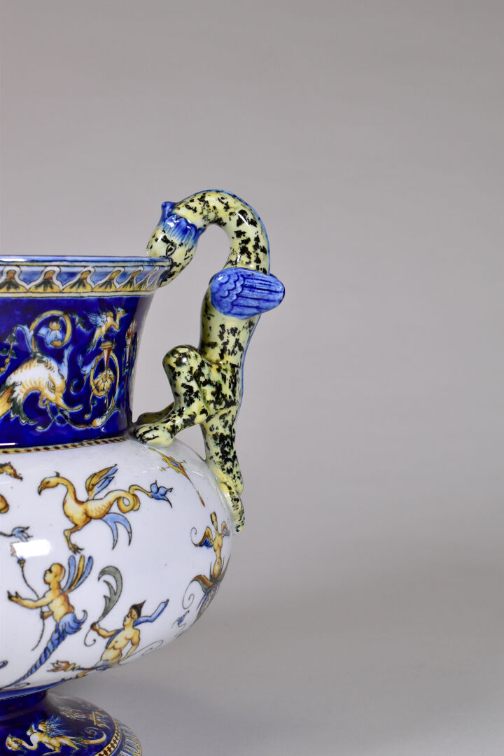 GIEN. Vase médicis en faïence à décor à la Berain, les anses formées de griffons. XXe siècle. Marqué. Haut. : 26 cm.