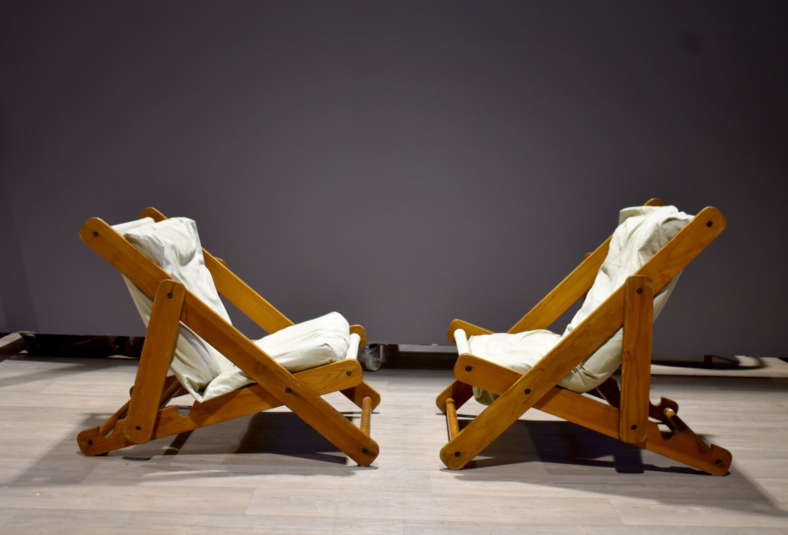 Gillis LUNDGREN (1929-2006) Paire de larges fauteuils bains de soleil en pin à garniture de tissu beige modèle Kon Tiki (quelques légères usures) Haut. : 84 cm.