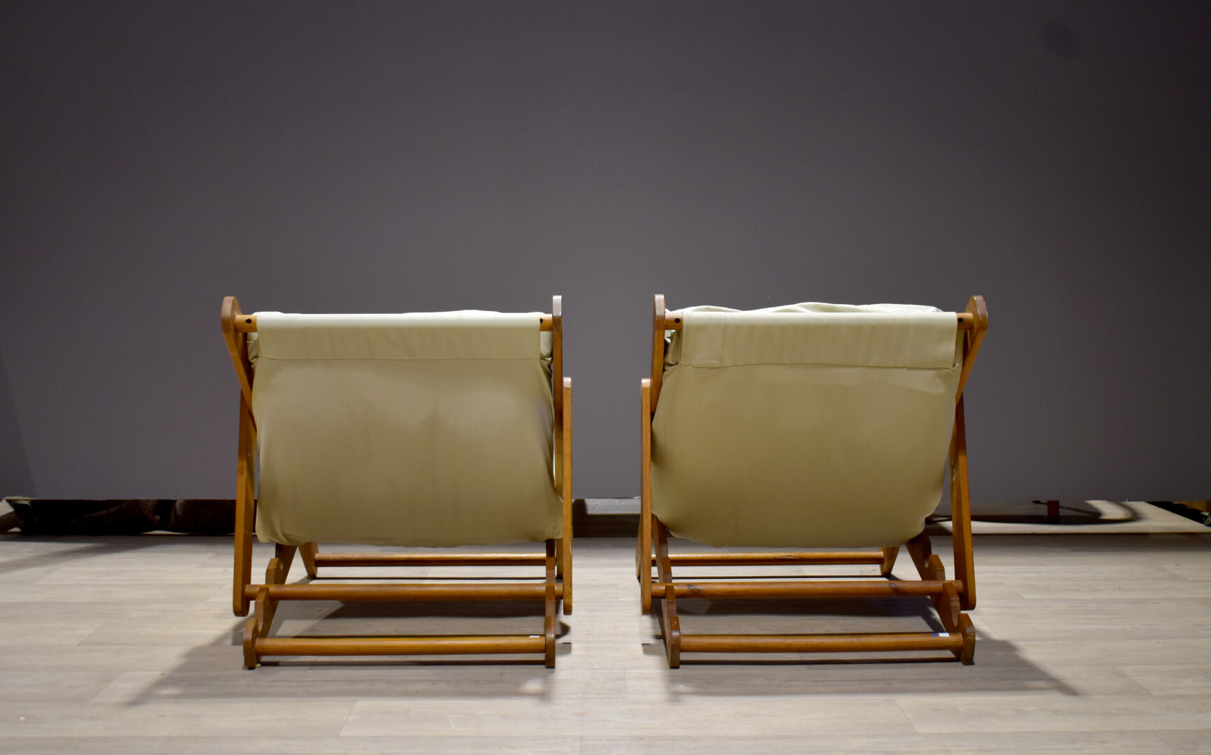 Paire de larges fauteuils bains de soleil en pin à garniture de tissu beige modèle Kon Tiki (quelques légères usures)