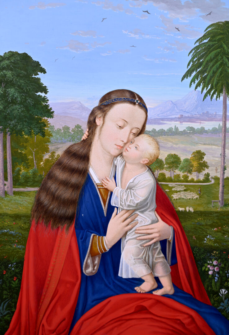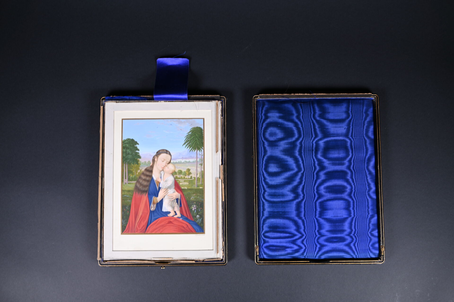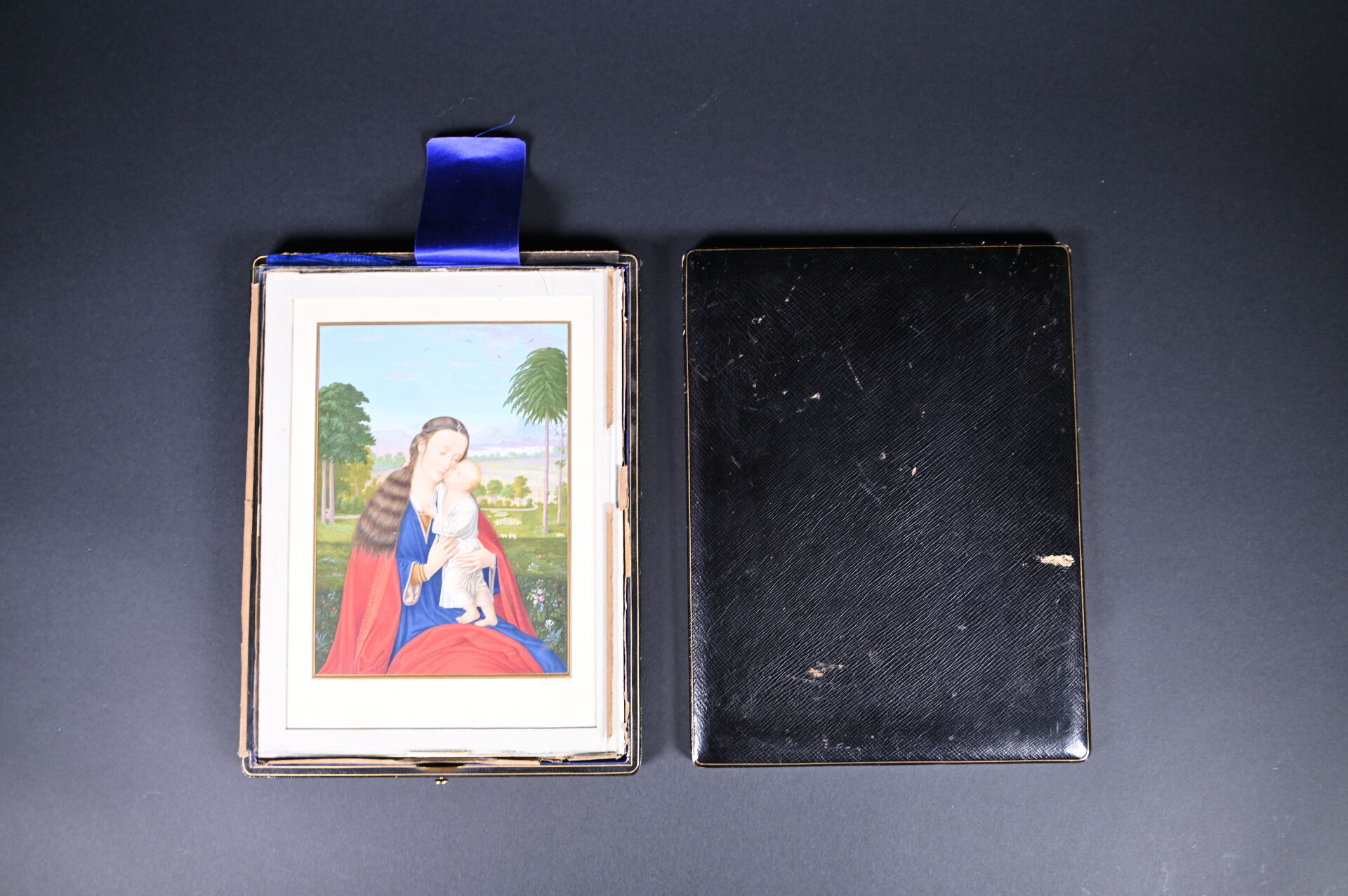 Gio PROSDOCIMI (XIXe siècle). Vierge à l’enfant. Gouache signée en bas à droite. Présentée dans un étui gainé de maroquin noir à filets or, et à intérieur en satin bleu formant chevalet (cassé). 25,2 x 18,1 cm à vue.