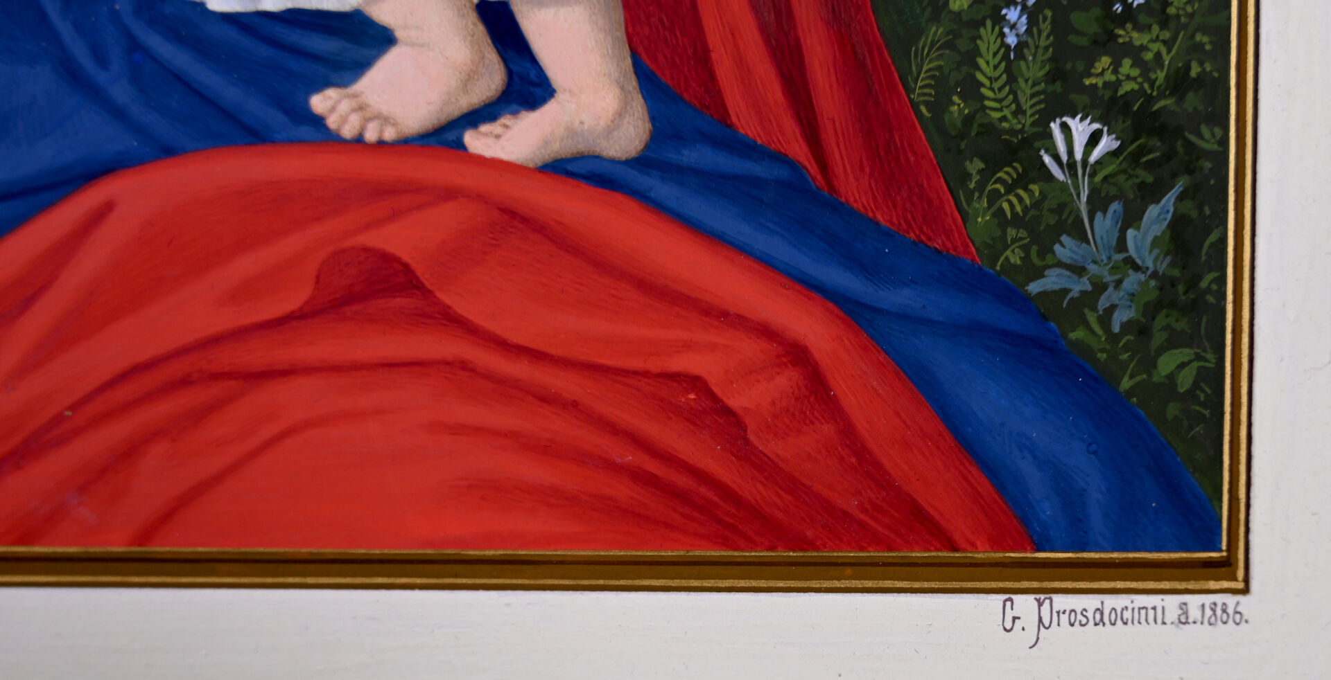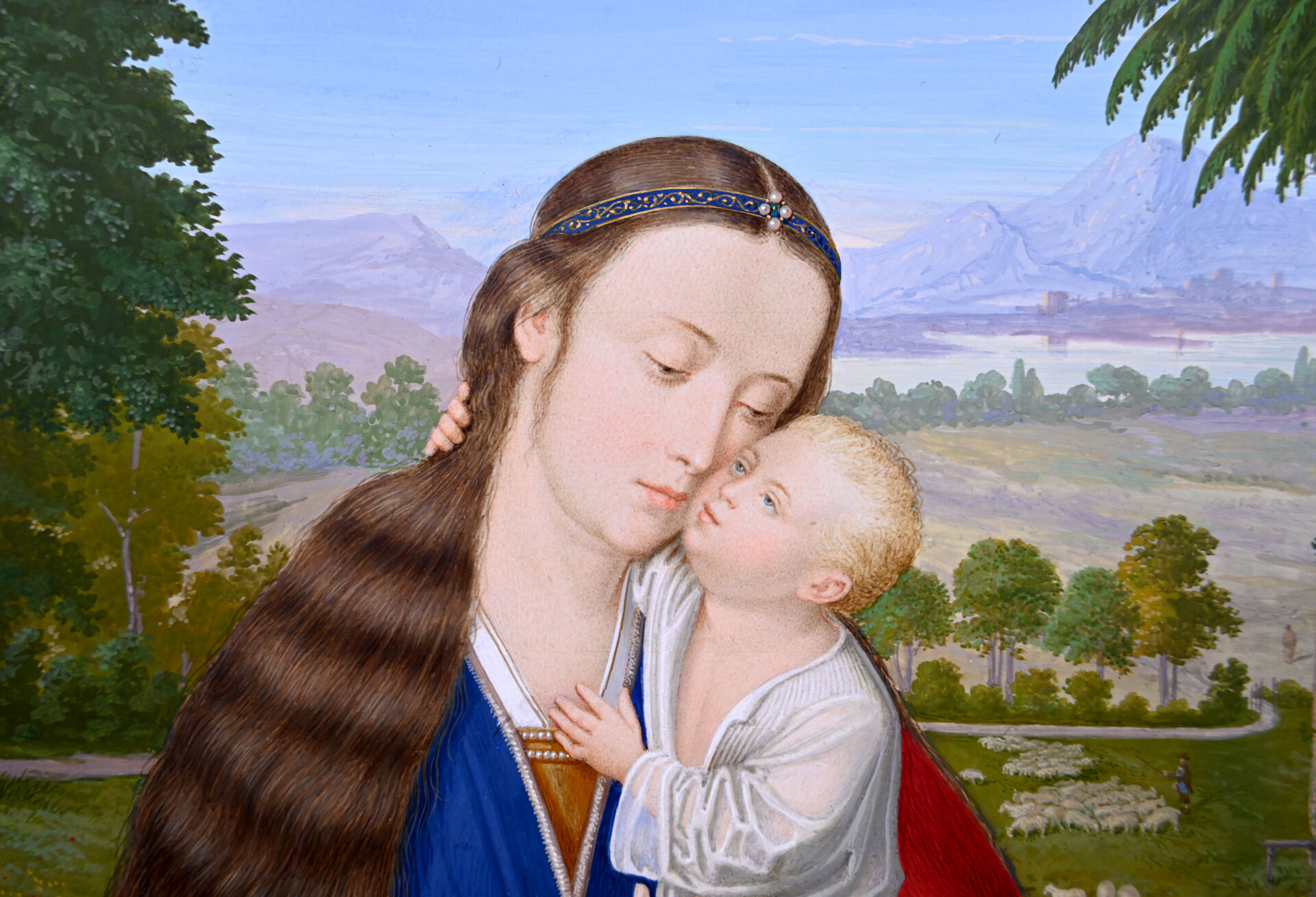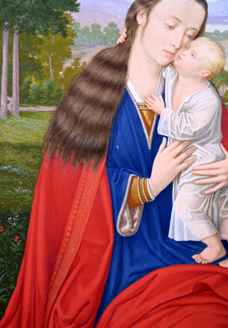 Gio PROSDOCIMI (XIXe siècle). Vierge à l’enfant. Gouache signée en bas à droite. Présentée dans un étui gainé de maroquin noir à filets or, et à intérieur en satin bleu formant chevalet (cassé). 25,2 x 18,1 cm à vue.