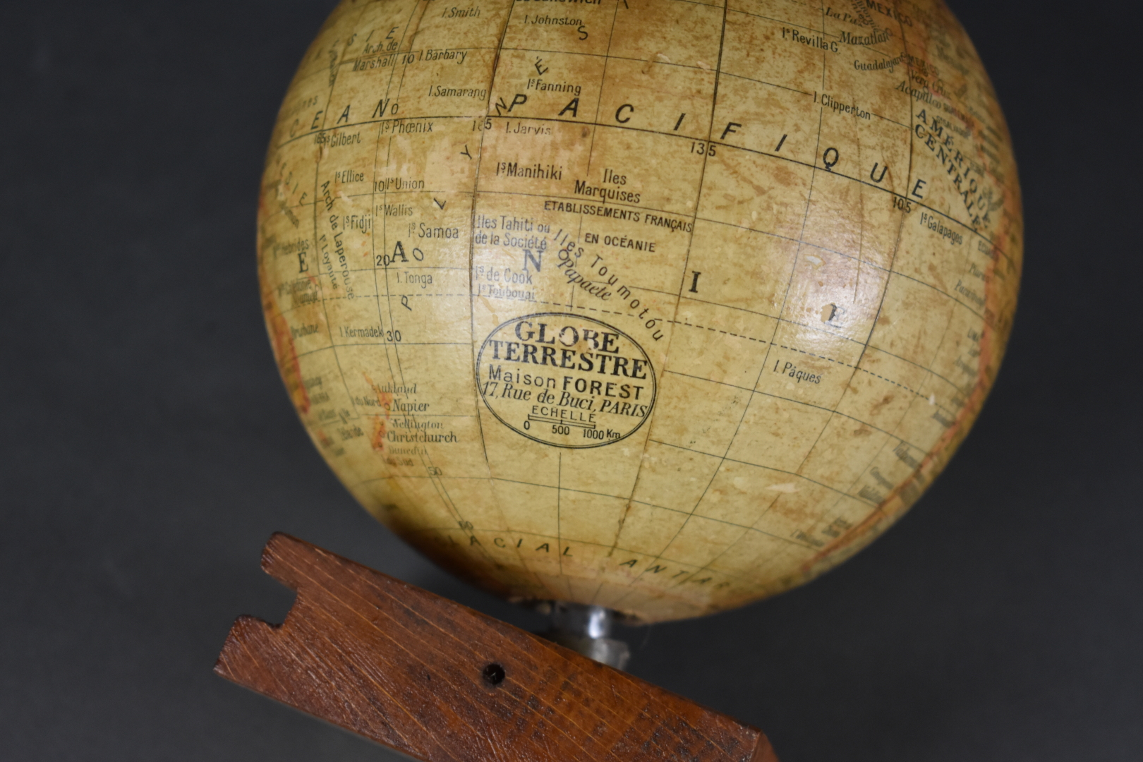 Globe miniature FOREST en carton lithographié échelle 1 cm = 1000 km. Fin du XIXe siècle. Socle de bois raporté.