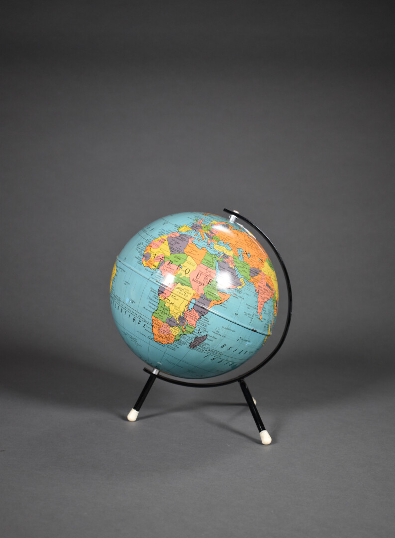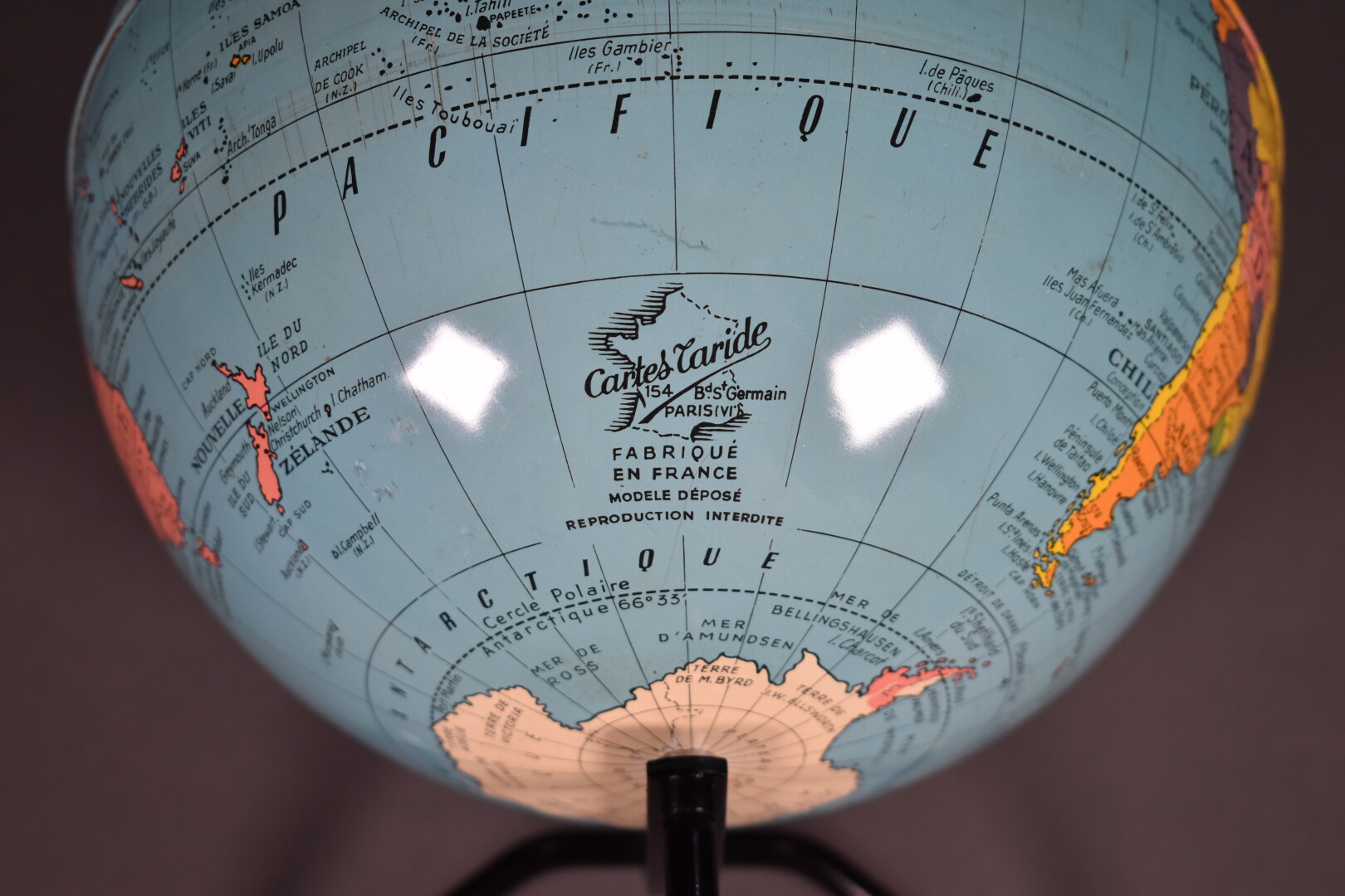 Globe terreste miniature en tôle CARTE TARIDE. Vers 1950. Haut. : 27 cm.