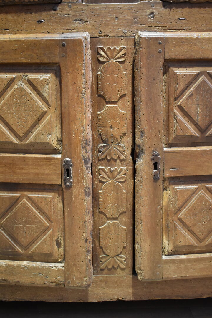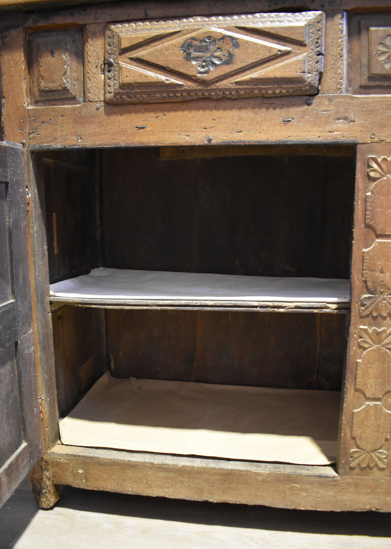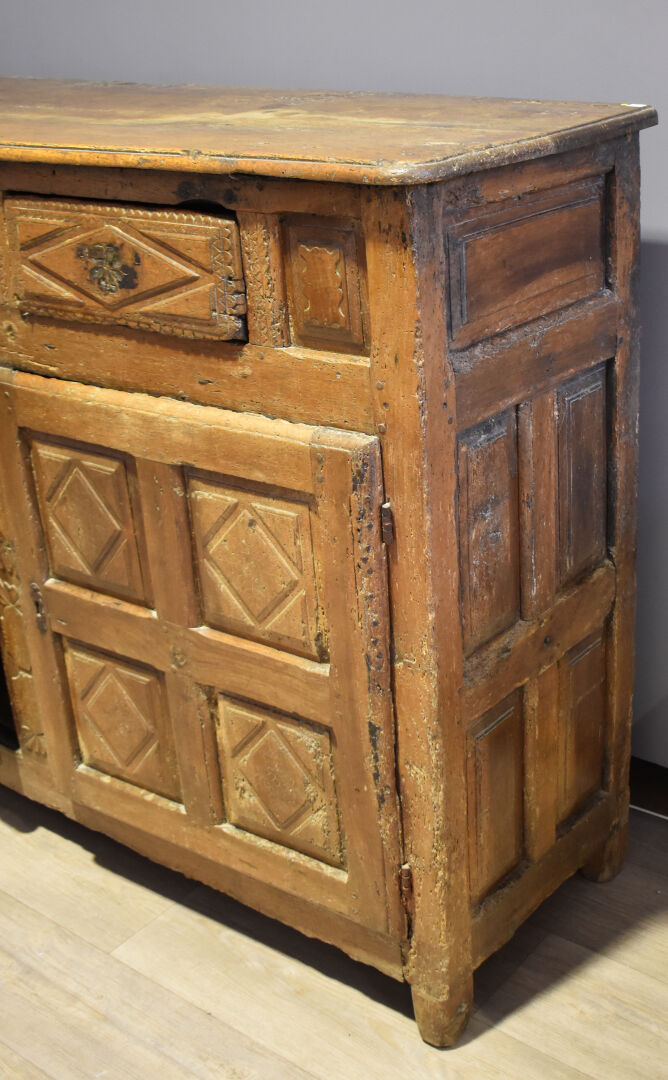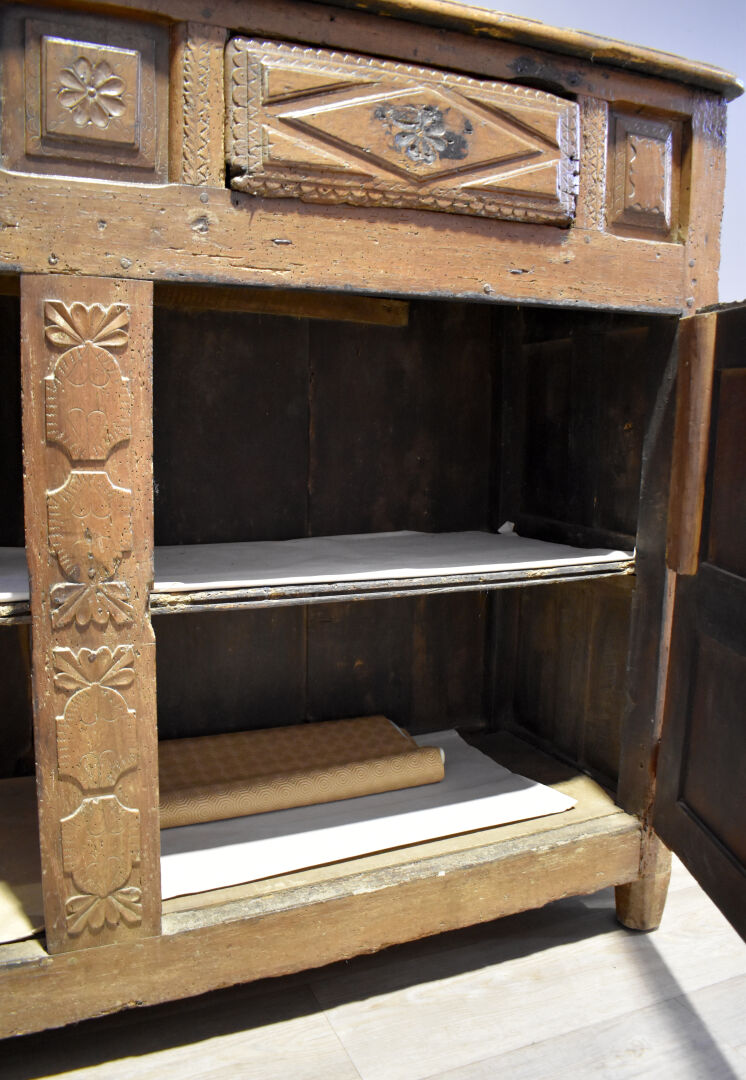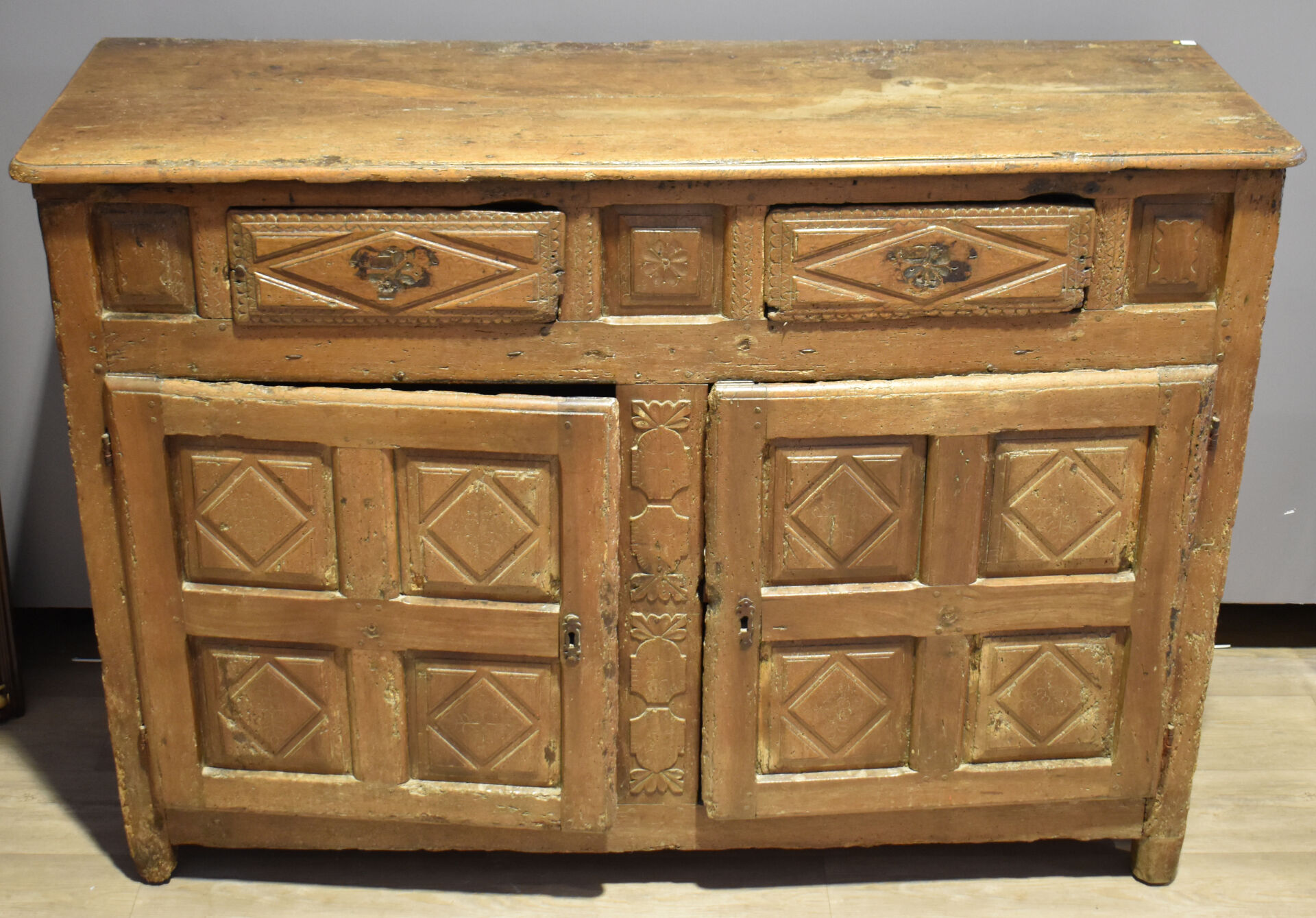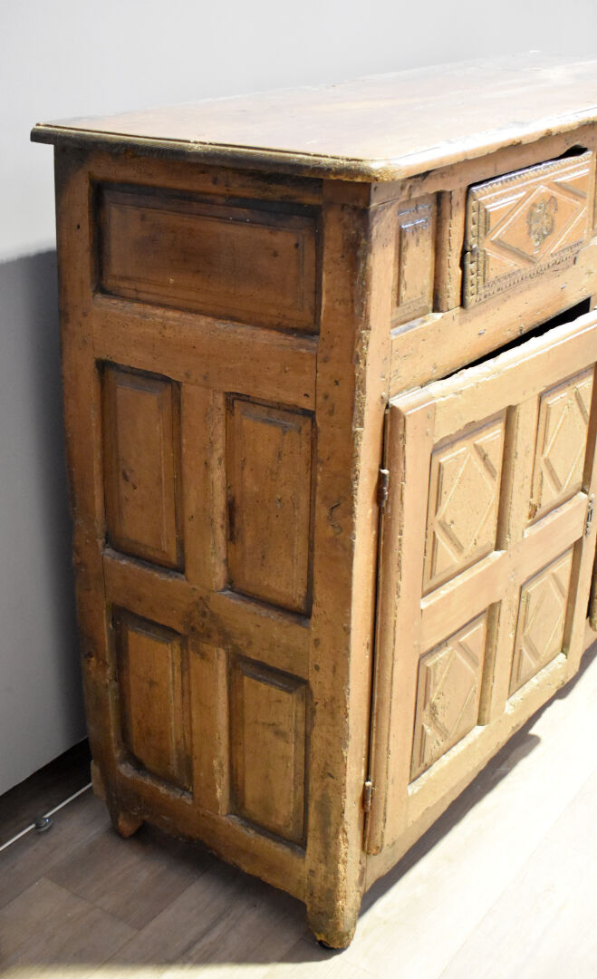 Grand buffet rustique en bois naturel mouluré et panneauté. Il ouvre à deux tiroirs et deux abattants (trous de vers). Composé d’éléments anciens. Haut. : 115 cm – Larg. : 157 cm – Prof. : 50 cm.