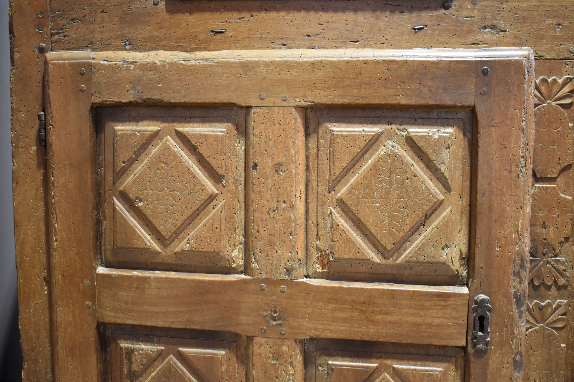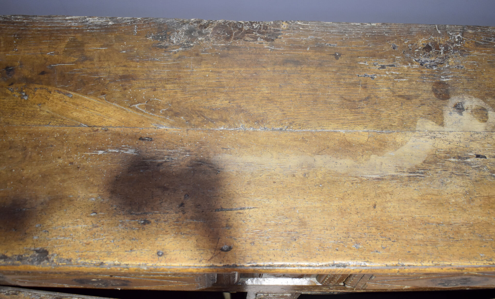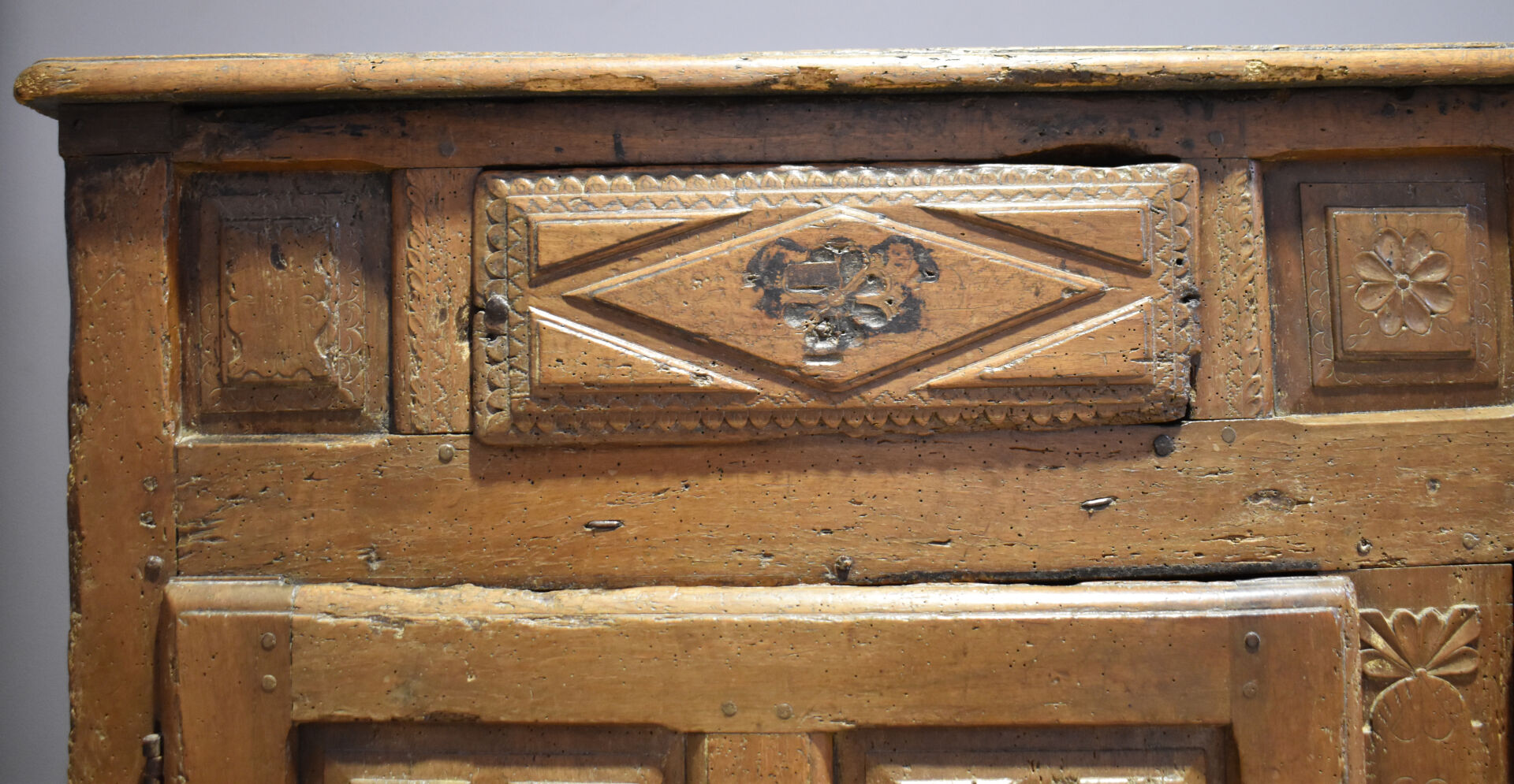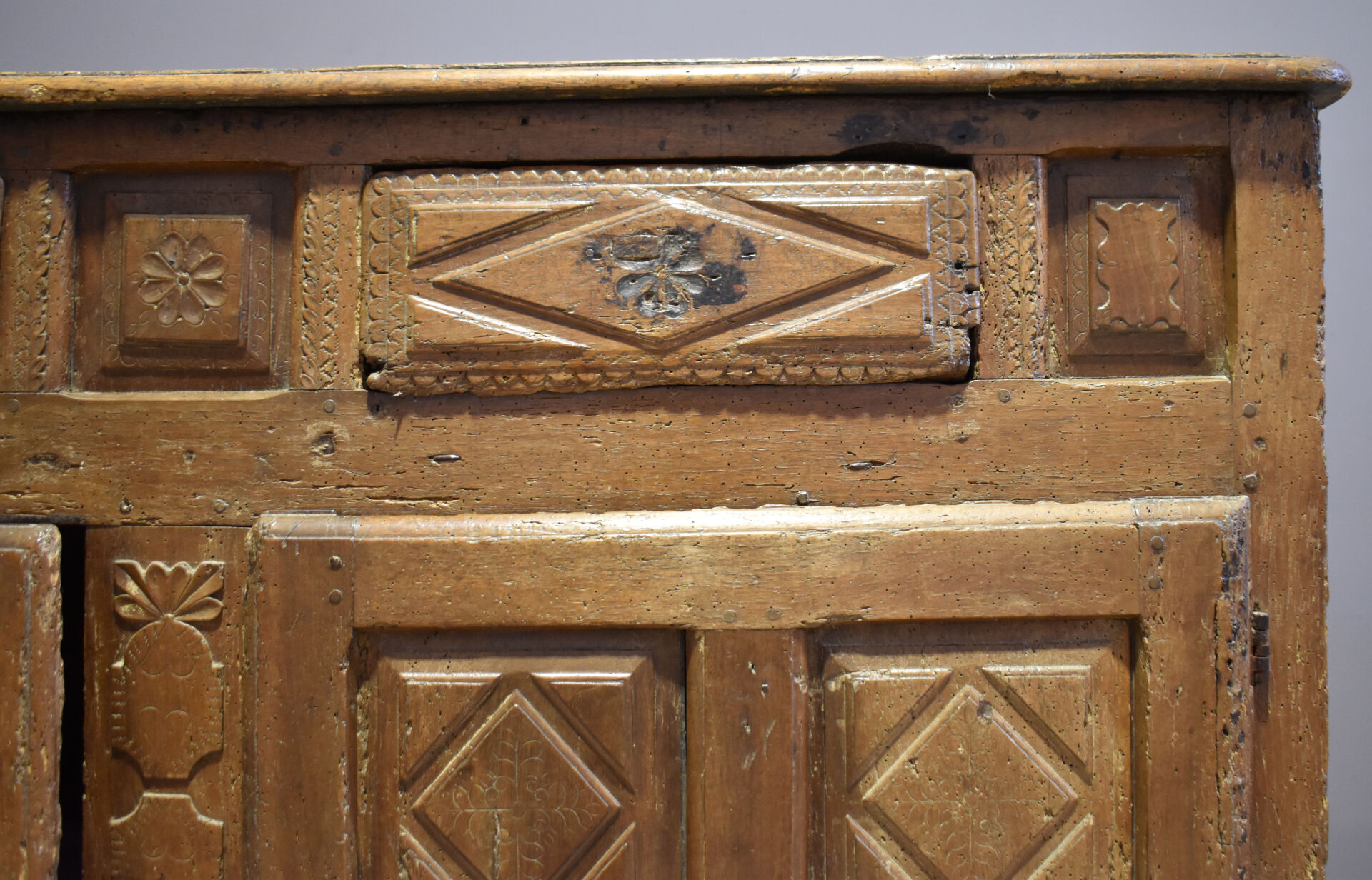 Grand buffet rustique en bois naturel mouluré et panneauté. Il ouvre à deux tiroirs et deux abattants (trous de vers). Composé d’éléments anciens. Haut. : 115 cm – Larg. : 157 cm – Prof. : 50 cm.