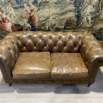 Grand canapé Chesterfield en cuir brun craquelé et patiné. Sur roulettes. XXe siècle. Haut. : 78 cm – Larg. : 215 cm – Prof. : 92 cm.